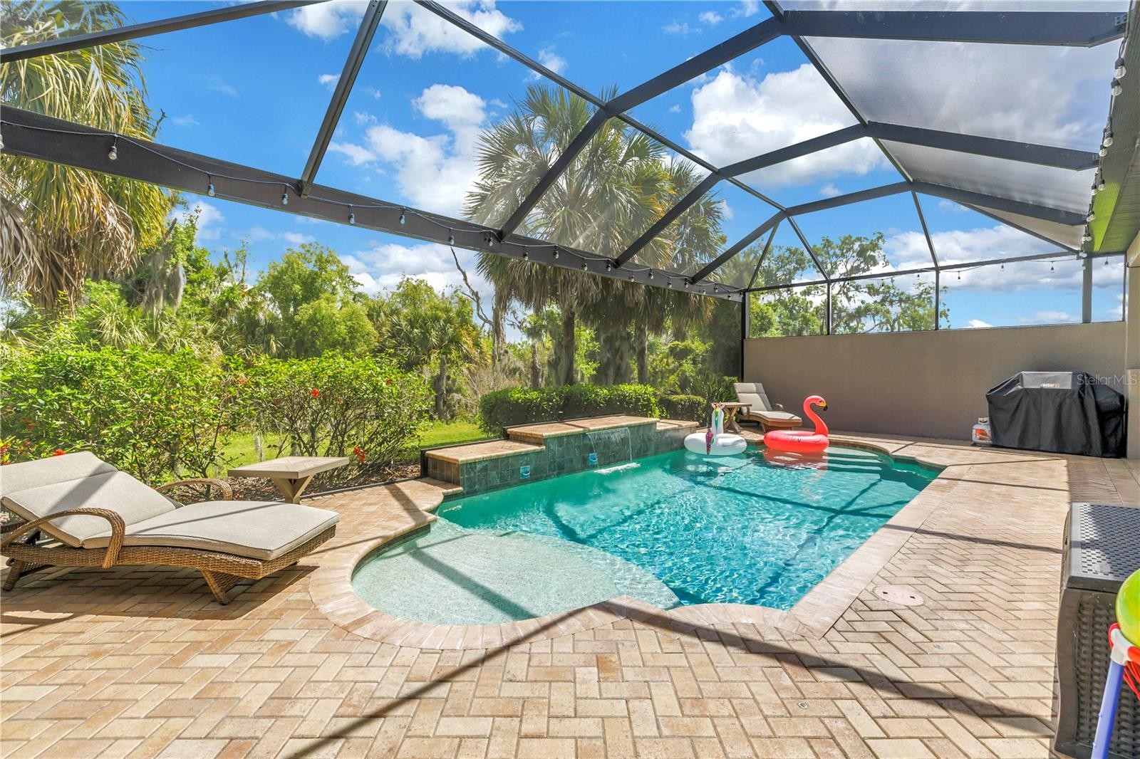 Welcome to 4541 Baltry Court — where refined elegance meets resort-style living in the highly sought-after Rosedale Golf & Country Club. This impeccably appointed 3-bedroom, 3.5-bath residence offers approximately 2,400 square feet of thoughtfully designed living space, showcasing a seamless blend of sophistication and comfort. From the moment you step inside, you are greeted by rich engineered hardwood flooring, elevated finishes, and an abundance of natural light enhanced by impact-rated glass throughout—providing both beauty and peace of mind. The open-concept floor plan is perfectly suited for both everyday living and entertaining, with spacious living and dining areas flowing effortlessly into the heart of the home. The kitchen is well-appointed with quality cabinetry, ample counter space, and a layout that invites gathering. A versatile den with a built-in desk provides the perfect space for a home office, study, or flex room. Retreat to the luxurious primary suite, complete with a spa-inspired ensuite bath and generous closet space, while each additional bedroom features its own private ensuite, offering ultimate comfort and privacy. Select bedrooms also include custom built-in closets, enhancing both function and style. Step outside to your private outdoor oasis—featuring a heated saltwater pool and expansive lanai enclosed by a full panoramic screen enclosure, perfectly framing the tranquil setting of lush, mature tropical landscaping. Designed for both relaxation and entertaining, this space delivers a true resort-style experience with uninterrupted views and ultimate privacy. Enhancing everyday convenience, the home is equipped with smart home integration, allowing control of the pool, heating system, irrigation (sprinklers), and garage—bringing modern efficiency and ease to luxury living. Located within the gates of Rosedale Golf & Country Club, residents enjoy access to an exceptional array of amenities, including a championship golf course, full-service clubhouse, resort-style pool, tennis and pickleball courts, state-of-the-art fitness center, and a vibrant social calendar with dining and events—offering a true country club lifestyle. Conveniently situated near premier shopping, dining, and the world-renowned Gulf Coast beaches, this home delivers both luxury and location. Experience luxury, privacy, and an unparalleled lifestyle—this is Florida living at its finest!