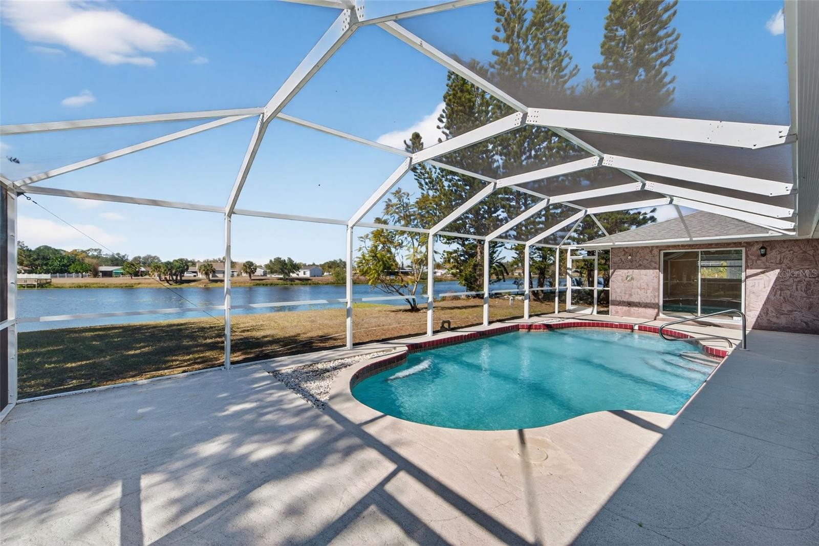 Welcome to your dream waterfront oasis! As you step through the screened front porch entryway your gaze is immediately drawn through the home and out to the inviting pool area with breathtaking views of the Lake and exquisite evening sunsets. This lovely 3-BEDROOM, 2-1/2 BATHS lakefront home offers everything you've been looking for. Whether you’re relaxing in the spacious living areas, cooking in the bright open kitchen, or stepping out to the pool deck, every corner invites you to unwind and enjoy. Inside, the home is bathed in natural light, with a layout designed for both entertaining and everyday living. The features of this house include three generously sized bedrooms, the Primary Bedroom offers a walk-in closet and ensuite bathroom with Double Sink Vanity, Garden Tub and separate Walk-In Shower. The Guest Bathroom has a single sink vanity and tub-shower combination. Additional features include a convenient indoor laundry room and an attached two-car garage. Located approximately 5-6 miles from Cranberry Elementary, Heron Middle, and North Port High Schools, plenty of shopping and restaurants; Don't miss out on this opportunity to embrace the lake lifestyle!