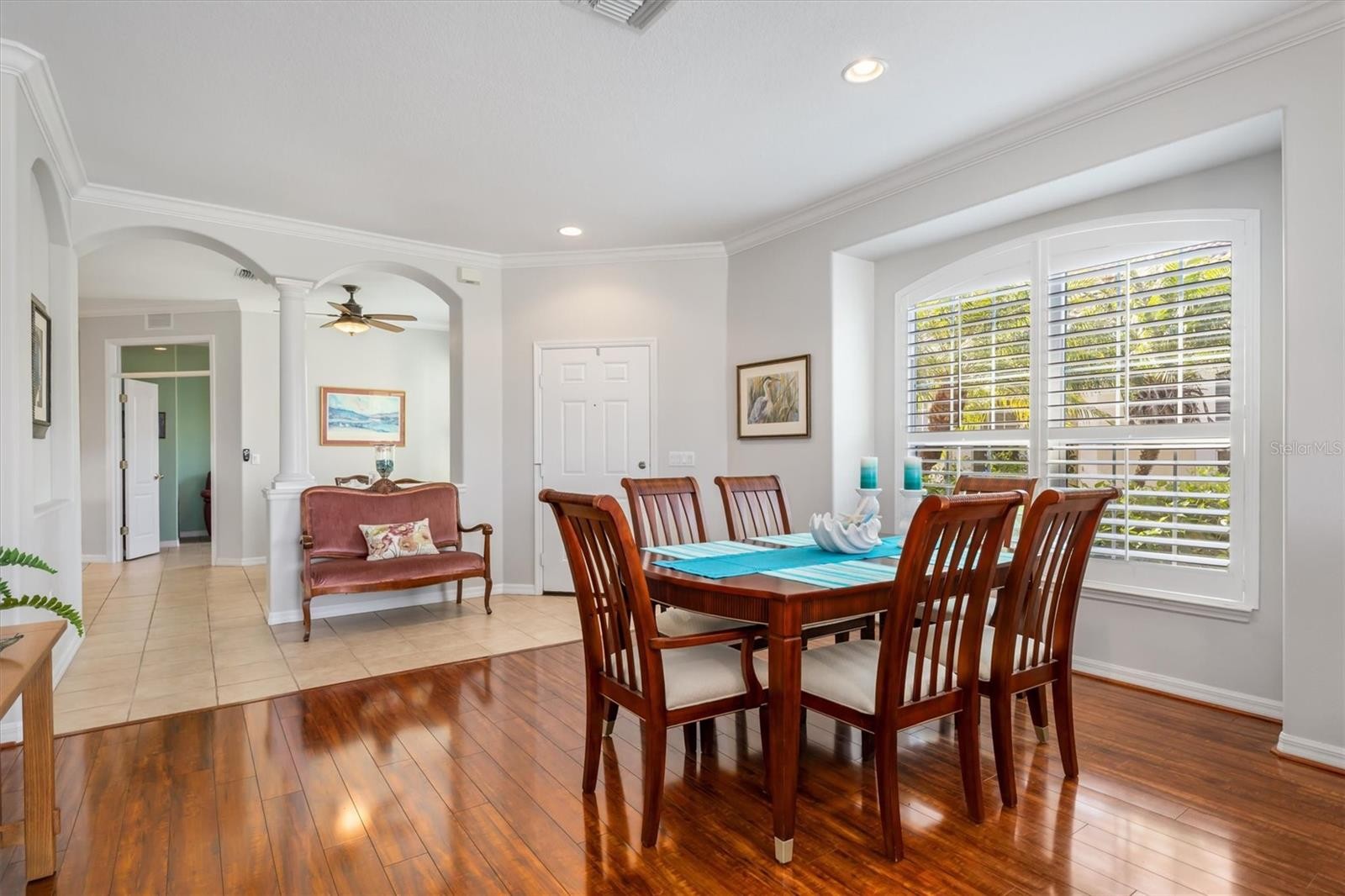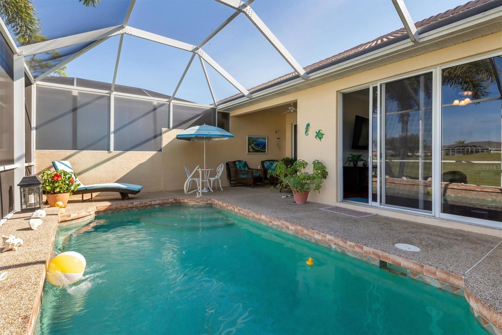 Beautiful TURNKEY villa featuring a heated pool, 2 bedrooms, 2 baths + den, and peaceful views of the 5th hole at Heron Creek Golf & Country Club. This meticulously maintained home shows true pride of ownership and has been thoughtfully updated throughout the years. Step inside and you’ll immediately appreciate the bright, open layout. Natural light fills the home through newer hurricane-impact windows (installed 2020–2022), plantation shutters and elegant crown molding. The spacious living room features triple sliders that open to the screened lanai and sparkling pool, offering stunning views of the golf course and colorful sunsets—perfect for relaxing or entertaining. No CDD fees and not in a flood zone. The split floor plan is ideal for guests or family members, offering privacy and separation for everyone. The den provides a quiet retreat for work, guest room and could easily be converted into a third bedroom if desired. The kitchen is perfect for anyone who loves to cook, featuring stainless steel appliances, gas cooking, solid maple cabinetry with pull-out shelves, under-cabinet lighting, Corian countertops, a tiled backsplash, and a cozy breakfast bar with pendant lighting. A separate dining area creates an inviting space to enjoy meals with family and friends. Pride of ownership shines through the extensive list of improvements, including a new tile roof and gutters (2024), interior paint throughout (2024), new LG washer and dryer (2024), updated lanai screens and ceiling fan (2023), fresh exterior paint (2022), new gas water heater (2021), new stainless steel kitchen sink (2021), new HVAC and furnace (2020), landscape lighting upgrades (2020), and multiple pool updates such as a new gas heater, filter, pump, and housing (2019). Additional enhancements include a garage floor coating (2018), refreshed landscaping with new palms and shrubs, and a new garage door spring (2025). Heron Creek Golf & Country Club offers exceptional amenities, including tennis, dining, a fitness center, 21,000 square foot clubhouse with fine and casual dining, heated resort pool and spa and a 27-hole championship golf course designed by renowned architect Arthur Hills. The course features three unique 9-hole layouts that blend natural beauty, water features, and distinctive elevation changes, providing an enjoyable challenge for golfers of all skill levels. The HOA fee covers landscaping, irrigation, outdoor pest control, cable and internet. The location is hard to beat—centrally situated between the Spring Training facilities of the Tampa Bay Rays, the Atlanta Braves and conveniently located between the Sarasota and Punta Gorda airports. The beautiful Gulf beaches are just a short 30-minute drive away, while the Famous Warm Mineral Springs and Downtown Wellen Park are only minutes from your doorstep. This is truly a must-see home offering the best of Florida living in a sought-after gated golf course community.