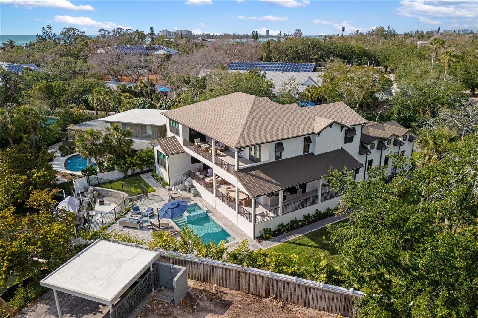 Start living your dream lifestyle on world-famous Siesta Key in this Pham Development custom-built waterfront British West Indies–style home. Located on a quiet street on the north end of the key—close to the beach, Siesta Key Village and Out-of-Door Academy—and just minutes on and off the island, this residence offers island living at its best. Set on a corner canal-front lot, the two-story home features 5 bedrooms, 5 full bathrooms and 1 half bath, with 3,875 square feet under air, a great room floor plan, soaring 22-foot vaulted ceilings, and walls of windows and doors—including large pocket sliders—that bring in abundant natural light and seamlessly connect indoor and outdoor living.