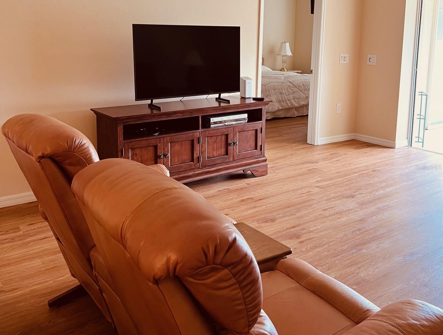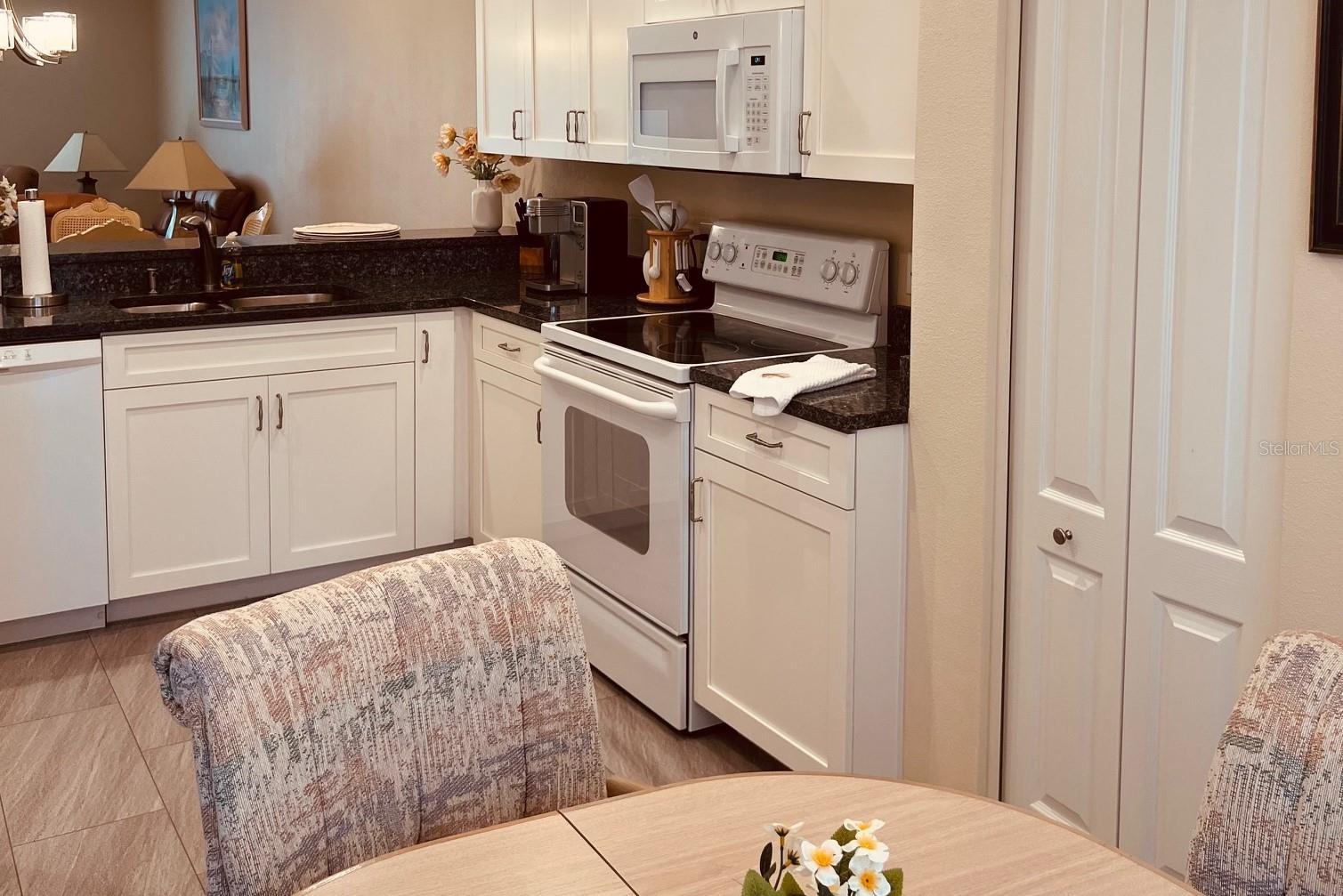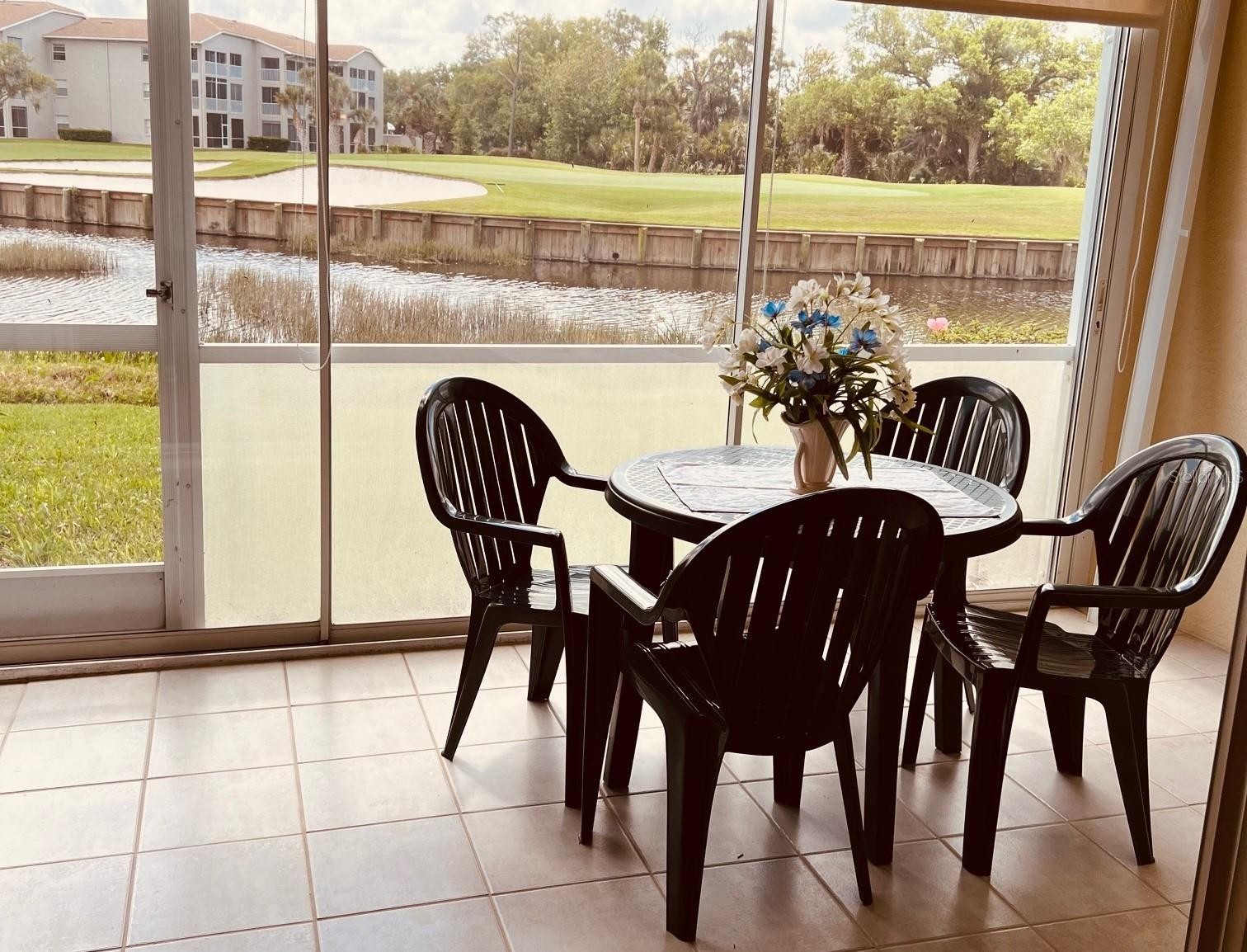AVAILABLE NOVEMBER & DECEMBER 2025 & MAY THRU DECEMBER 2026: Exceptionally well cared for ground floor condo with vinyl flooring throughout, recently updated kitchen with granite counters and tile floors with breakfast bar that is open to the dining and living area, King bed in master bedroom and walk-in closets plus adjoining bathroom with two sinks and walk-in shower, 2nd bedroom has queen bed and is close to the adjoining guest bathroom. The lanai is glassed in and overlooks an amazing view of the lake and golf course, and there is a one-car detached garage. As an added benefit, the community heated pool and tennis court are directly across from the condo. The golf membership transfers for a fee (call the clubhouse for costs). It allows for the use of all amenities including the main pool, the restaurant, the fitness center, lighted tennis courts, participation in all activities that you would expect from a country club, yoga, card games, etc., and the community borders the Legacy walking and biking trail and is less than 20 minutes from the beaches.