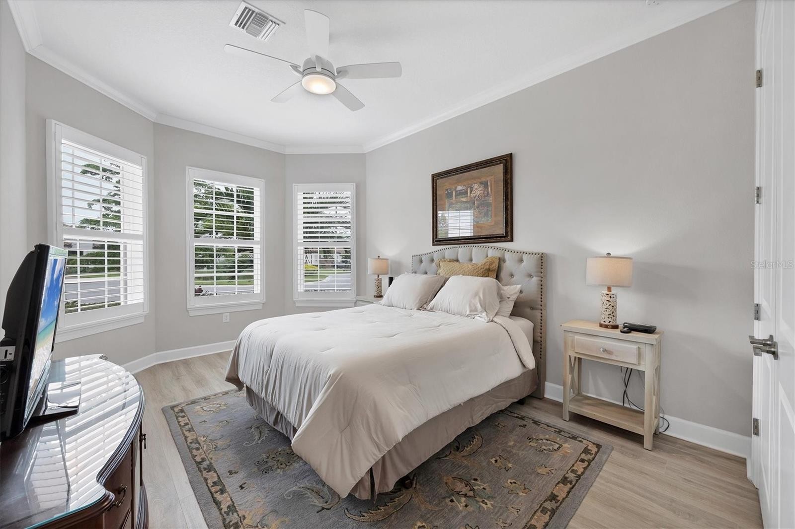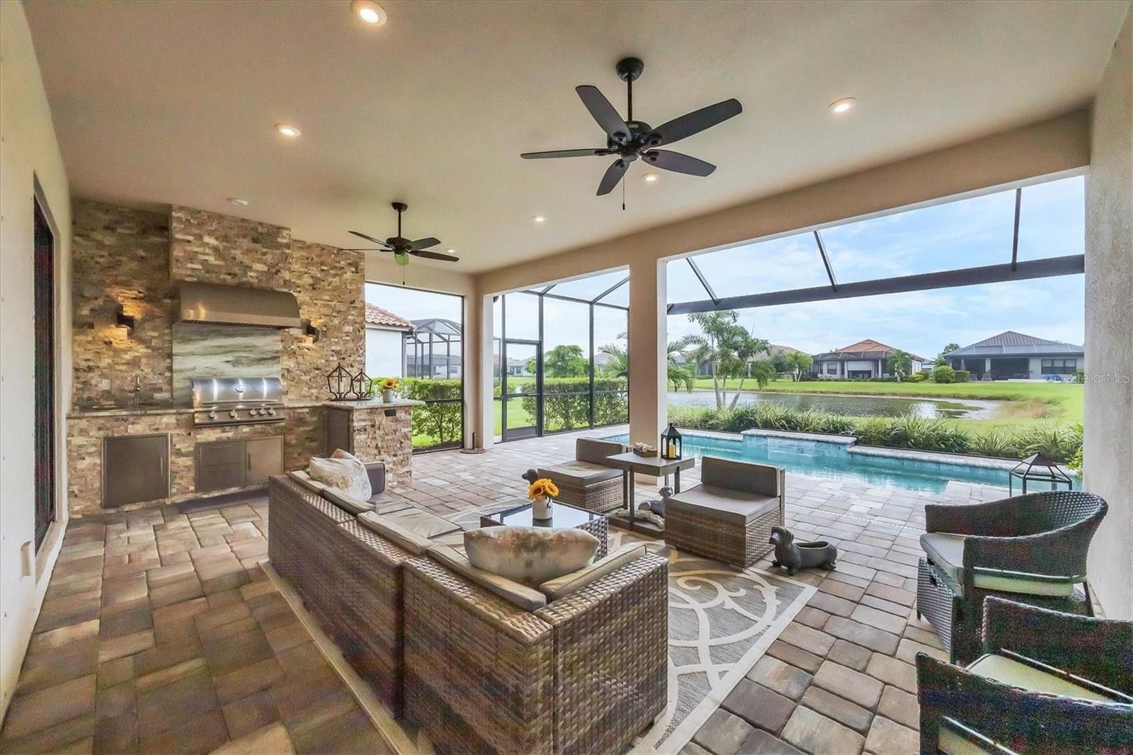 Resort-style living leads at Esplanade at Azario, Lakewood Ranch. Wake up to an amenity rich menu that feels like vacation every day: the spectacular infinity pool with cabanas, a stand-alone Culinary Center for elevated dining, the casual Bahama Bar, an exceptional, fully equipped fitness center, salon & spa services, vibrant social programming, and courts for pickleball, tennis, and bocce—plus pay-as-you-play golf with optional membership, scenic trails, and easy golf-cart access to it all. This is the lifestyle buyers come to Azario for—active, social, and effortless. From that resort experience, come home to a 2022-built 4-bedroom + bonus/den, 3-bath pool home set on a private corner cul-de-sac lot with tranquil water views. An open, light-filled great room plan connects seamlessly to the outdoors through wide sliders onto an extended panoramic-screened lanai, designed for year-round Florida living. The showpiece outdoor kitchen elevates alfresco evenings with marble countertops and a top-of-line Blaze grill, perfectly positioned beside the sparkling freshwater pool. At the heart of the home, the chef’s kitchen pairs elegant quartz surfaces with an oversized island with seating, 42" soft-close cabinetry, designer tile, and 2022 stainless appliances—ideal for casual breakfasts or entertaining friends after a day on the course or courts. A tray-ceiling great room enhances volume and natural light. The private owner’s wing delivers a restful retreat with a spa-style frameless walk in shower, dual vanities, and an expansive custom fitted closet. Thoughtful upgrades continue throughout: every closet features custom built-ins for organized living; custom blinds add a polished finish; and a HOA-compliant gutter system supports low-maintenance ownership. Car enthusiasts and hobbyists will love the 3-car tandem garage, fully finished with a premium 3-layer polyaspartic floor coating engineered for superior durability and longevity compared to traditional epoxy and extensive custom cabinetry that maximizes storage while keeping the space looking clean and refined. Additional highlights include flexible spaces for today’s needs: four true bedrooms (one easily doubles as a home office) plus a separate bonus/den, giving you options for a second office, media room, or fitness studio. Quality finishes, fresh 2022 systems, and a water-view setting make everyday living feel elevated and effortless. Why Azario: beyond the headline amenities—Culinary Center fine dining, Bahama Bar, first-class fitness center, multiple racket courts, bocce, spa/salon, pay-as-you-play golf, community and satellite pools—residents enjoy an active calendar and a welcoming, resort atmosphere that’s hard to find and easy to love. All of it in the nation’s top-selling master-planned community, Lakewood Ranch, close to beaches, restaurants, shopping, and A-rated conveniences. Move-in-ready luxury in Azario’s signature resort community. Come see how beautifully the home, water view, and lifestyle come together here. Non Golf Deeded.