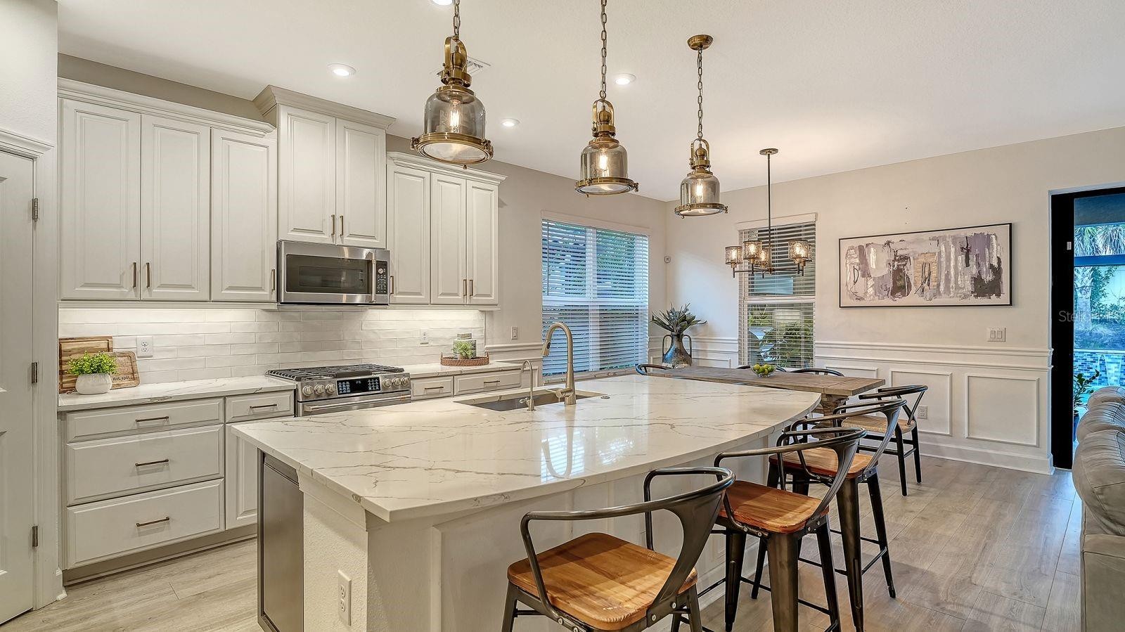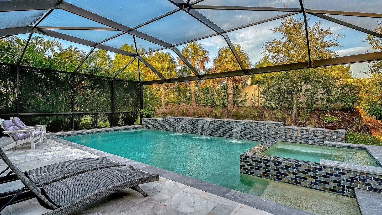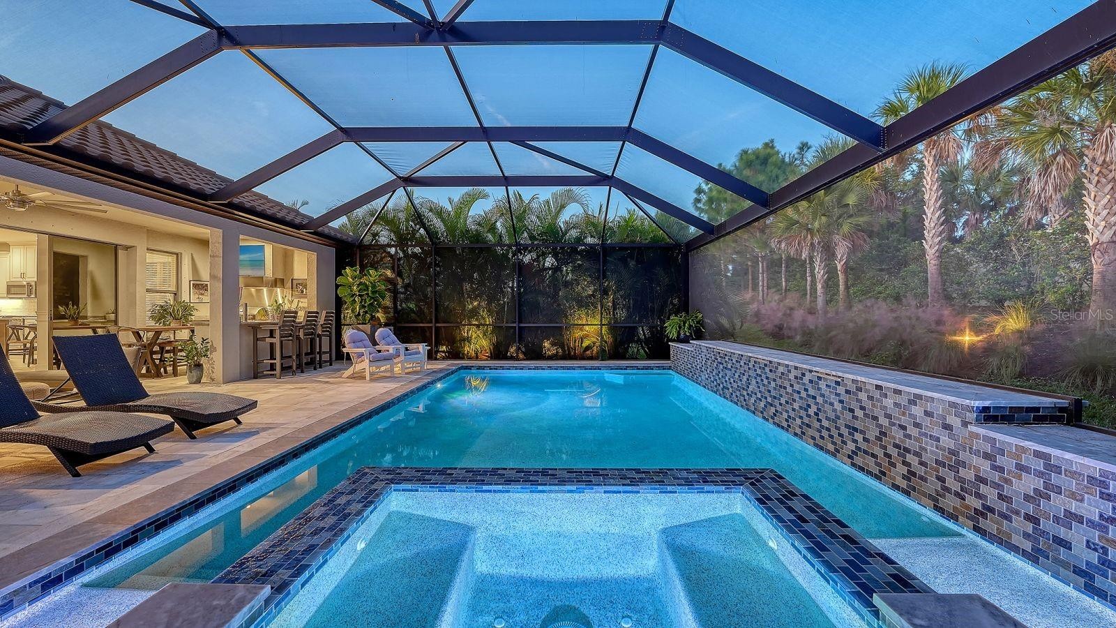 Welcome to resort-style living in Esplanade Azario at Lakewood Ranch. This stunning example of what Florida living is all about features 3-bedrooms, den, 3 en-suite full baths, powder room, gas-heated saltwater pool & spa, outdoor kitchen, 2-car garage with an extra long and wide driveway, and countless upgrades. A stunning, extended foyer with crown molding wood trim, and a glass front door with sidelight creates an elegant first impression, leading into the main living spaces with custom wood trim throughout, luxury plank vinyl flooring, tray ceilings, and beams in the living room tray ceiling. No mandatory golf membership! The kitchen blends style and function with wood cabinetry, quartz countertops, a large island, tile backsplash, walk-in closet pantry, ample drawer space, GE Café stainless appliances, a gas range, upgraded pendants, and a chandelier—plus a water filtration system. Fully pocketing sliding glass doors open to a ClearView panoramic lanai with sandblasted marble pavers and an outdoor kitchen featuring a gas grill, range hood, bar tap, and fridge—perfect for entertaining. Enjoy the gas-heated saltwater pool & spa with three waterfall features and iridescent mosaic tile accents, plus a top-water solar robot, landscape lighting, sprinkler system, and a widened paver driveway. Added privacy comes with no neighbors behind and to one side. Additional upgrades include custom built-in shelving and cabinets with lighting on the TV wall, a custom built-in desk and storage in the office, a security system, exterior cameras monitored by Alert 360, laundry room storage cabinets with quartz countertops and sink, overhead garage storage, and an Aroma360 hotel scent system throughout the home. Located in the illustrious Esplanade at Azario of Lakewood Ranch, this property offers the ultimate in privacy and exclusivity, yet you don’t need to leave the gates in order to enjoy a culinary dining experience, casual poolside drinks, or any of the numerous social and active amenities Azario has to offer. COMMUNITY FEATURES: 18-Hole Championship Golf Course (not deeded to property), Pro Shop & Bunker Bar, Aqua Driving Range, Full-Time Activities Director, Resort-Style Pool & Poolside Bahama Bar, Spa/Wellness Center, Culinary Center w/ Teaching Kitchen, Barrel House Bistro, Olive & Vine Pizza Kitchen, State-of-the-Art Fitness Center, Sports Courts, Clubhouse, 16 Pickleball Courts, 6 Har-Tru Tennis, Bocce Ball, Flex Space for Gaming, Meetings & Activity Center, Walking Trails, Dog Park, Community Garden & Fire Pit.