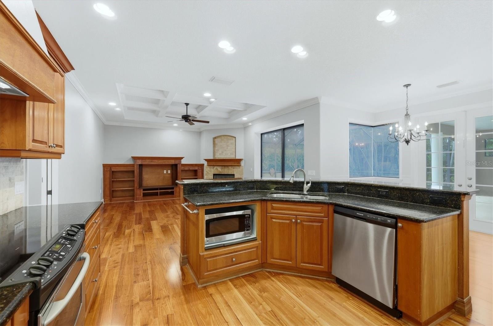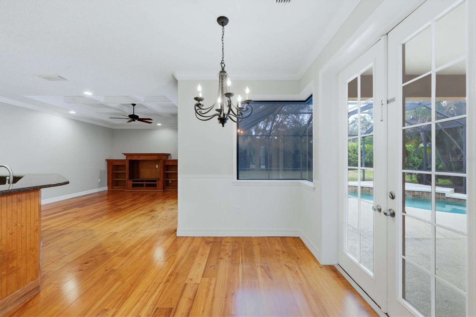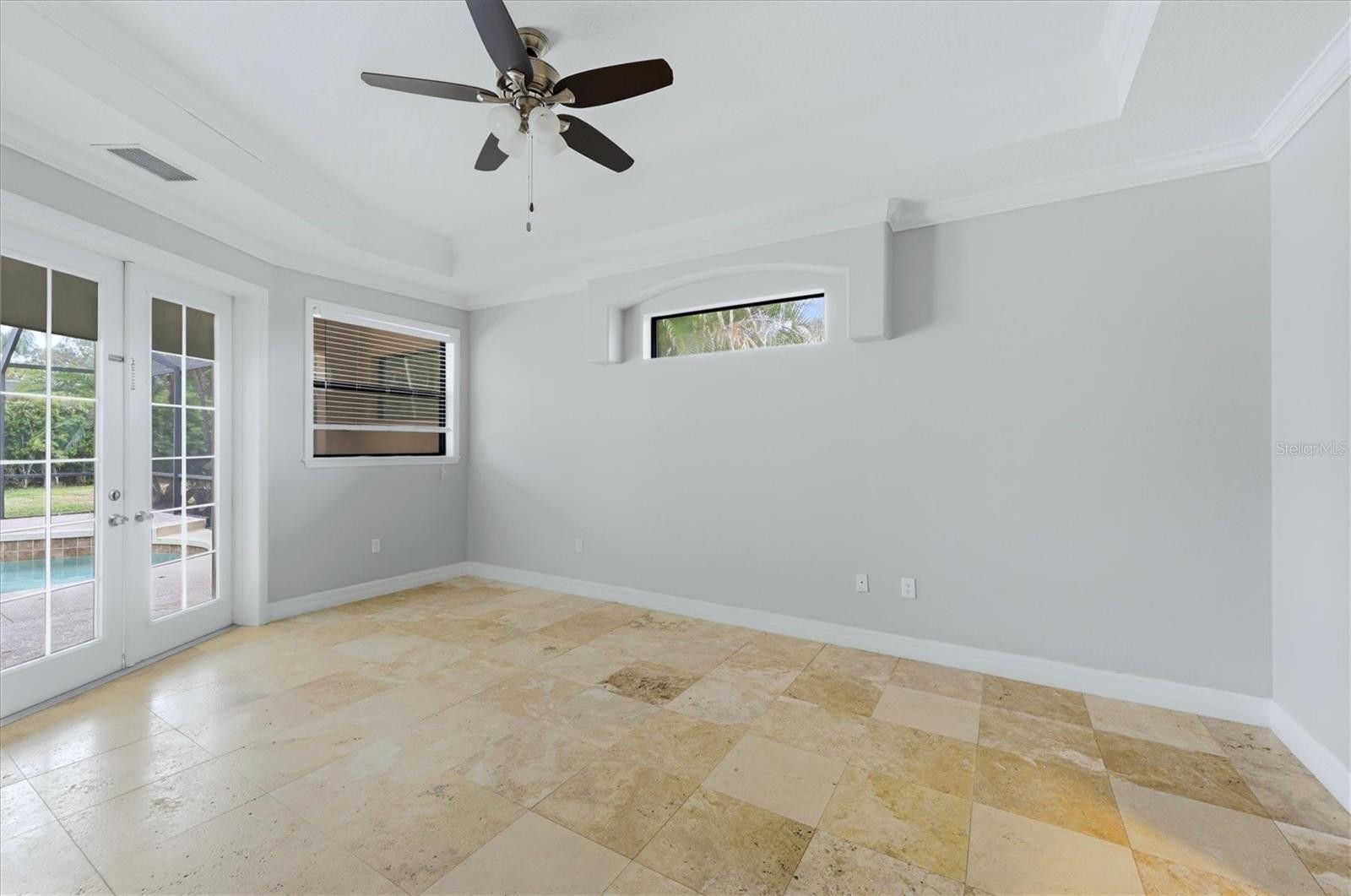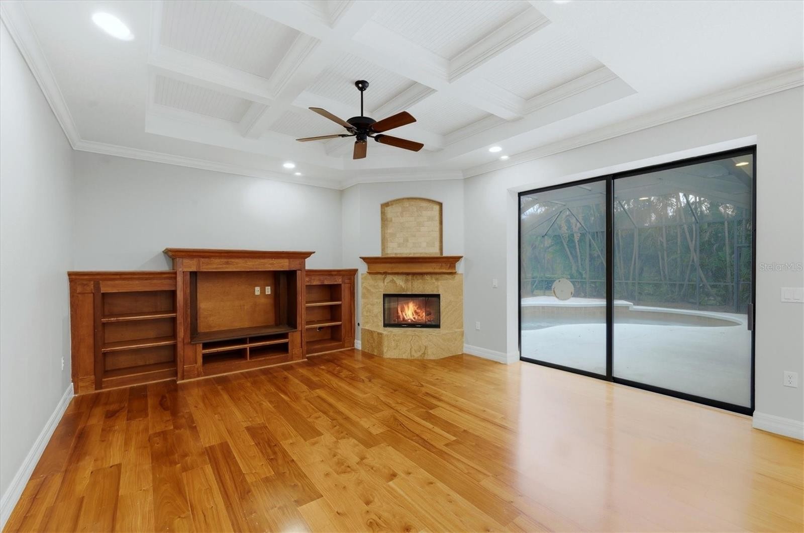 Nestled in the sought-after Secluded Oaks, a charming small enclave, this beautifully maintained 2,116 sq. ft. pool home offers the perfect blend of comfort and elegance. Featuring 3 spacious bedrooms, 2 full baths, and a versatile den, the home also includes formal living and dining rooms along with a generous family room highlighted by a cozy gas fireplace. The open floorplan is enhanced by high and tray ceilings, crown molding, and decorative touches throughout. Custom cherry wood cabinetry and travertine tile flooring elevate the main living areas with timeless style. Sliding doors from the family room, living room, and primary bedroom seamlessly open to the inviting pool area, creating an ideal setting for indoor-outdoor living and entertaining.