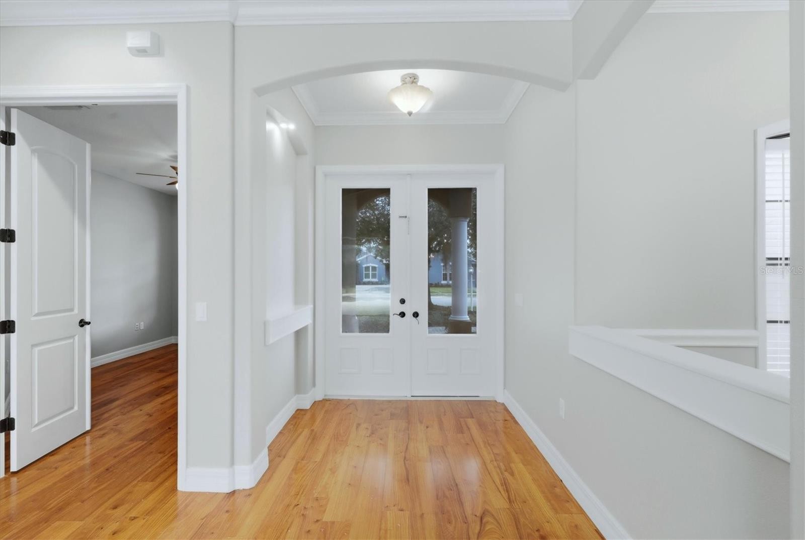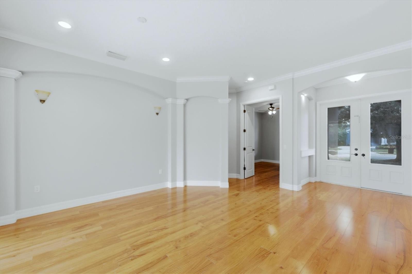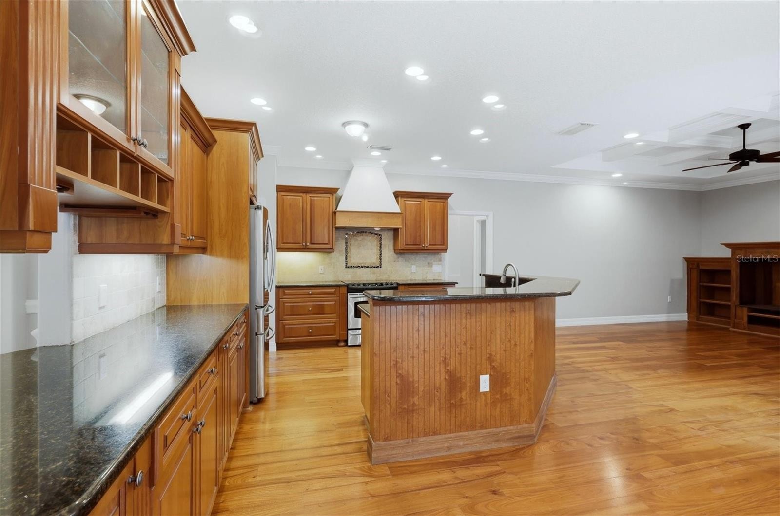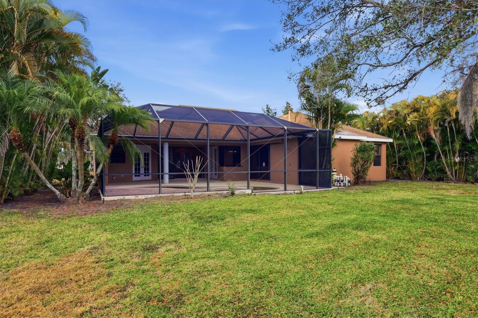 Nestled in the sought-after Secluded Oaks, a charming small enclave, this beautifully maintained 2,116 sq. ft. pool home offers the perfect blend of comfort and elegance. Featuring 3 spacious bedrooms, 2 full baths, and a versatile den, the home also includes formal living and dining rooms along with a generous family room highlighted by a cozy gas fireplace. The open floorplan is enhanced by high and tray ceilings, crown molding, and decorative touches throughout. Custom cherry wood cabinetry and travertine tile flooring elevate the main living areas with timeless style. Sliding doors from the family room, living room, and primary bedroom seamlessly open to the inviting pool area, creating an ideal setting for indoor-outdoor living and entertaining.