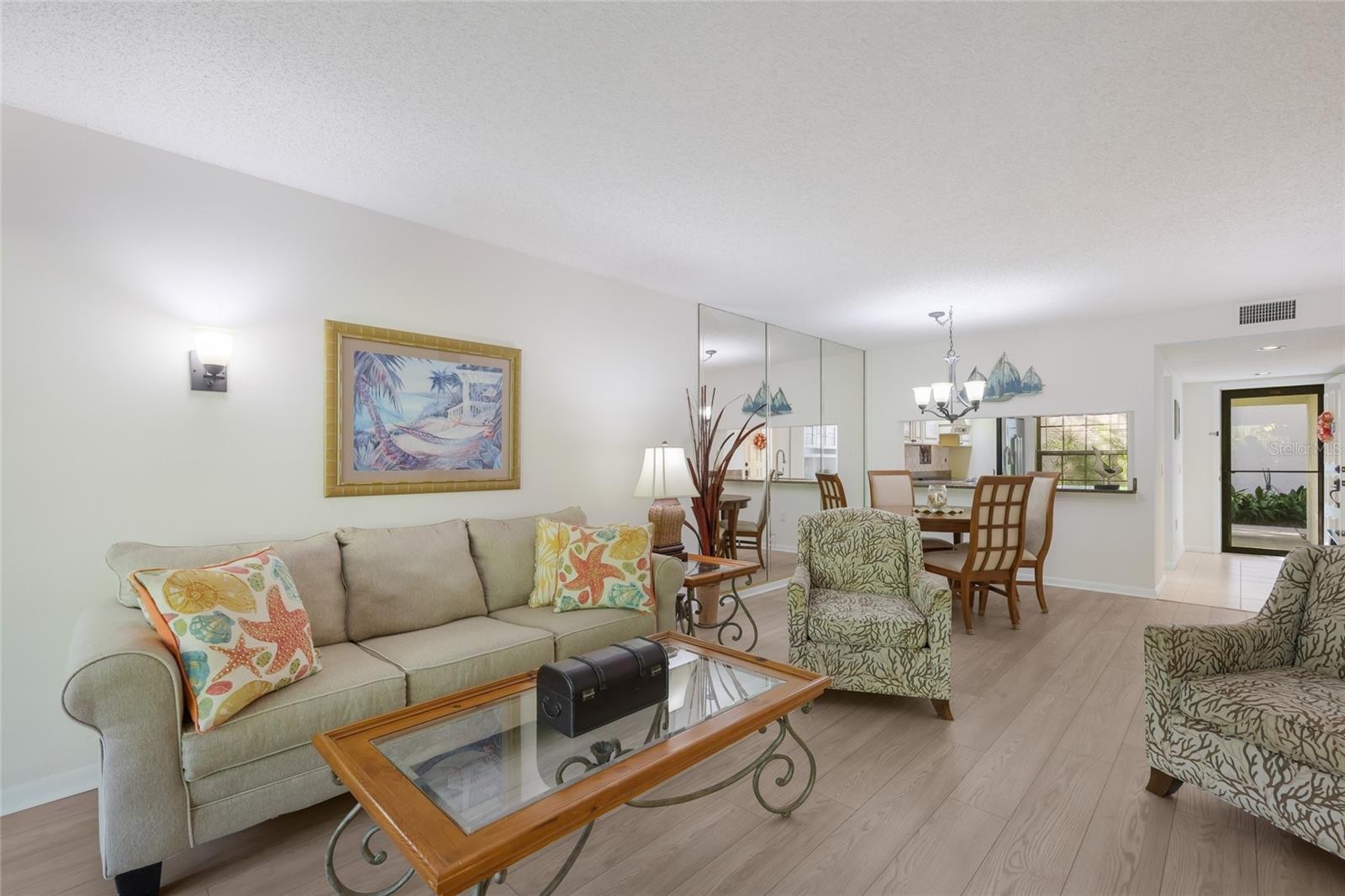 WELCOME HOME to WINSLOW BEACON, a small enclave condominium community tucked away in the Meadows Golf & Country Club. This 2 bedroom, 2 bathroom ground floor unit has been tastefully updated and lovingly cared for. The kitchen features wood cabinetry, granite countertops, tile backsplash, and under-cabinet lighting. The pass-thru bar opens to the dining and living area, beyond which is the glass-enclosed lanai, with tile floors and beautiful views. The spacious master bedroom and guest bedroom are located on opposite ends of the home, allowing for extra privacy. The master bedroom boasts crown molding, walk-in closet with custom built-ins and sliding glass doors to the lanai. The second bedroom also has crown molding and plenty of closet space. The dishwasher and range were new in 2022, water heater and garbage disposal in 2023, and the 2-ton Trane A/C with heat pump and UV air sterilization was new in 2024, along with the upgraded luxury engineered hardwood floors in the living area and bedrooms. In 2025, the bathrooms were remodeled, tub and showers were porcelain reglazed, and all walls, doors and trim were freshly painted. The furniture is all included and everything is clean, fresh and up to date! Just bring your clothes and move right in!! This lovely condominium community has been well-maintained and completely renovated, including new paint and roofs on the buildings, the parking lots recoated, and the pool has been resurfaced and tiled, along with the decking. The pool bathrooms have also been upgraded. The pool is just steps from your back door! The community is quiet and private with natural views. The Meadows is an award winning master planned community utilizing the natural landscape to create over 14 miles of trails, and 80 lakes with abundant wildlife. The optional Meadows Country Club offers three 18 hole golf courses, 16 lighted tennis/ pickleball courts, a jr. Olympic swimming pool with spa, and a fitness center.