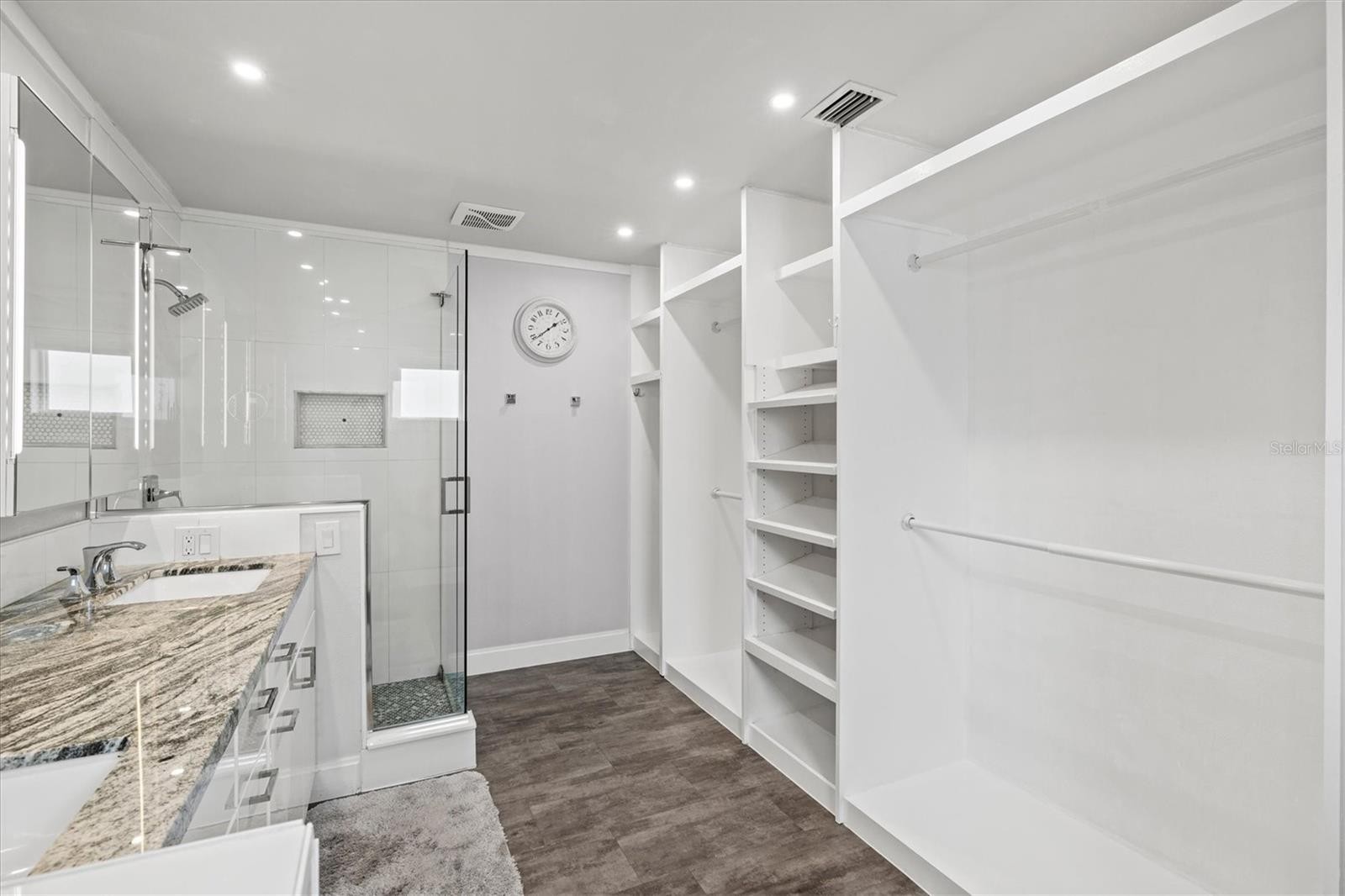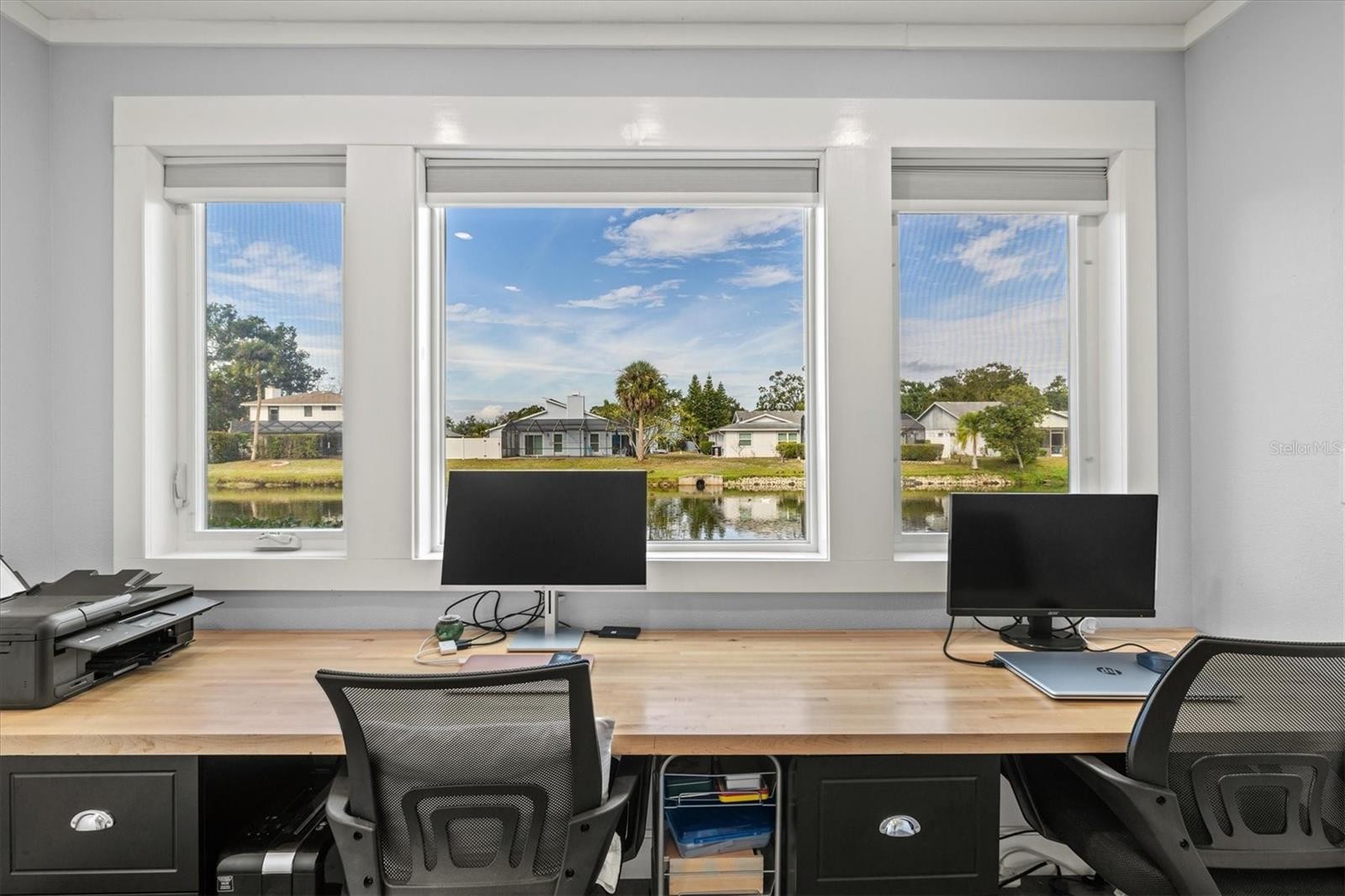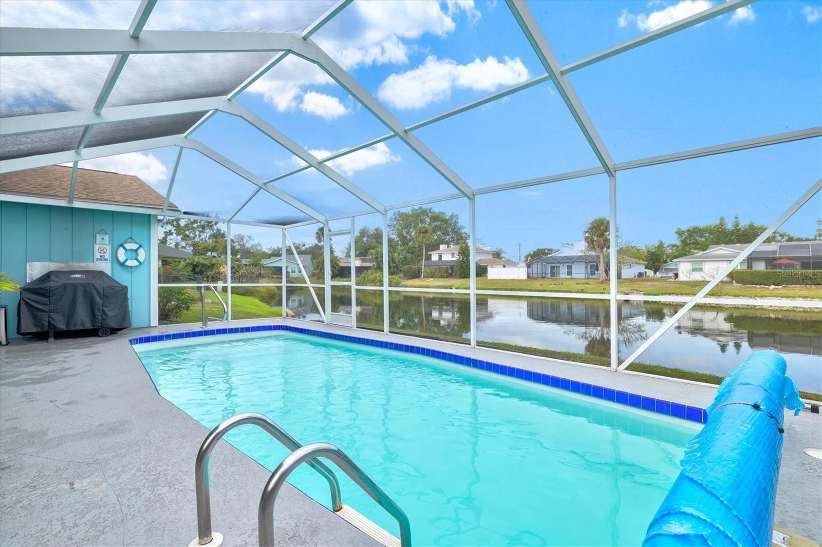 Everything has been done for you, top to bottom, in this completely renovated 3 bedroom, 2 bath, single-story home in Glenbrooke. The kitchen is a chef’s dream with European style high-gloss cabinetry, five-burner propane cooktop stove with pot filler and commercial grade range hood, two electric convection wall ovens, built-in drawer-style microwave and in-kitchen pantries with sliding baskets. You’ll have plenty of space to stock up and prep meals for the week with the full size, side-by-side refrigerator and freezer. Soft close drawers and quartz countertops put the finishing touches on this culinary haven. In the family room, a propane fireplace adds a cozy ambiance on cool evenings. Tall windows bring in plenty of natural light and provide water views. The dining area is thoughtfully designed with access to serving drawers at the breakfast bar, vaulted ceiling, and french doors leading to the pool enclosure and outdoor living space. The primary suite also has direct access to the pool enclosure and features and ensuite bath with marble vanity and dual sinks at counter height, backlit mirrors and frameless glass shower. Two guest rooms and a full bath on the opposite side of the home provide privacy for friends and family (one room currently used as an office). The outdoor space is pleasant for entertaining, with solar heated pool plus solar cover, and a view of the pond, and covered seating area. A propane line is available to connect to a grill. This home was fully renovated to the studs in 2019 as a forever home (not a flip) and brought to hurricane standards including reinforced walls, roof, hurricane impact windows and doors. Home is in the X flood zone and does not require flood insurance. Side yard is fenced and gated and includes a 8 x12 storage shed with shelves. This area can be used as a dog run. Garage is fully insulated and has remote controlled heat/cool split system.