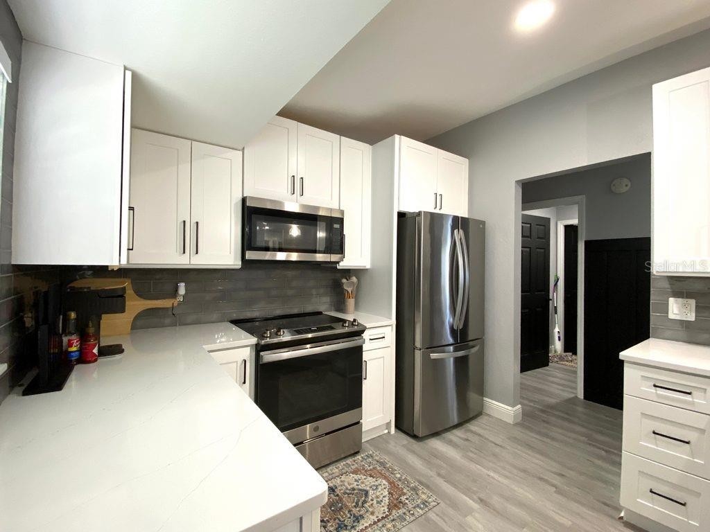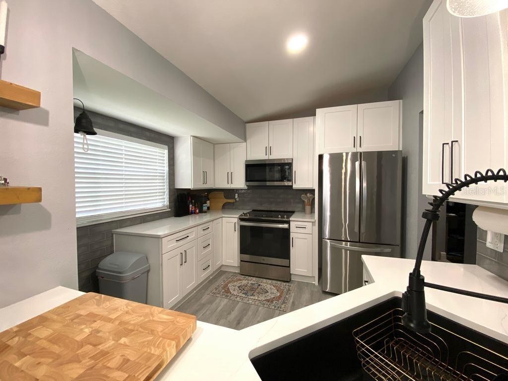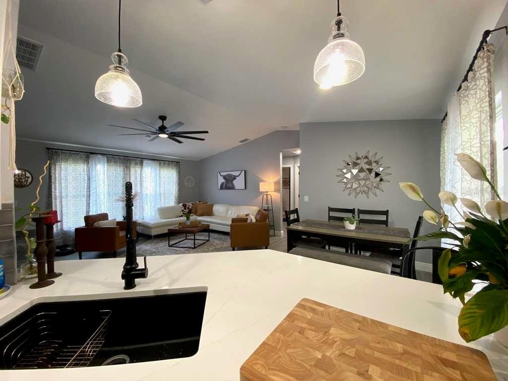 Perfect starter home, investment property or your winter retreat! This freshly painted 3-bedroom, 2- bath home with recently updated kitchen and bathrooms features luxury vinyl flooring throughout, Vaulted ceilings, inside laundry room & large open floor plan. Kitchen is perfect for entertaining & has a big quartz breakfast countertop bar, 42in. wood shaker cabinets & stainless-steel fridge & Range. Desirable split bedroom floor plan. Large fenced back yard with mature oaks. 2021 roof & 2024 AC per owner. Not in a Flood Zone (flood zone X), Close to 1-75, Shopping Centers, Restaurants & Parks. This home has endless potential for any buyer. Come enjoy the Florida Lifestyle!