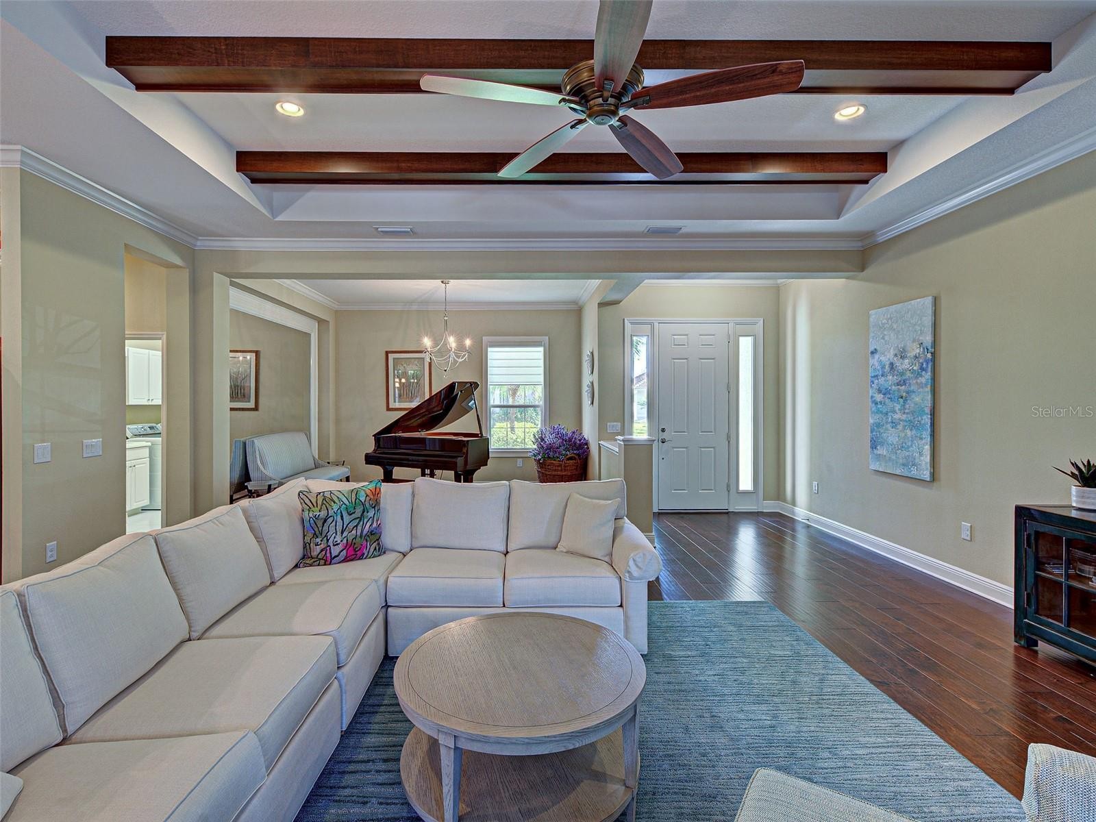 This is the home you have been waiting for and yes, you can have it all! This gorgeous Neal built home offers 3 BEDROOMS + OFFICE, 3 BATHROOMS, a 3 CAR GARAGE (extended to fit a truck) and $120,000 in fabulous upgrades. Located in the established and highly desirable Sawgrass community, just minutes away from Venice's charming downtown, beautiful beaches, dining and shopping, this stunning home has an open floorplan, high ceilings and an extended lanai with wonderful gas fireplace- a perfect place to unwind. No expense was spared: home has engineered hardwood floors and plantation shutters throughout, elegant crown molding, tray ceilings, high end window treatments and 4 French doors for easy lanai access - the list goes on and on (ask for feature sheet). The spacious great room with beautiful beam ceiling effortlessly flows to the kitchen, dining room and large lanai- making entertaining a delight. Chefs will love the GOURMET KITCHEN which features lovely solid wood cabinets with pullouts, granite countertops, upgraded stainless steel appliances (to include a GAS STOVE), large island, soft close drawers, undercabinet lighting and pantry. You will spend all of your time enjoying the fabulous Florida weather in the spacious, screened outdoor living area, perfect for grilling, dining alfresco or relaxing in front of the stone fireplace. The primary suite is a true sanctuary and offers 2 walk-in closets with custom shelving and an ensuite bathroom with double vanities, soaker tub, large tiled, walk in shower and separate WC. Guests have plenty of privacy thanks to the split floorplan, will appreciate the 2 additional full bathrooms and the large den has custom built cabinets and could easily be a home office or 4th bedroom. More to love: home is NOT IN A FLOOD ZONE, HAS FULL HOME HURRICANE PROTECTION, to include 4 double hurricane impact French doors and hurricane rated garage door. Perfectly situated on an over-sized lot (over 1/4 acre) with a peekaboo pond view, pavers enhance the lanai, driveway and entryway while mature landscaping adds to the home's curb appeal. Sawgrass is a gated, friendly community set upon 54 acres of lakes and preserves set amidst Waterford Golf course (golf membership optional) with NO CDD and LOW HOA fees. Socialize in the clubhouse, make friends by the large resort style heated pool and stay toned in the fitness facility or on the pickleball courts. Ideal location: only 4 short miles to Venice Island with its delicious dining, fun shopping and many cultural events and close to all the conveniences you could ever want. Don’t miss this rare opportunity for luxury, location, and lifestyle - this spectacular home truly has it all! Be sure to ask for the feature sheet.