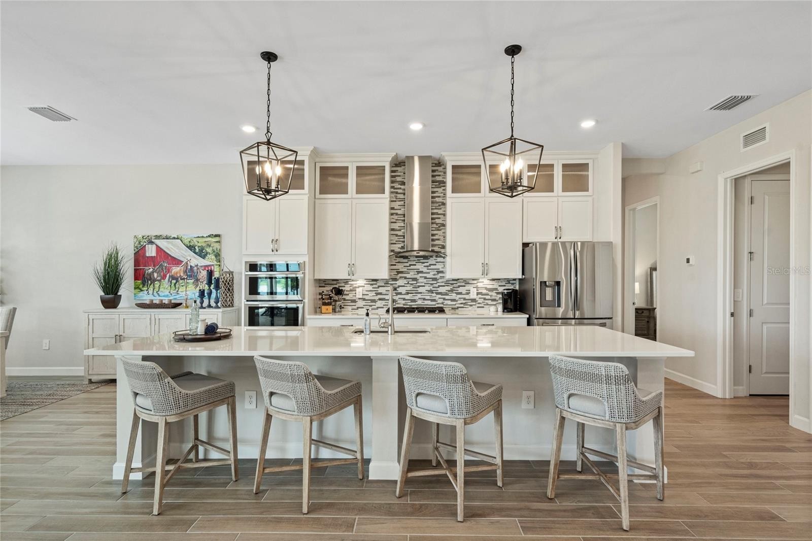 ***MULTIPLE OFFERS RECEIVED, Highest and Best due by 5pm 10/24/25*** Welcome to this sought after model, the Sunset, in Lakewood Ranch’s highly coveted Lorraine Lakes. This fantastic, gated community with resort style amenities makes coming home feel like a vacation. This newly built home in 2022 has already been upgraded with many custom features making this home stand out above the rest. As you enter, you are greeted by double front doors and a spacious dramatic 12 ft foyer, followed by the impressive open concept floor plan of this popular Sunset model. The great room with tray ceiling and newly installed custom electric fireplace feature wall in 2024 is the perfect space to relax and unwind. The gorgeous kitchen with massive quartz island features some of the home's most impressive upgrades that include cabinets with custom edged glass cabinet tops and built in lighting. The cabinetry has been enhanced with reinforced expanded shelving, high-end hardware, and soft closing features. The appliances have all been replaced and upgraded to a higher standard than supplied by the builder. A stylish and sleek range hood and backsplash complete the fantastic kitchen upgrades. Elegant and timeless upgraded lighting on dimmer switches is featured throughout the home, adding both style and value. There are some things you can’t put a price on, and the spectacular sunset views from this oversized screened in lanai with pool and spa is one of them. This spectacular western exposure pool home with unobstructed 160-degree water views from every angle is sure to be a favorite feature. The professionally landscaped corner lot is great that you do not have any other homes on the south side of the property. Additional highlights include custom closet organizers, UV light on the HVAC, 10 ft ceiling height in the main living area, plantation shutters, private primary suite bath with customized shower including a rain dump, privacy SPF sun control motorized roller shades on the back lanai, 3 car garage with epoxy garage floor, professionally landscaped yard with an array of tropical palm trees showcased by the landscape mood lighting, and a gas line for the outdoor grill. Lakewood Ranch is recognized as the number one selling master planned community, and Lorraine Lakes helps set the standards to make that recognition possible. The HOA benefits include lawn maintenance, irrigation, cable, internet, 3 entrances, many common areas, gate guard, and 24-hour security. The amazing resort style town center features amenities including a full-service restaurant, tiki bar, arcade, gym, fitness center, saunas, pickle ball, tennis, volleyball, resort pool, lap pool, and splash pad to name a few. Lorraine Lakes flourishes with walking paths and lovely lakes including the main pond with dock, and fishing is permitted. Important to note, the builder has completed selling out the estate series homes making this a rare and valuable find. This home conveyed for 1.025M in Feb of 2024, the sellers have made condition improvements and price concessions to be competitive in the current market. Schedule your showing today!