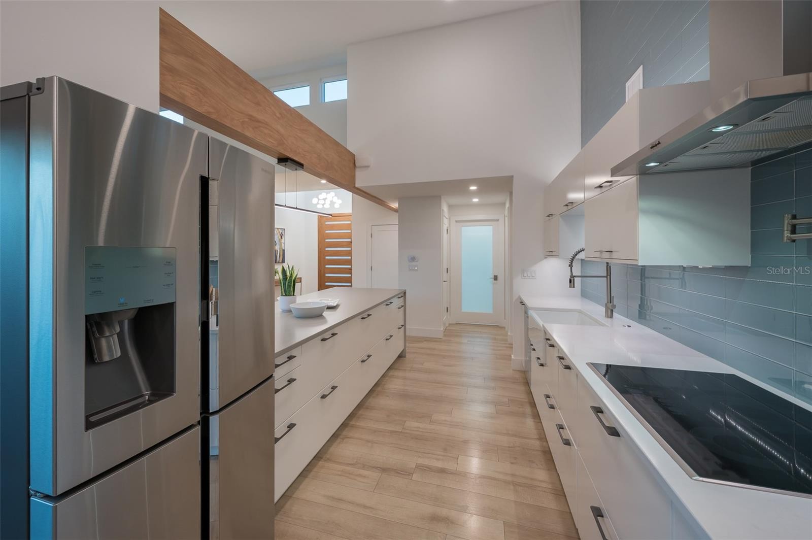 Experience the pinnacle of waterfront luxury on Siesta Key’s prestigious Grand Canal. This meticulously reimagined residence at 4938 Commonwealth Drive offers a rare blend of modern sophistication, structural integrity, and complete peace of mind. Extensively transformed both structurally and aesthetically, the home welcomes you into an expansive open-concept design filled with natural light. The newly expanded kitchen serves as the heart of the home, offering abundant cabinetry and storage, a double oven, generous pantry storage, striking custom beam detail, an open breakfast bar, and direct access to the wraparound decking—creating seamless indoor-outdoor living and effortless entertaining. A stylish powder room has also been thoughtfully added. New hurricane-impact windows and sliding glass doors frame the interiors, while designer flooring flows beautifully throughout both levels. Major system upgrades elevate the home’s value and efficiency, including a brand-new roof and a comprehensive solar power system with battery storage. A fresh, contemporary interior palette enhances the clean architectural lines and airy coastal feel. The lower level adds over 1,300 square feet of legal non-conforming living space with its own private entry, garage access, and elevator connection to the main living areas, leading directly to the pool deck. Redesigned for modern functionality, this space features a spacious family entertainment area, custom bar, and an additional guest suite with a walk-in closet and full bath—ideal for extended family, guests, or a private retreat. Outdoor living is equally impressive. The private backyard sanctuary showcases a heated pool and spa with a new heater and filtration system, sleek updated decking, professional landscaping, and premium artificial turf for effortless maintenance. For the boating enthusiast, the deep-water dock and boat lift provide direct access to the Intracoastal Waterway and open waters of Sarasota Bay, delivering the ultimate waterfront lifestyle.