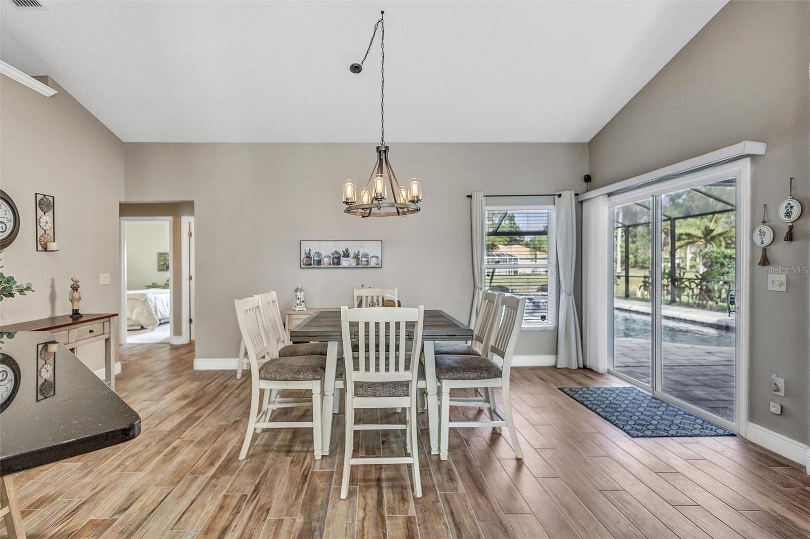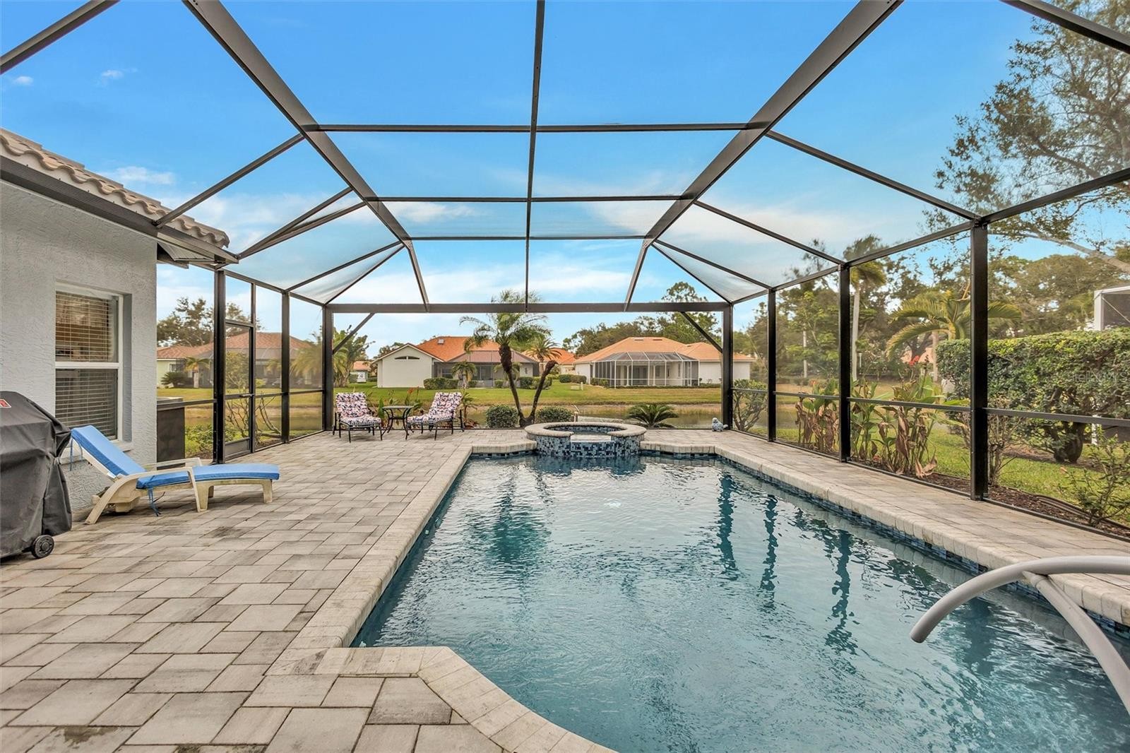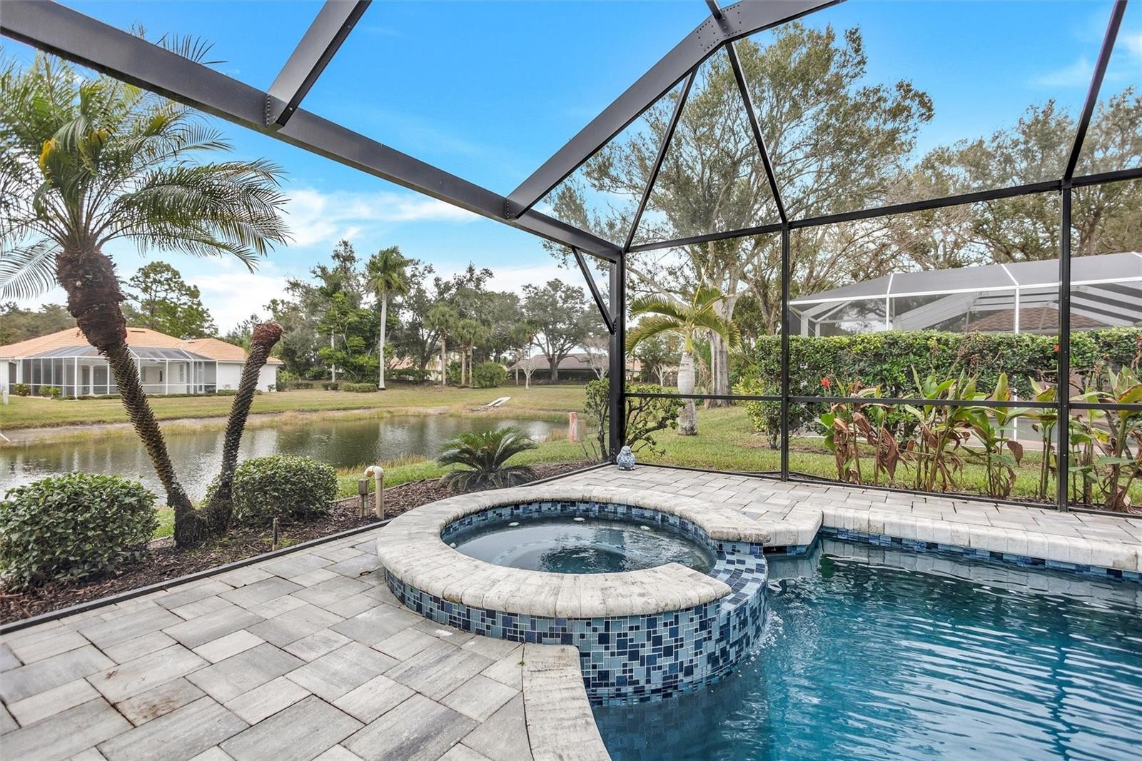 Welcome to 4984 Wild Daisy Lane, an impeccably renovated, fully turnkey-furnished residence offering refined coastal living with tranquil panoramic water views—ideal as a primary home, seasonal retreat, or investment opportunity. Thoughtfully redesigned with an open-concept layout, this home blends timeless finishes with modern functionality and exceptional attention to detail. Major exterior enhancements include a new barrel tile roof (2025), designer paver driveway (2025), fresh exterior paint in a neutral sophisticated palette (2025), and newly installed gutters. The private outdoor retreat features a heated saltwater pool and spa with new Gunite finish, elegant glass tile accents, updated coping and pavers, and a custom heavy-duty bronze panoramic view pool enclosure (2024), complemented by a new state-of-the-art Wi-Fi-enabled pool pump and filter—creating an ideal low-maintenance, resort-style environment. The interior has been transformed to create expansive living and entertaining spaces, featuring wood-plank porcelain tile throughout the main living areas and primary suite (2024), oversized baseboards, curated lighting with over twenty flush-mounted fixtures, updated chandeliers, and a fresh neutral interior color scheme (2025). The kitchen offers soft-close cabinetry, designer backsplash, and premium appliance upgrades (2024), seamlessly connecting to the main living and dining areas—perfect for hosting or short-term occupancy. The updated primary suite showcases a spa-inspired bath with new porcelain flooring, custom-tiled shower, glass partition, granite countertops, upgraded fixtures, and modern lighting. The secondary bath with pool access mirrors the same elevated level of design with new porcelain tile, decorative glass accents, granite countertops, and a glass shower enclosure—ideal for guests or rental convenience. Additional features include a SimpliSafe security system and Nest Wi-Fi thermostat, enhancing ease of ownership and remote management. Ideally located just minutes from the Gulf Coast’s renowned beaches, downtown historic Venice, Wellen Park, Costco and premier shopping, this exceptional property offers seamless indoor-outdoor living, expansive lanai spaces, and peaceful water views—an outstanding opportunity for luxury living, seasonal enjoyment, or investment potential. No CDD fee! See list of updates in attachments. Schedule your private showing today!