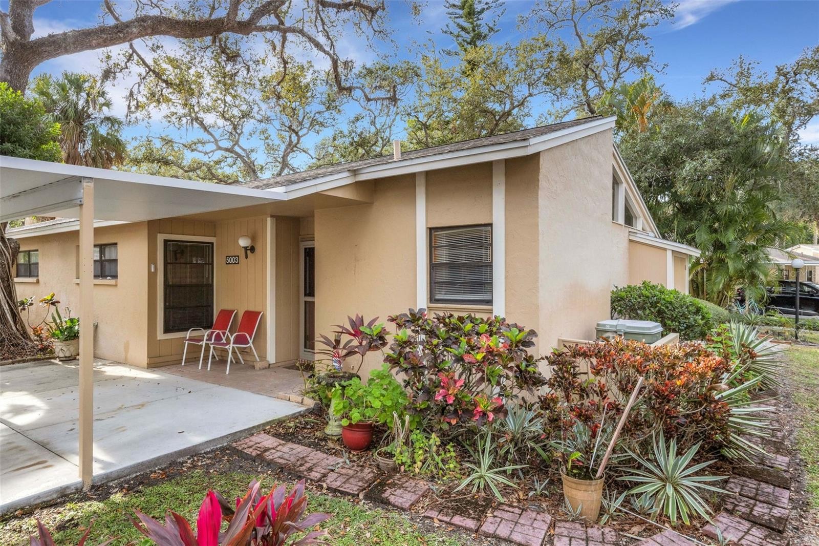 Welcome to Village Gardens, where lush tropical landscaping greets you as you enter the community, instantly creating a peaceful and tranquil setting. Located at 5003 Village Gardens Drive, this attached 2-bedroom, 2-bath villa offers comfortable living in a highly desirable community. The open living and dining area features high ceilings and a clerestory window, filling the main living space with natural light. A large enclosed Florida room/lanai provides additional space for relaxing or entertaining and opens to a private brick patio—perfect for morning coffee or dining al fresco. Inside, you’ll find two generously sized bedrooms and bathrooms, with tile flooring throughout the home except in the second bedroom. Ceiling fans in most rooms help keep the home comfortable year-round. The kitchen offers ample counter and storage space, and as a gas community, the home includes a gas range and gas water heater. A full-size washer and dryer are conveniently located in the interior laundry closet. The brand new covered carport accommodates two vehicles. This home can be sold furnished (with all current furnishings included). Village Gardens is known for its active lifestyle and strong sense of community, offering a heated pool, pickleball/tennis, and shuffleboard courts, a clubhouse with a fully equipped kitchen, library, billiards, and even a car wash area. The main entry road has been recently recoated, and community-maintained roofs have been replaced within the last few years, providing peace of mind. Residents truly love living here—take a drive through the community and see for yourself. All of this is ideally located near Sarasota Airport, downtown Sarasota, beautiful beaches, museums, UTC Mall, and more.