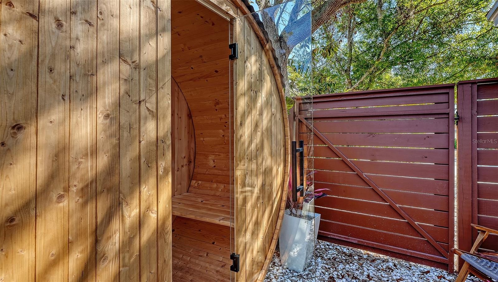 Fully renovated mid-century gem in the charming and highly coveted Indian Beach Sapphire Shores neighborhood of Sarasota. This exceptional three-bedroom, two-bathroom home has been lovingly preserved and thoughtfully restored with a strong emphasis on period-appropriate mid-century design and timeless style. Original terrazzo floors sparkle throughout the main living areas, honoring the home’s architectural roots. The fully renovated kitchen features new high-end appliances and blends seamlessly with the home’s classic aesthetic. The former Florida room has been transformed into comfortable year-round living space with permanent climate control, with the design anchored by an authentic vintage 1960s Preway wood-burning cone fireplace — a true statement piece. High-end mid-century light fixtures are showcased throughout, including multiple authentic Herman Miller pieces. Major updates provide peace of mind, including a new roof (2023), brand-new HVAC system and ductwork (2024), and a new solid wood privacy fence (2024). All bedrooms offer sizable closets, and the large zero-scaped front yard ensures beauty with minimal maintenance. The expansive backyard is a private retreat, featuring a generous paver patio and ample space for a pool or future additions. A newly installed barrel sauna and cold plunge create a spa-like sanctuary along the side yard, with convenient access from the principal suite. The true highlight of the home is the architect-designed principal bedroom and bathroom suite, completed in 2025 — an incredibly rare feature for this neighborhood and era. Designed as a private oasis, the light-filled bedroom includes a picture window and charming window seat, thoughtfully separated from the two guest bedrooms on the opposite wing of the home. The spacious en-suite bathroom is professionally interior designed and features high-end fixtures, a large walk-in shower, a freestanding spa tub, double vanity, and a walk-in closet. An exterior door provides direct access to the outdoor spa area for seamless indoor-outdoor living. Ideally located, this home is within a short distance to multiple beautiful waterfront parks and the renowned The John and Mable Ringling Museum of Art. Just five minutes to downtown Sarasota and ten minutes to the pristine beaches of Lido Key, you’ll enjoy the very best of Sarasota’s natural beauty and vibrant cultural scene — all from the comfort of your exquisitely restored mid-century home in one of the city’s most beloved neighborhoods.