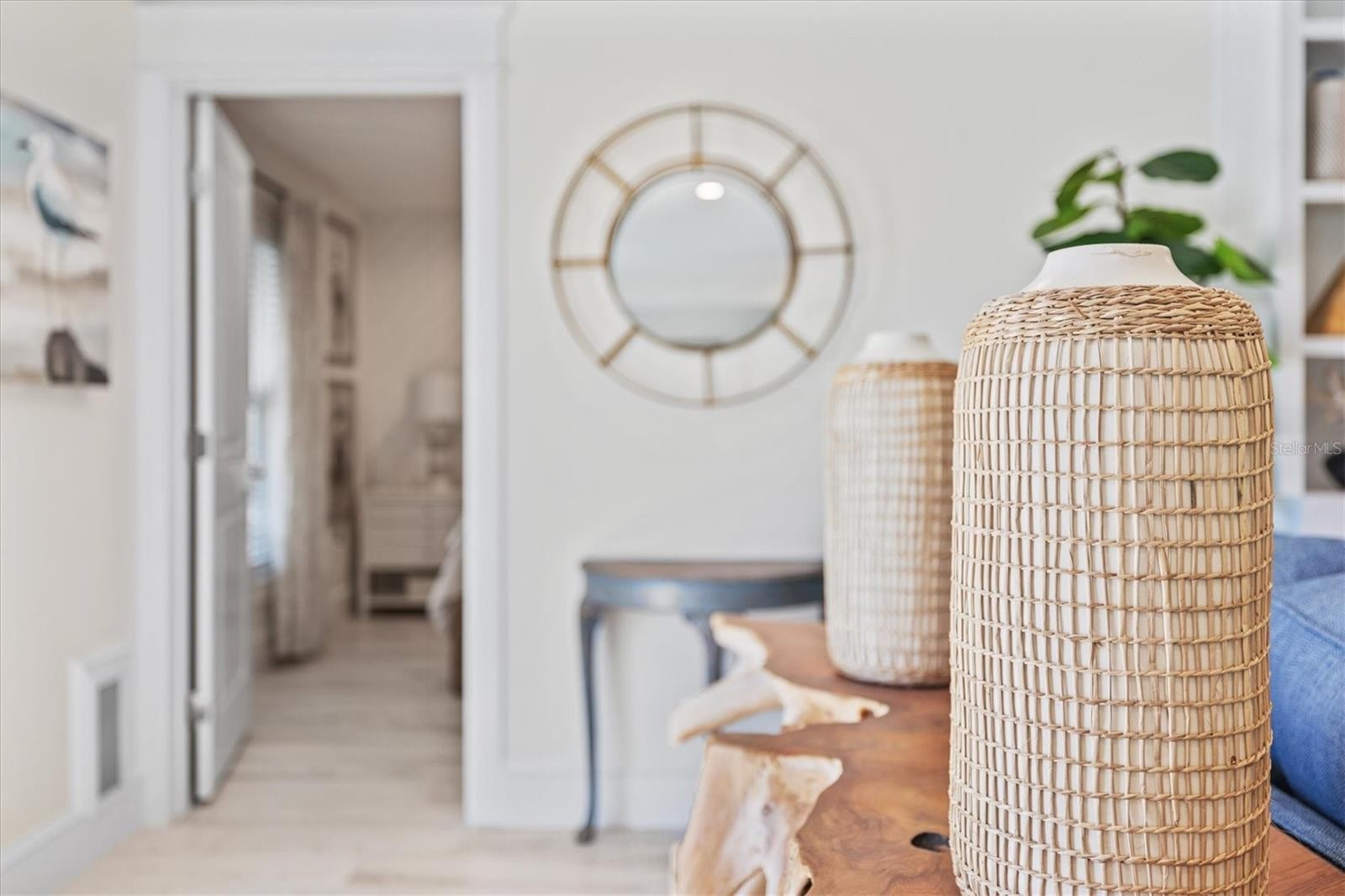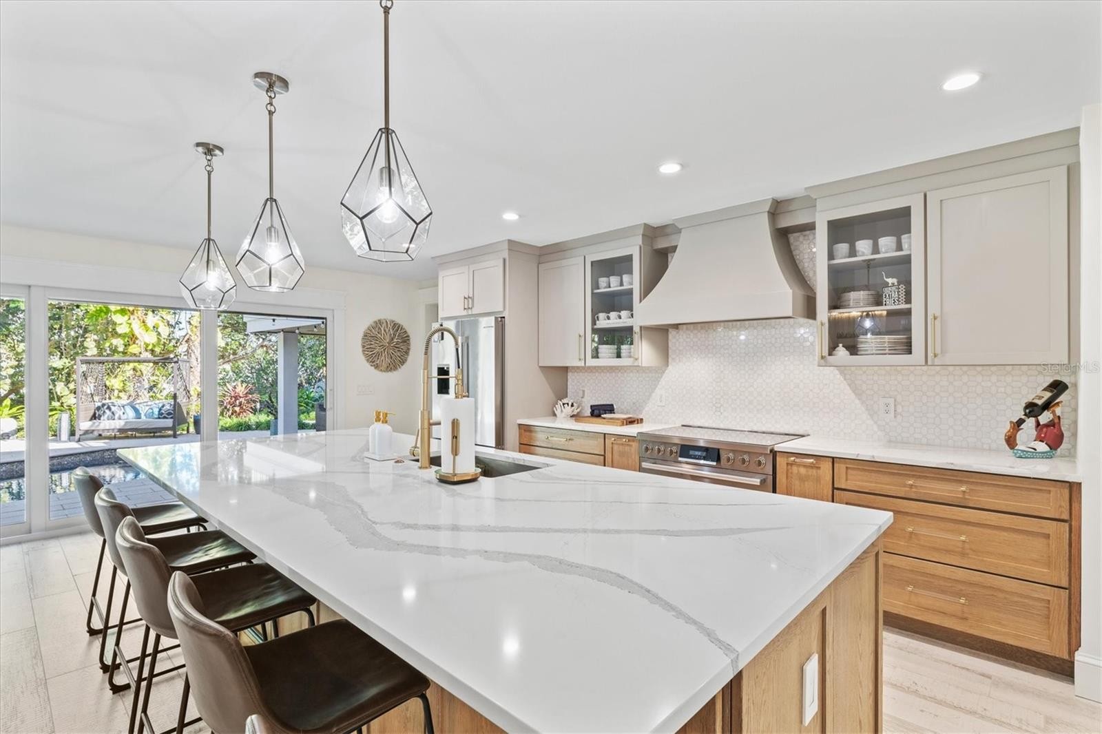 Nestled along a serene canal and embraced by a curtain of mature tropical palms, this custom-remodeled residence unfolds as a private coastal estate—an intimate sanctuary where luxury, tranquility, and effortless island living exist in perfect harmony. Masterfully re-imagined by Eason Builder Group, the home was completely gutted and rebuilt just four years ago, and last year the entire first level was once again fully renovated, resulting in a residence that feels both newly crafted and timelessly refined. From the moment you arrive, a sense of seclusion and calm sets in. As you walk up to the home, an old-growth Gumbo Limbo greets you. Sunlight filters through new hurricane-impact windows, illuminating interiors designed to feel open yet intimate, grand yet soothing. The main living space becomes a natural gathering place, anchored by a custom-built-in entertainment center and a coffee station. An elegant touch that invites slow mornings, refined evenings, and effortless entertaining. Sonos surround sound flows throughout the home, creating an ambient soundtrack for daily life, while a fully integrated security and camera system offers peace of mind and quiet confidence. The kitchen stands as a statement of both beauty and performance, where quartz countertops, solid-wood glass-front cabinetry, a sculptural range hood, designer pendant lighting, and stainless-steel Bosch appliances come together in a space crafted for culinary artistry and connection. It opens seamlessly to the dining area, where a wood-burning travertine stone fireplace adds warmth and architectural presence, setting the stage for candlelit dinners and lingering conversations. Two luxurious primary suites, one on each level offers the rare indulgence of privacy and flexibility. Each is finished with shiplap walls, porcelain tile, recessed lighting, and abundant natural light. The upper-level retreat opens to a private balcony overlooking the pool and tropical grounds, a serene perch for sunrise reflections and evening breezes. Its spa-inspired ensuite features a quartz walk-in shower, while the first-floor primary bath is appointed with a solid-wood double vanity, continuing the home’s narrative of tailored craftsmanship and understated elegance. Completing the residence are two additional bedrooms with a shared bath and an upstairs bonus room ideal for recreation, fitness, or creative pursuits. Beyond the interiors, the estate reveals its most captivating chapter. The backyard unfolds as a secluded resort, where a glistening pool and spa are framed by layered, well-established tropical landscaping that has matured into a living wall of privacy. Covered and open-air lounges invite both sun-drenched afternoons and starlit evenings, while a turf-lined grilling and gathering area provides an elevated setting for alfresco dining. Just beyond the palms, the canal stretches quietly behind the property, creating the illusion that the waterway is an extension of your own grounds and inviting a lifestyle of boating, paddleboarding, and sunset cruises from your private dock. When you venture beyond this sanctuary, the unmistakable charm of Holmes Beach awaits. This is more than a home—it is a refined island retreat, custom crafted for those who seek privacy, comfort, and tranquility, with the rare privilege of a secluded waterfront setting and immediate access to one of Florida’s most cherished beach communities.