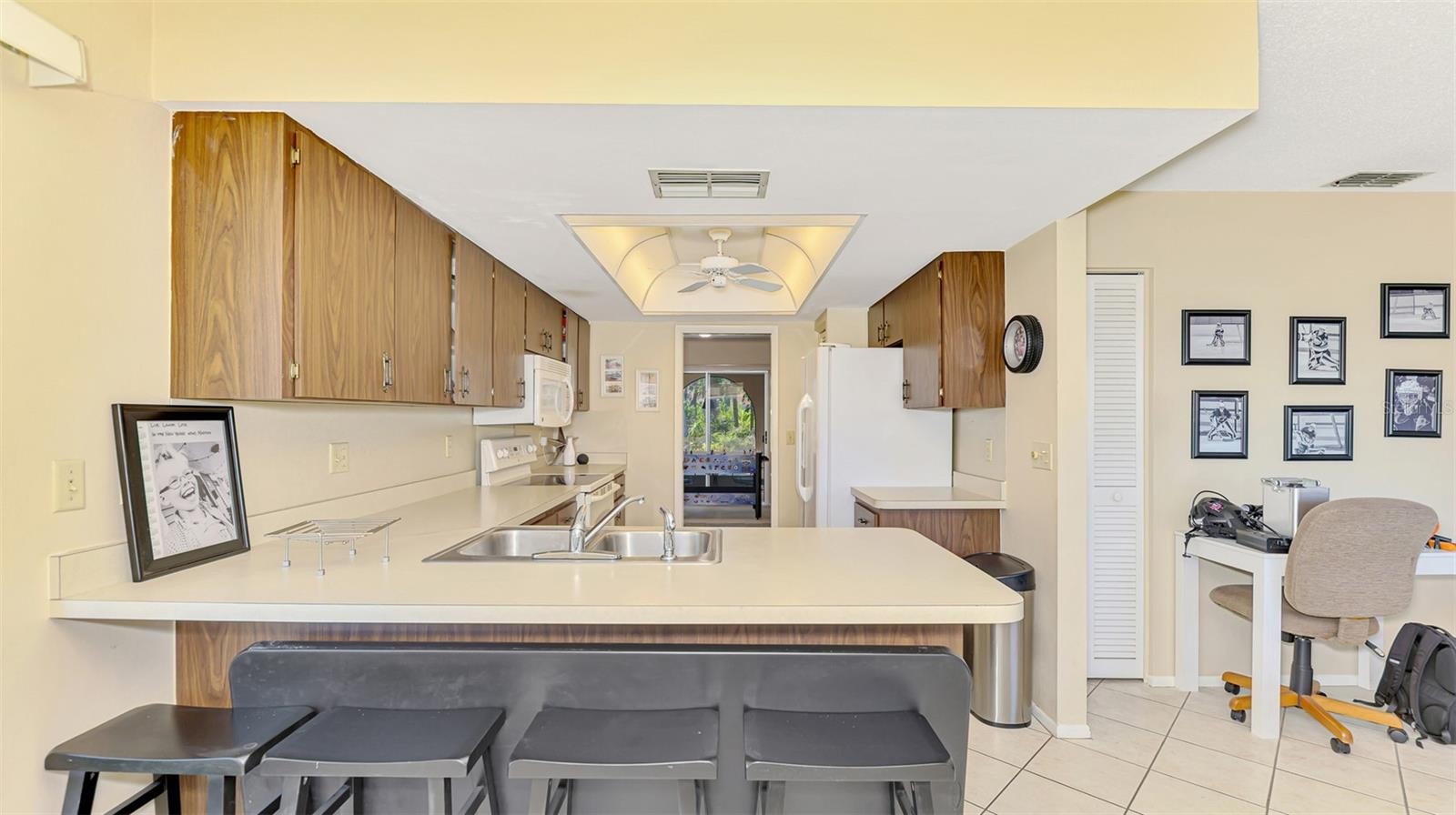 Sorrento Villas is an area of detached single family homes whose ownership is classified as a condominium. The monthly fee includes insurance, roofs, exterior, painting, lawn maintenance and more. This detached home is situated privately with trees on the side and across the street along with a water view in the front. There is an enclosed porch in the front and also the in the back. The living room is spacious with sliders to the enclosed porch. The kitchen is open to a dining area with sliders to the lanai. The primary bedroom has a walk-in closet and a full bath with a shower. The second bedroom has a walk-in closet. The seller is giving a $2,000 flooring allowance for new carpet. You are within in minutes to shopping, restaurants, Casey Fish House and Tiki Bar along with downtown Venice and Nokomis Beach.