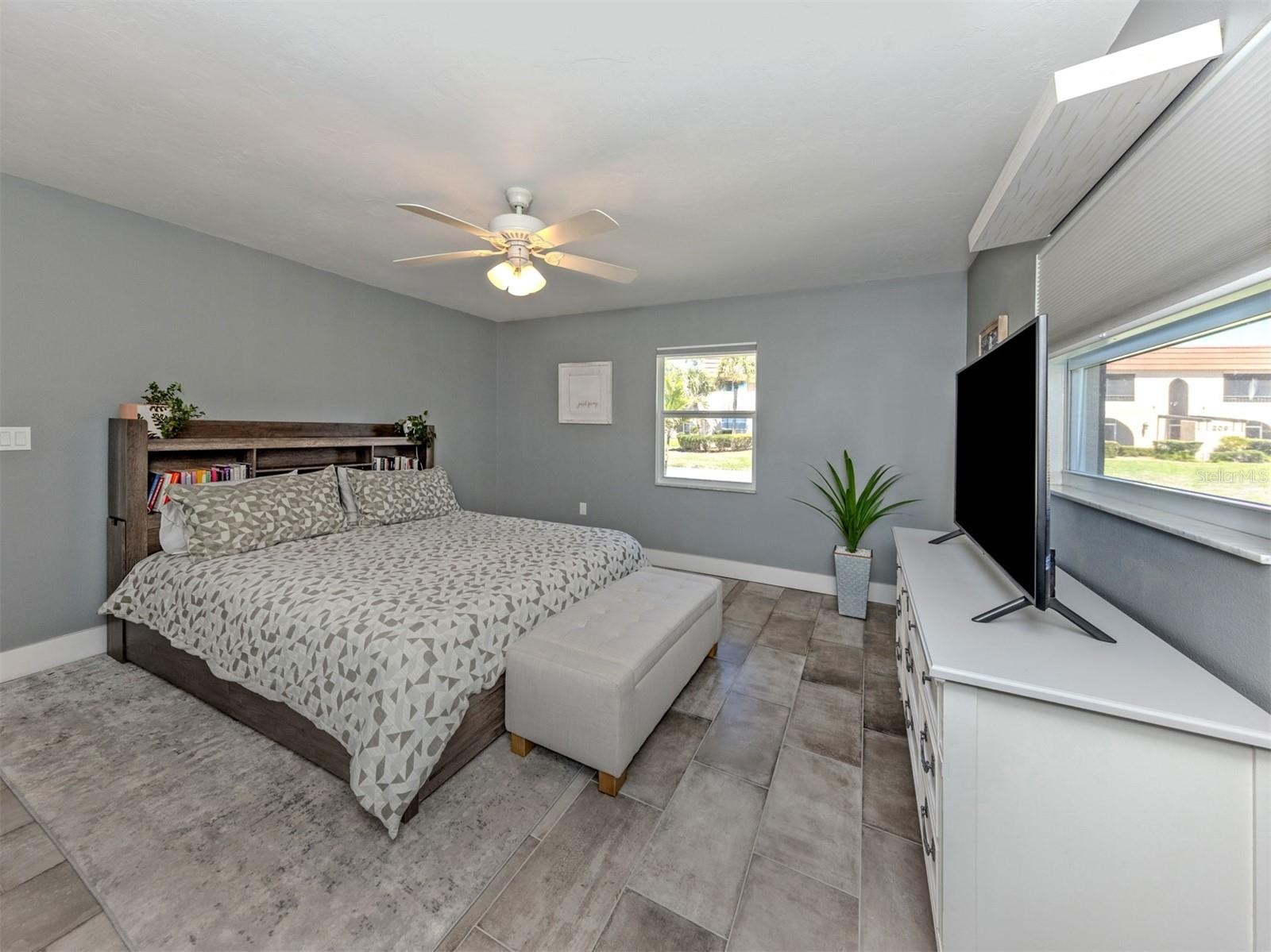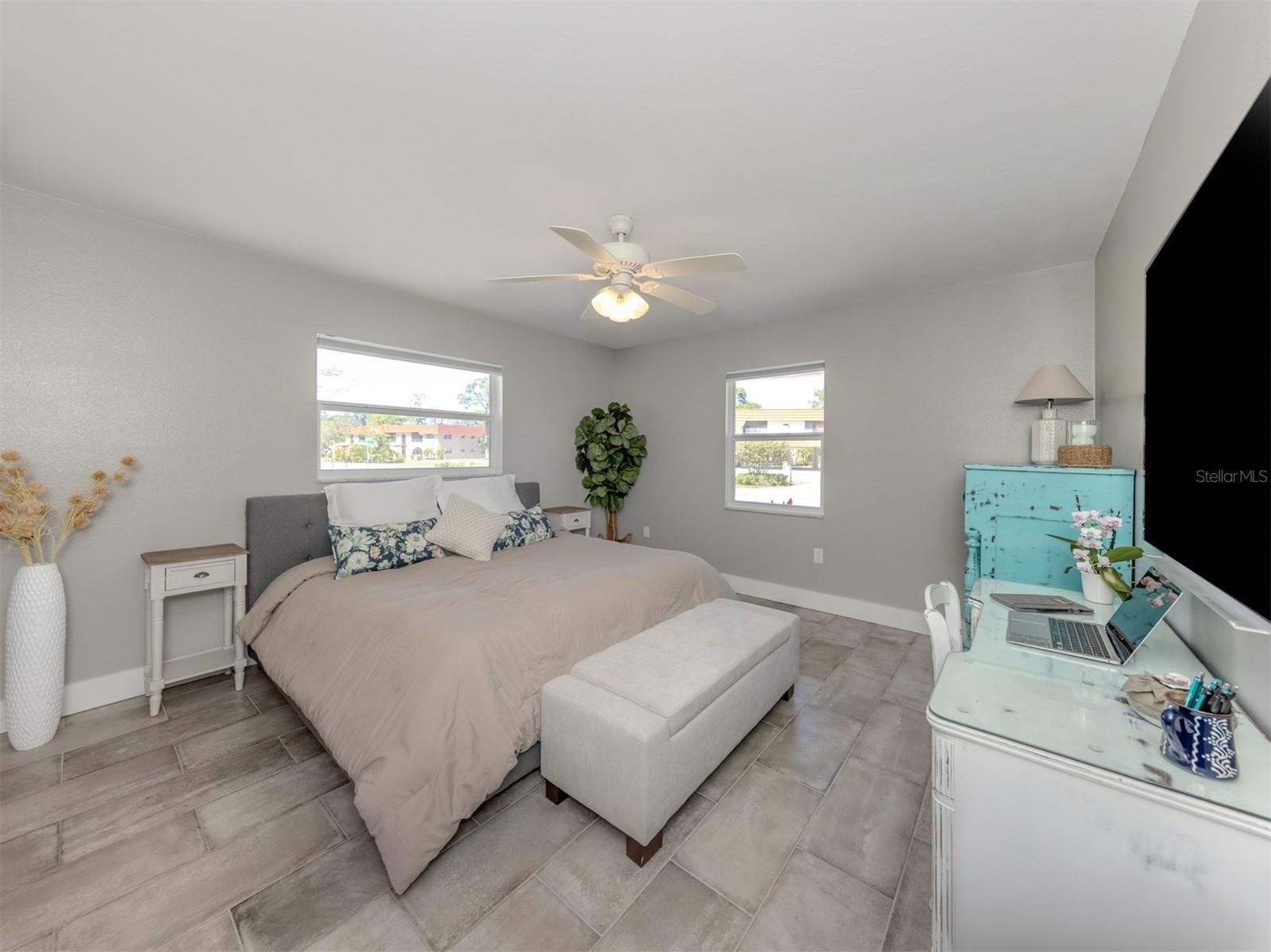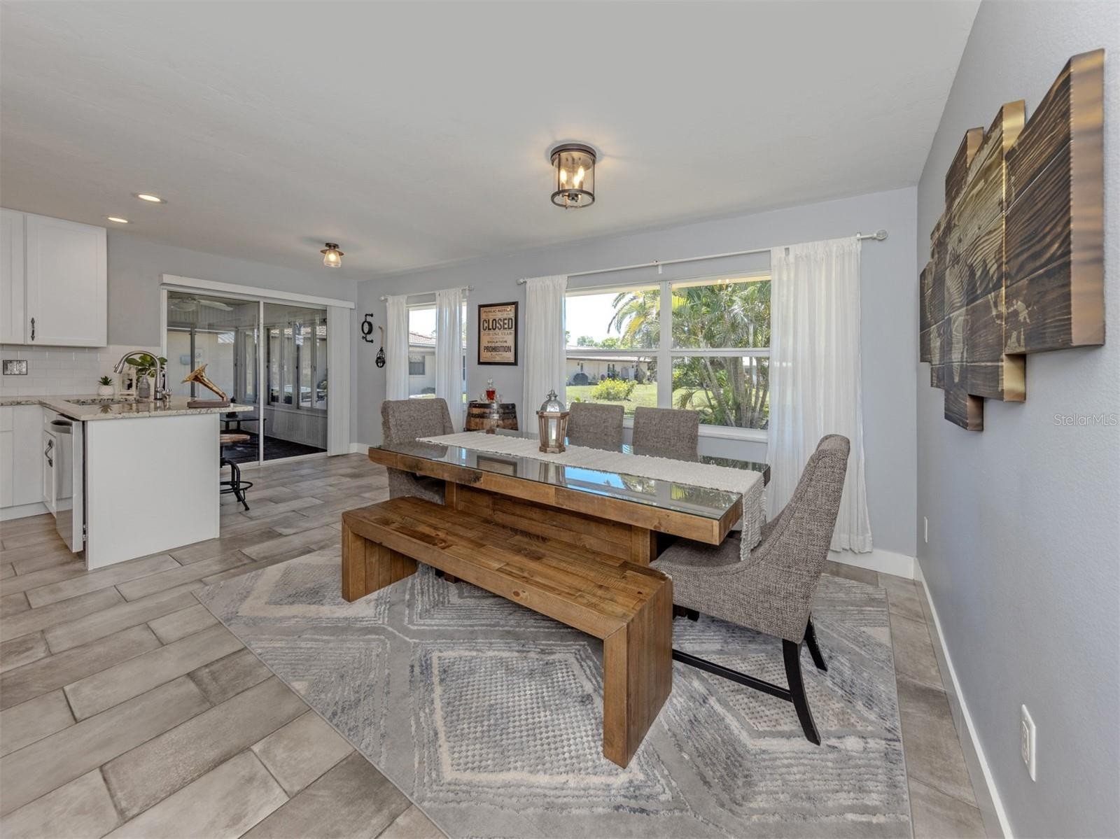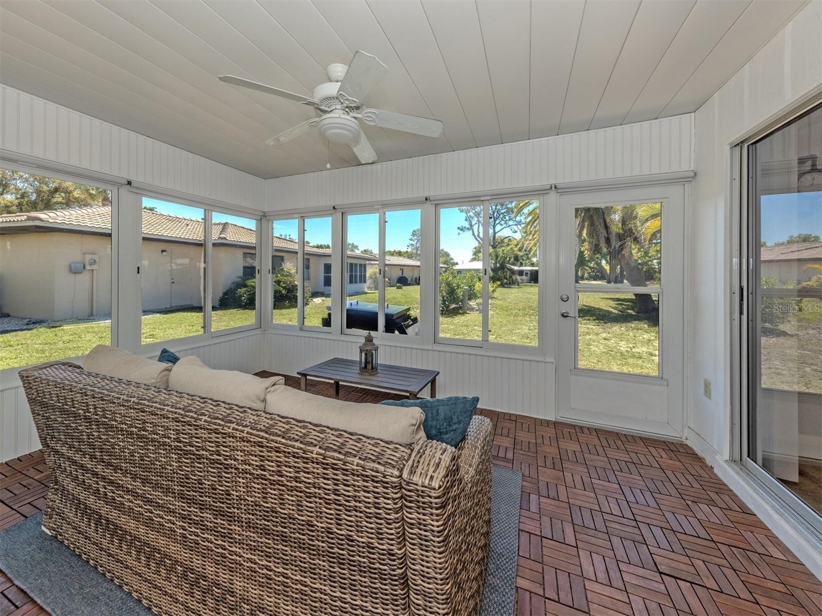 Welcome to this beautifully renovated single standing 2 bedroom, 2 bathroom villa, where modern upgrades meet low maintenance living. Thoughtfully updated from top to bottom, this home offers both style and peace of mind with major improvements already completed. The exterior features hurricane impact windows, a new hurricane rated garage door (2020), gutters/downspouts (2020), and extended driveway. Enjoy added curb appeal and ambiance with the Govee LED under eave lighting system, along with a charming screened front porch perfect for relaxing. Step inside to a fully renovated interior showcasing quality craftsmanship throughout. The kitchen has been completely transformed with solid wood soft close cabinetry, quartz countertops, a stainless steel farmhouse sink, Delta Touch faucet, and matching stainless steel appliances. Additional upgrades include reverse osmosis water system, removal of the drop ceiling, and modern LED recessed lighting. Whole house enhancements include ceramic tile flooring throughout, 6 inch baseboards, 3 inch door casings, new interior doors including the front door, and a skip trowel ceiling finish that adds a custom touch. Storage abounds with a large walk in closet off the living room, and additional closet off the dining room. Sliding glass doors from both the living and dining areas lead to the acrylic enclosed back patio, complete with wood decking over concrete, creating a versatile indoor outdoor space. The guest bathroom offers a ceramic tile shower enclosure with a deep soaking tub and rainhead shower, along with a new vanity topped with marble. The guest bedroom includes a spacious walk in closet. The primary suite features a large walk in closet and an updated bathroom with a new marble top vanity and beautifully tiled shower. Additional highlights include an AC system installed in 2020, making this home truly move in ready. Just 4 miles from Nokomis Beach with convenient access to US 41 and I-75, plus nearby shopping and dining, this villa combines modern upgrades, functional space, and lasting quality, offering a rare opportunity to enjoy the very best of Florida living.