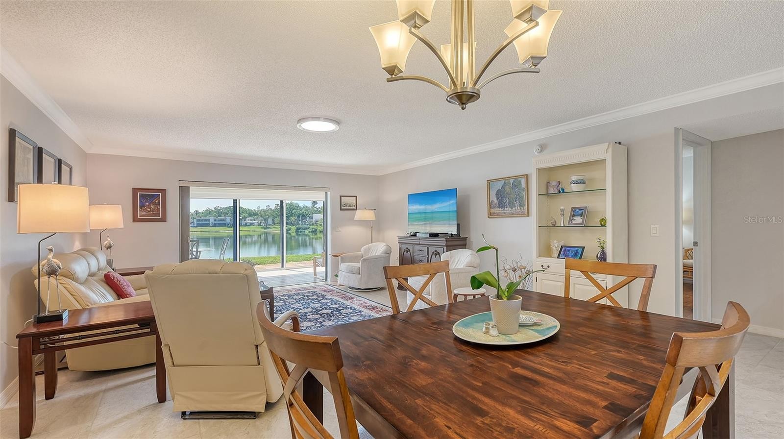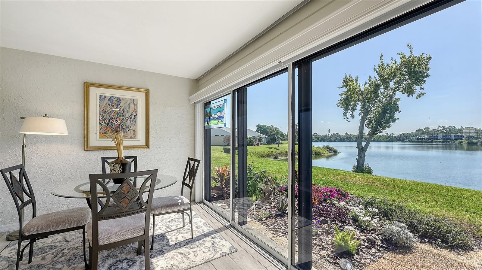 Once you walk up to the front door & peer through the open concept living area, your eyes will be focused on the large reflective pond, just beyond your rear sliders. This is one of the most tranquil views throughout the day, from glistening of the sunrise over the water every morning to the abundance of the variety of birds & ducks that frequent the pond to the amazing sparkle of another sunset. The interior is quite as stunning as well. You will first come upon the creative design of fabulous wood cabinets, all with soft close, along with an amazing wall of floor to ceiling pantry/small appliance storage, classy granite counters, pull outs for your pots & pans with plenty of storage & counter space. Great for all your extras, entertaining pieces & food prep for your holiday gatherings. Your open concept living makes it easy to converse with your guests from this area of the home. A bistro table would fit nicely under the front kitchen window, in front of the plantation shutters. Barstool seating at the open counter for casual meals or for more formal seating, the dining table would accommodate that special gathering. From here it flows seamlessly into your large living room. This area of the home has beautiful neutral tiled floors that blend beautifully with the neutral palate, perfect for a Florida home. From here let's continue onto the spacious lanai with a wall of sliders to enjoy the ambiance of this remarkable backyard, starting with the vibrant colors in the flower garden to the tranquility of watching the ripples in the pond. No doubt this will be your go to area of the home! Also on your lanai, a generous size storage closed which occupies your full-size washer & dryer. Enjoy custom pull-down light filtering privacy window treatments the full length of your sliders. Stepping back inside, you can enter the 2nd set of sliders from the lanai, taking you right into your spacious primary suite. You come upon a generous size walk in closet along with a wall of closets for more than adequate room for your wardrobe. This area has engineered hardwood floors to enhance the tranquility of this space. The ensuite has granite counters & plenty of counter space & storage for all your essentials. The shower area with separate commode area is perfect for privacy, allowing access to each area. Now as we head back to the front of the home, we come upon the guest room, complete with ensuite. This room was thoughtfully designed for space & storage with a beautiful full size Murphy Bed. This community consists of 88 acres, making it nothing short of paradise for those who enjoy nature, the sights of colorful foliage & the sounds of nature. There are trails throughout for a relaxing walk. Community is within close proximity to everyday essentials, including 3 airports between 15 minutes to less than an hour away, access to major roads & interstates, plus the beaches of Anna Maria Island, just 15 minutes to the beautiful Gulf waters & IMG. Activities nearby include multiple golf courses, parks & recreation, theater, boating & fishing, Spring Training, cruise ports & comedy shows just to name a few. This area has access to a magnitude of fun things to see & do! Community also offers 2 heated pools & hot tubs, tennis plus pickle ball. This home is perfect for year-round living or your snowbird residence. Leave with peace of mind from your newly installed electronic hurricaine shutters, simply just flip a switch! Furnishings negotiable.