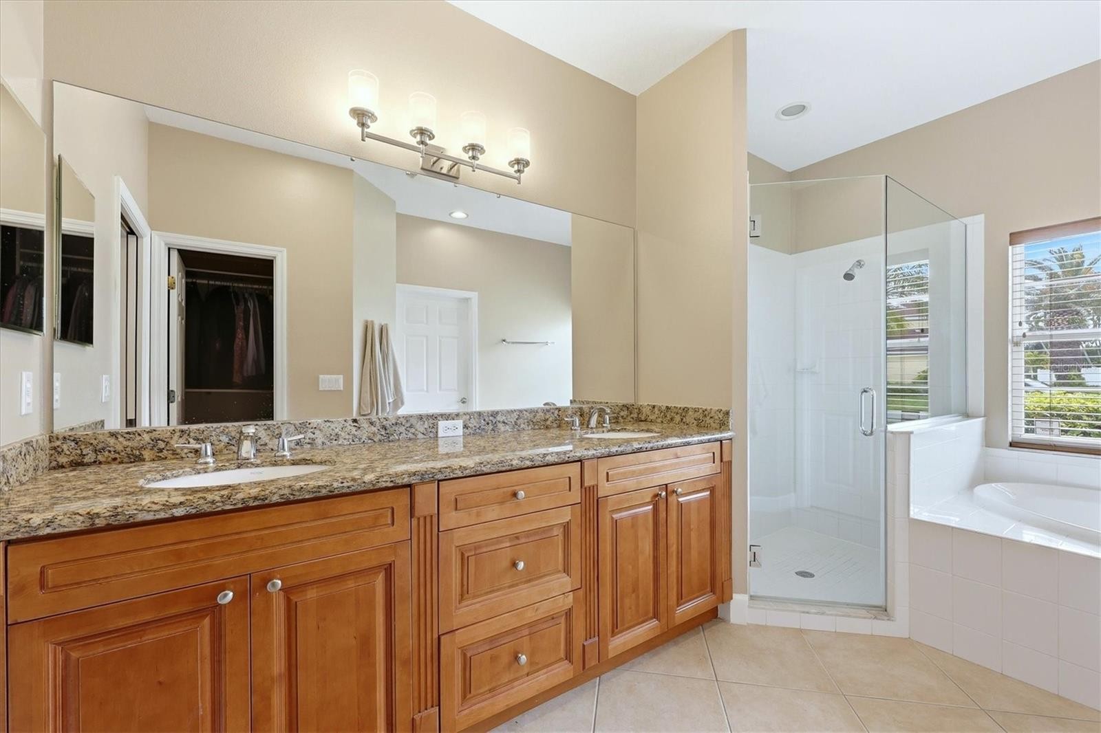 Discover unparalleled living in this rarely available meticulously maintained 4-bedroom, 3-bathroom pool residence at the Estates at Glenn Lakes. Situated on a prime golf course setting with exceptional western golf course and sunset views. This 2,558 sq. ft. home boasts an elegant and spacious layout featuring a formal living and dining room setup that flows beautifully into a bright, great room and a large, well-appointed kitchen. It is a chef's delight, equipped with 42-inch cabinets and fine Italian granite countertops. Double doors lead to the secluded private main bedroom retreat featuring two walk-in closets with California Closet shelving system, dual granite sinks, a shower, and a separate Roman spa tub. Two bedrooms and a shared bath are on the other side of the home. The fourth bedroom, located at the front of the residence, may also serve as an office or den. A stunning backdrop for daily living is the "aquarium style window" looking out to the pool and beyond. Entertain outdoors around the under-roof kitchen/grill bar with mounted large flat screened TV (not warranted). Expansive 20x50 screened pavered deck. Heated pool/spa. Attention to detail with a full home generator and new roof in 2021, New AC in 2026, extensive recessed lighting, central vacuum, intercom surround sound system and ample garage storage.