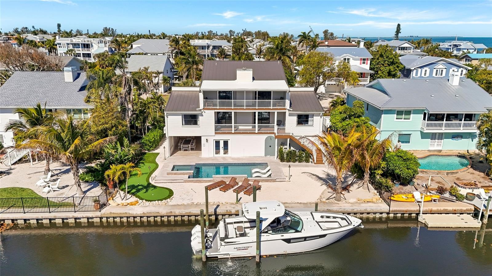 Welcome to 519 Loquat Drive, an exceptional waterfront retreat in the heart of Anna Maria. Positioned on a deep, boatable canal with direct, unobstructed access to Bimini Bay and Tampa Bay, this 4-bedroom, 4-bath residence delivers luxury, location, and a lucrative income opportunity, exceeding $200,000 annually - on pace to surpass $300,000 this year! Completely remodeled in 2025 and offered fully furnished including a sauna, gym, and games, this turnkey home spans over 2,600 square feet and an additional over 1300 plus square feet of non-conforming flex space which features a game room, gym, outdoor kitchen and more. The interior includes luxury vinyl flooring, quartz countertops, hurricane-impact sliders, and an open-concept design built for entertaining. The chef’s kitchen showcases stainless steel appliances, and abundant cabinetry, seamlessly flowing into the living and dining areas with a statement fireplace. This home features four bedrooms, including three with private ensuites. Two full primary ensuites showcase spa-inspired baths, generous closets, and private balcony access. Additional bedrooms offer comfort for family or guests. A dedicated laundry room with custom built-ins, ample storage, and a separate owner’s garage add convenience and functionality. Outdoor living is elevated with a brand-new heated pool and spa, all-new pool equipment, putting green, outdoor kitchen, and outdoor shower. Enjoy immediate boating access, with no bridges - to open water. Trex stairs and balcony decking ensure durability and low maintenance. Upgrades include a new metal roof, brand-new seaball, brand-new dock, new landscaping, one brand-new AC system plus a new mini-split, and a fully renovated interior from top to bottom. Currently operating as a successful Airbnb with strong rental history, this property is equally suited as a high-performing investment or private waterfront residence. Located moments from the sugar-white sands of Bean Point Beach and the shops and dining of Anna Maria, this home offers effortless access to the best of island living!
