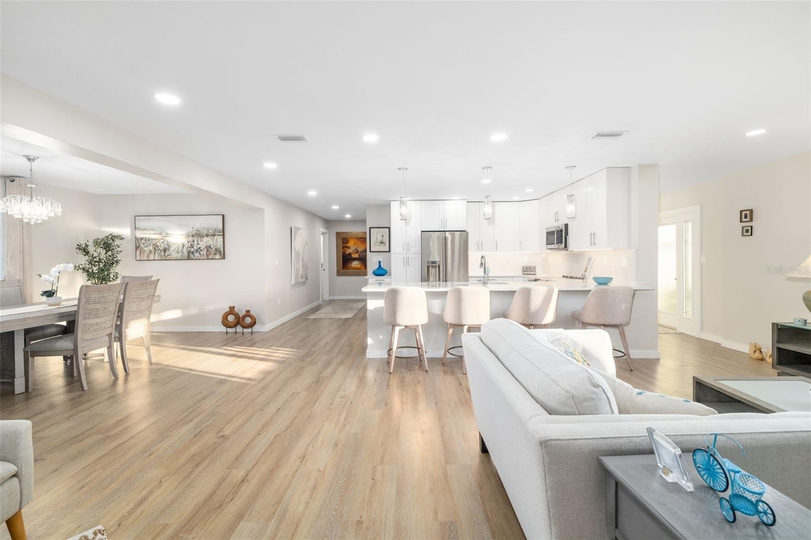 Experience refined Sarasota living in this thoughtfully reimagined River Forest residence, ideally positioned near the area’s most treasured coastal and boating destinations. Just ½ mile from Phillippi Estate Park, under a mile to Phillippi Harbor Club, and less than 2 miles to Siesta Key Beach, this home offers an effortless blend of privacy, access, and lifestyle. Set within a discreet neighborhood known for its multiple access points and ease of movement, this block-constructed home has been tastefully and comprehensively renovated with an emphasis on comfort, cohesion, and quiet luxury. An open, flowing floor plan anchors the home, where the living, dining, and kitchen spaces connect seamlessly—perfect for both everyday living and entertaining. The kitchen features a four-seat breakfast bar that invites casual gatherings, while the living room enjoys peaceful sunset views, adding a soft, natural close to each day. The open-concept layout includes three inviting bedrooms and two beautifully updated baths, complemented by luxury vinyl flooring and soft, contemporary finishes throughout. The kitchen is both striking and highly functional, appointed with Carrera marble–style quartz countertops and a full quartz backsplash, premium Café appliances, and a sought-after two-drawer dishwasher. Soft-close cabinetry, pull-out pantry shelving, and a spacious indoor laundry room reflect the home’s attention to detail and livability. Architectural upgrades include shaker-style interior doors with new hardware, magnetic door stops, and carefully placed recessed lighting that enhances flow and ambiance. Significant capital improvements provide confidence and peace of mind, including a new roof (2022), hurricane-rated impact windows (2024), updated interior and exterior lighting, and two newly enclosed garages (2025). The home was fully replumbed in 2006. Outdoors, a private patio and fully fenced backyard offer ample space to create a custom pool or serene garden retreat. River Forest’s optional civic association maintains the neighborhood park, pond, entrance, and access to Phillippi Creek —an understated yet valuable amenity. A home that feels complete, considered, and quietly exceptional—ready to welcome you home.