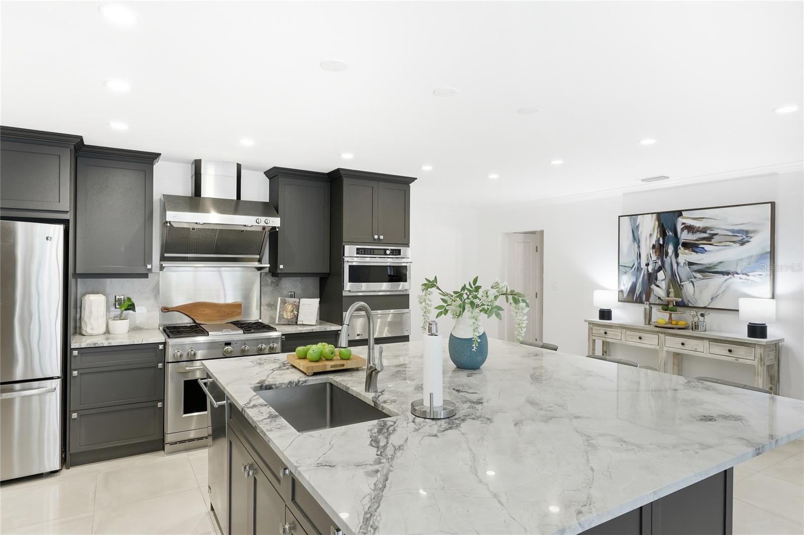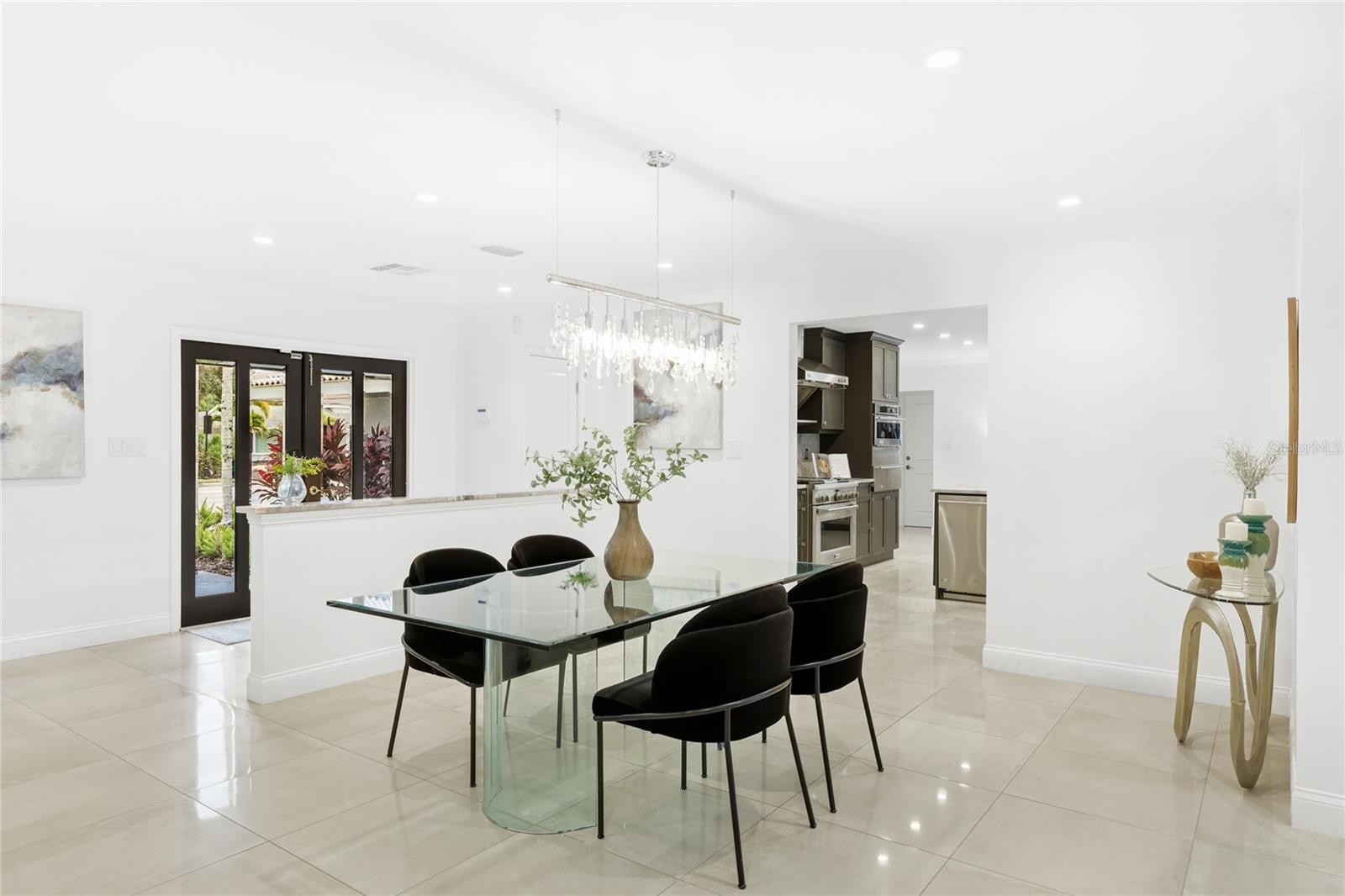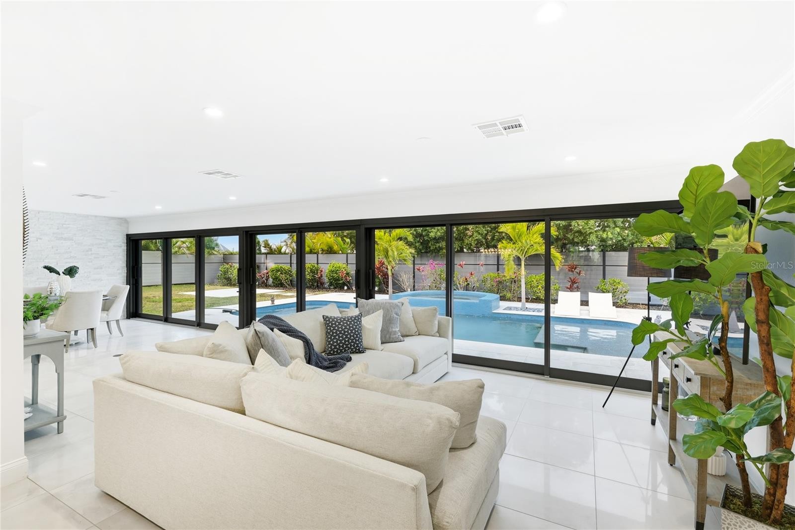 Indulge in luxurious island living in this absolutely stunning, contemporary-inspired 3-bedroom, 2.5-bath pool home, perfectly situated in the highly sought-after Bird Key community. Lush tropical landscaping creates an inviting first impression, setting the stage for the refined design and thoughtful renovations found throughout this move-in-ready residence. Inside, a light-filled open floor plan is enhanced by porcelain tile flooring, designer lighting, and expansive impact-resistant sliding glass doors that frame serene views of the fully fenced backyard. The living space flows effortlessly into a formal dining area and is anchored by an electric fireplace with striking masonry stone detail, creating an ideal setting for both entertaining and everyday living. The kitchen serves as a true focal point, featuring an oversized island with bar seating, quartzite countertops, modern stainless steel appliances, and seamless connection to the great room and stone-accented family area. The primary suite is a private retreat, offering a spa-inspired ensuite with dual vanities, a freestanding soaking tub, and a walk-in shower complete with dual rain shower heads and body jets. One secondary bedroom includes its own ensuite bath and walk-in closet, while the third bedroom opens to a charming covered front patio. Step outside to a resort-style oasis designed for relaxation and enjoyment. The renovated PebbleTec pool and spa feature a sun shelf, updated waterline tile, and generous patio space ideal for lounging or hosting guests. Additional highlights include a two-car garage with updated door, electrical improvements, refined fencing offering peaceful privacy. Located just minutes from downtown Sarasota, St. Armands Circle, and the beaches of Lido Key, Bird Key offers unmatched access to world-class dining, shopping, cultural attractions, marinas, parks, and golf. This exceptional home delivers the perfect blend of style, comfort, and location, offering a Sarasota lifestyle without compare. **THIS PROPERTY QUALIFIES FOR A 1% LENDER INCENTIVE IF USING PREFERRED LENDER. INQUIRE FOR MORE DETAILS.**