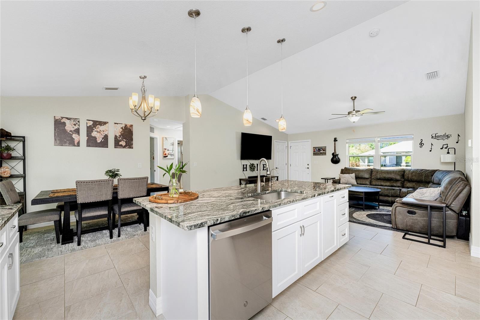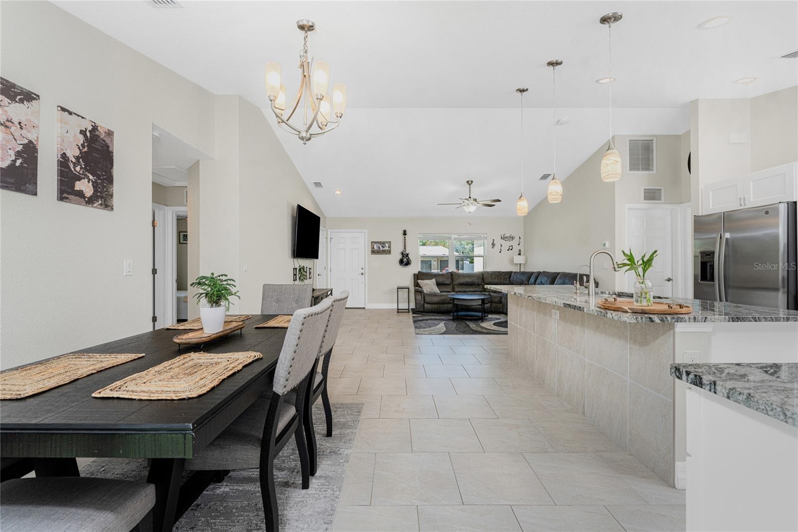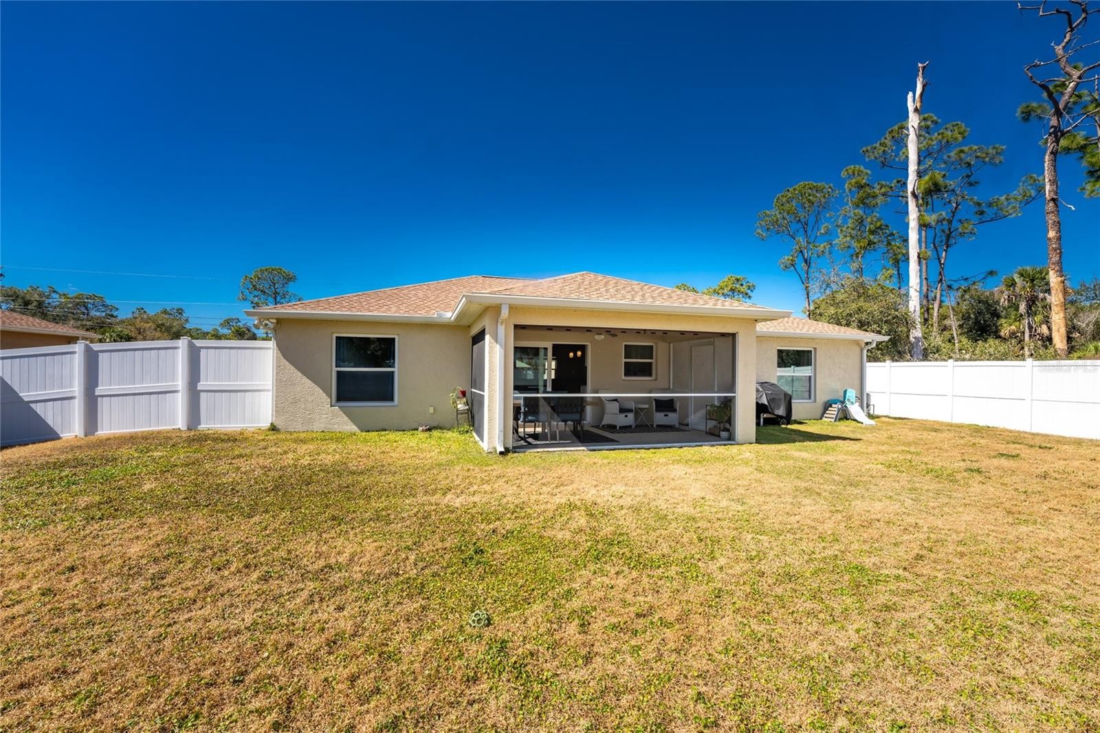 Like-New 2023 Built North Port Home Close to Shopping, Dining, and I-75 Convenience! This three bedroom, two bathroom home offers an open, split floor plan and sits on an oversized lot with a fully privacy fenced backyard, providing plenty of space and privacy with room to add a pool. Inside, tile flooring runs consistently throughout the home, creating a cohesive look while offering easy maintenance. The great room features vaulted ceilings and is filled with natural light, while the formal dining area and kitchen both open to the main living space, creating an ideal layout for everyday living and entertaining. Sliding glass doors lead to the screened lanai, allowing for easy indoor and outdoor gatherings. The chef in the family will appreciate the spacious kitchen featuring abundant white shaker-style, full-overlay cabinets with soft-close features, generous granite countertop space, a glass tile backsplash, stainless steel appliances, and a center island perfect for meal prep and keeping everything organized. The spacious ensuite primary bedroom includes a walk-in closet, while the primary bathroom offers dual sinks, granite countertops, and a fully tiled walk-in shower. Both guest bedrooms are nicely sized with reach-in closets, and the guest bathroom is thoughtfully designed with a tub and shower combination and a granite-topped vanity. An interior laundry room adds convenience with built-in cabinetry and a laundry sink for chores and organization. Outside, evenings on the lanai are especially enjoyable, with panoramic screens that can be raised to allow a great breeze to roll through while enjoying the quiet neighborhood setting. The expansive backyard offers endless possibilities for future expansion, a pool, sports courts, shed, or whatever suits your lifestyle. Built with comfort and peace of mind, the home features hurricane impact, insulated, low-E windows and durable 30-year shingles. Located at 5262 Gaghagen Street, this home places you close to everything North Port has to offer. With easy access to Sumter Boulevard and I-75, commuting to Sarasota, Tampa, Fort Myers, and beyond is simple and convenient. You will also enjoy being near shopping, dining, Wellen Park, and just a short drive from the beautiful Gulf beaches.