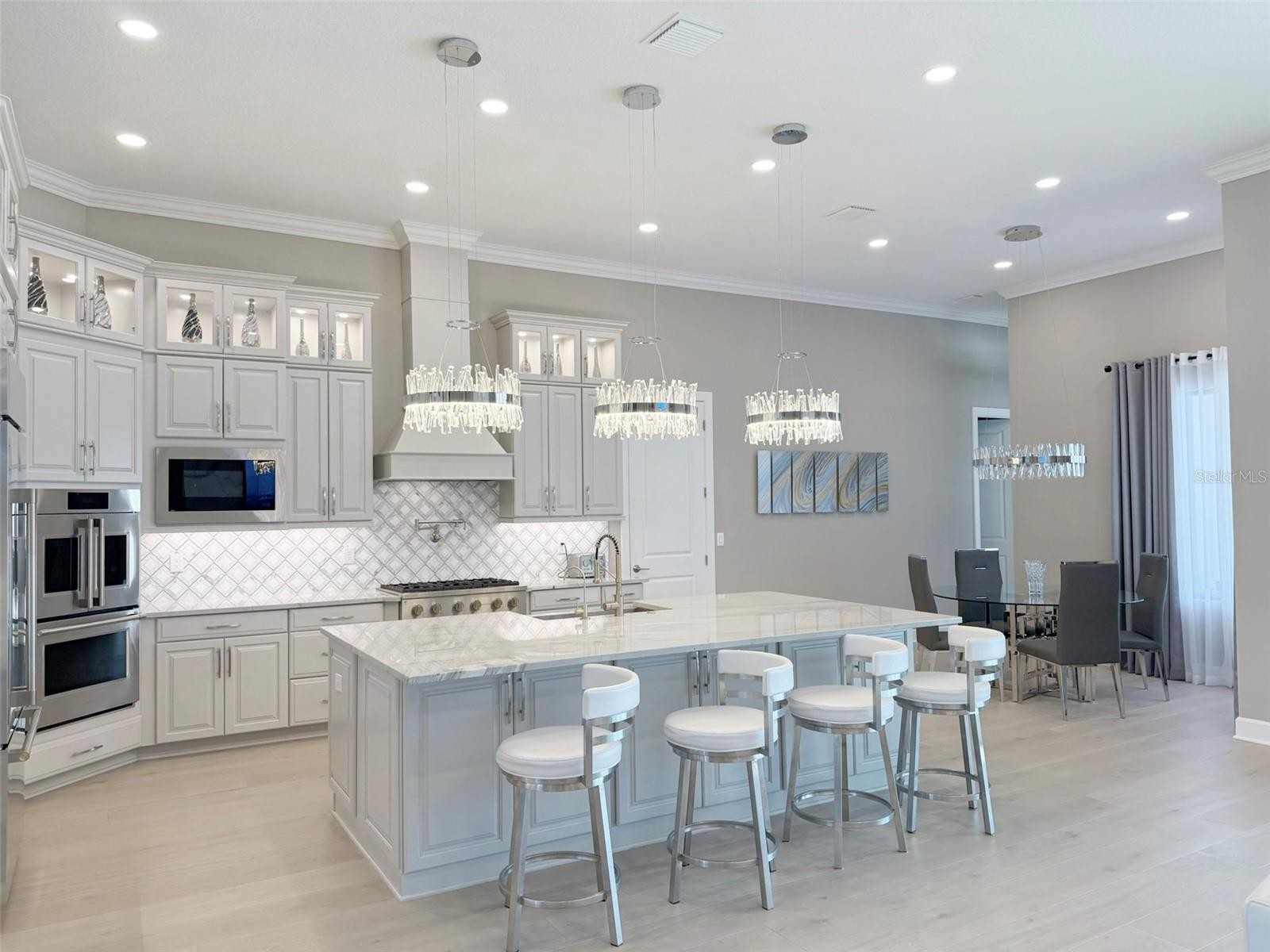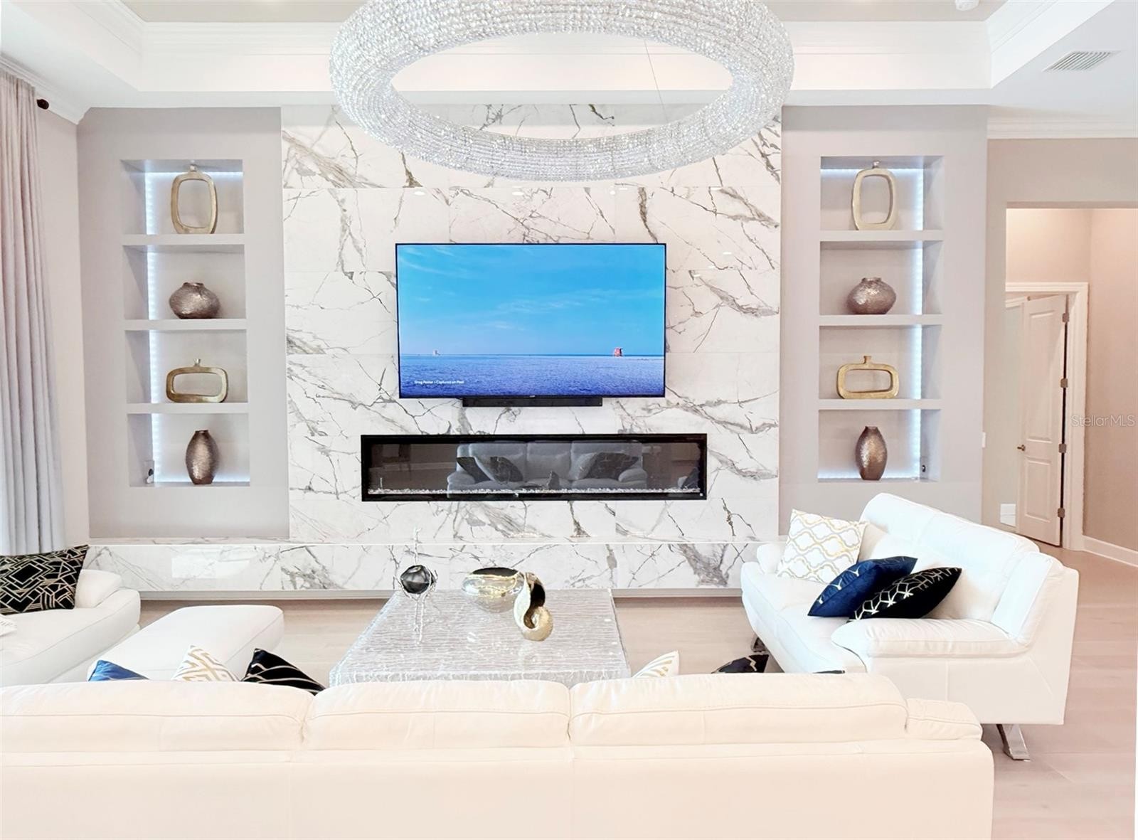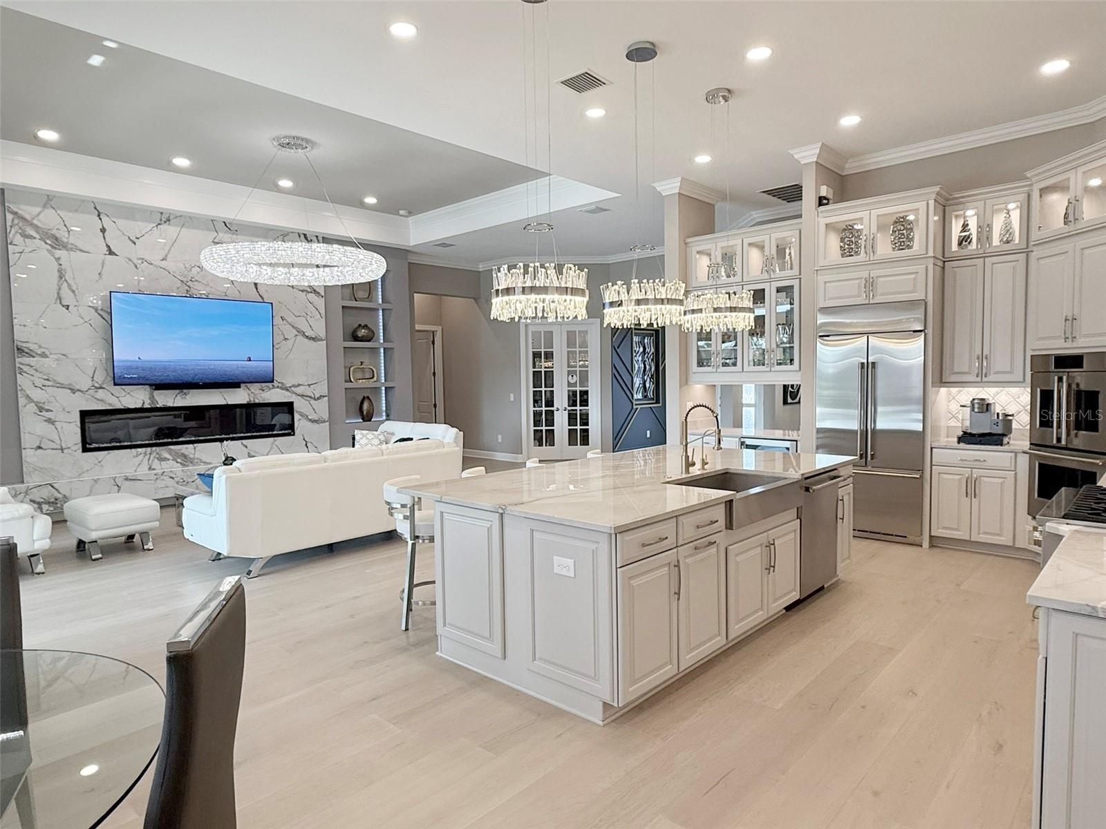 Under contract-accepting backup offers. Welcome to 5305 Brookgrove Drive- Legacy Estates. This stunning, contemporary Beacon model home is perfectly positioned on one of the best lots in Legacy Estates, offering breathtaking views of a tranquil pond and serene preserve from the back, while the front overlooks a beautiful dog park—a rare combination of beauty and privacy. Step inside to discover a meticulously upgraded residence featuring 12-foot ceilings, custom tile and marble work throughout, elegant hardwood floors, and over 35 contemporary light fixtures that enhance the home’s ambiance. The gourmet kitchen is a chef’s dream, equipped with upgraded Monogram appliances, quartzite marble countertops, and premium cabinetry. The spacious living area is anchored by a striking 100-inch luxury fireplace with a designer tile surround and custom shelving, while built-in closets and upscale custom window treatments add both style and function. The expansive 2,500 sq. ft. lanai is a true showstopper designed for year-round resort-style living. Featuring a large heated salt pool and spa with elegant water features and a lounge area, travertine tile, an outdoor kitchen with a built-in grill, fridge, and bar, this space is perfect for entertaining or simply unwinding while enjoying the picturesque views. Hurricane-impact windows, four-zone heating, and custom landscaping complete the home’s high-end features. As part of the sought-after Esplanade on Palmer Ranch community, residents enjoy a world-class amenities center, a resort-style heated pool, splash pad, Bahama Bar restaurant, pickleball and tennis courts, and a fully equipped gym. And with award-winning Gulf Coast beaches just 15 minutes away, this home truly offers the best of luxury and lifestyle.