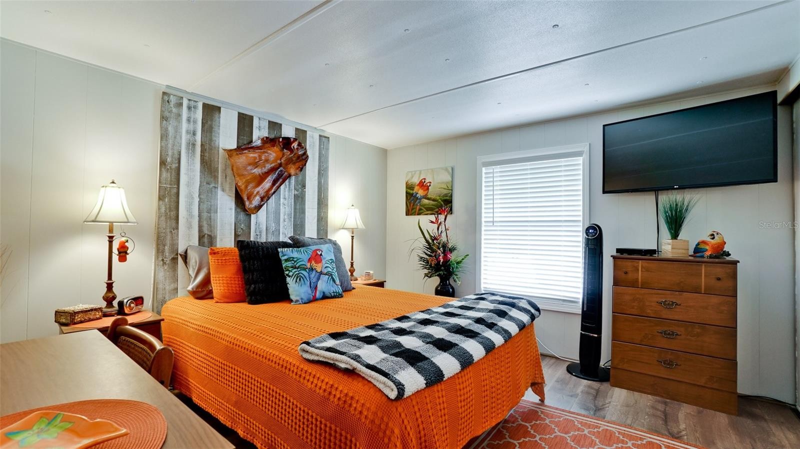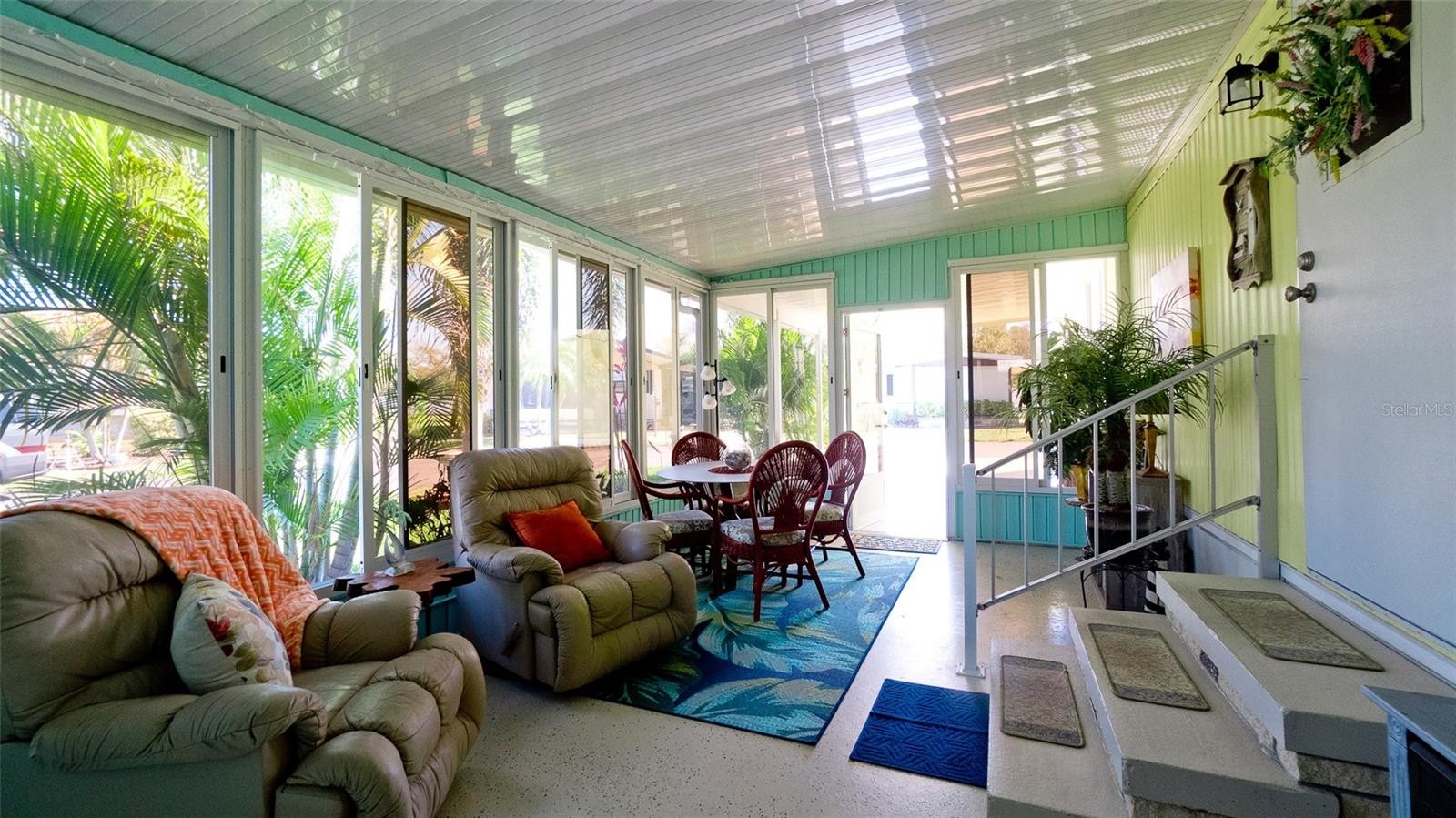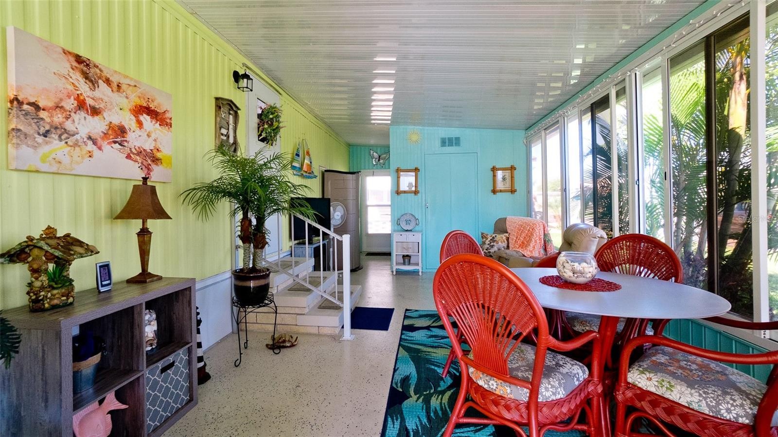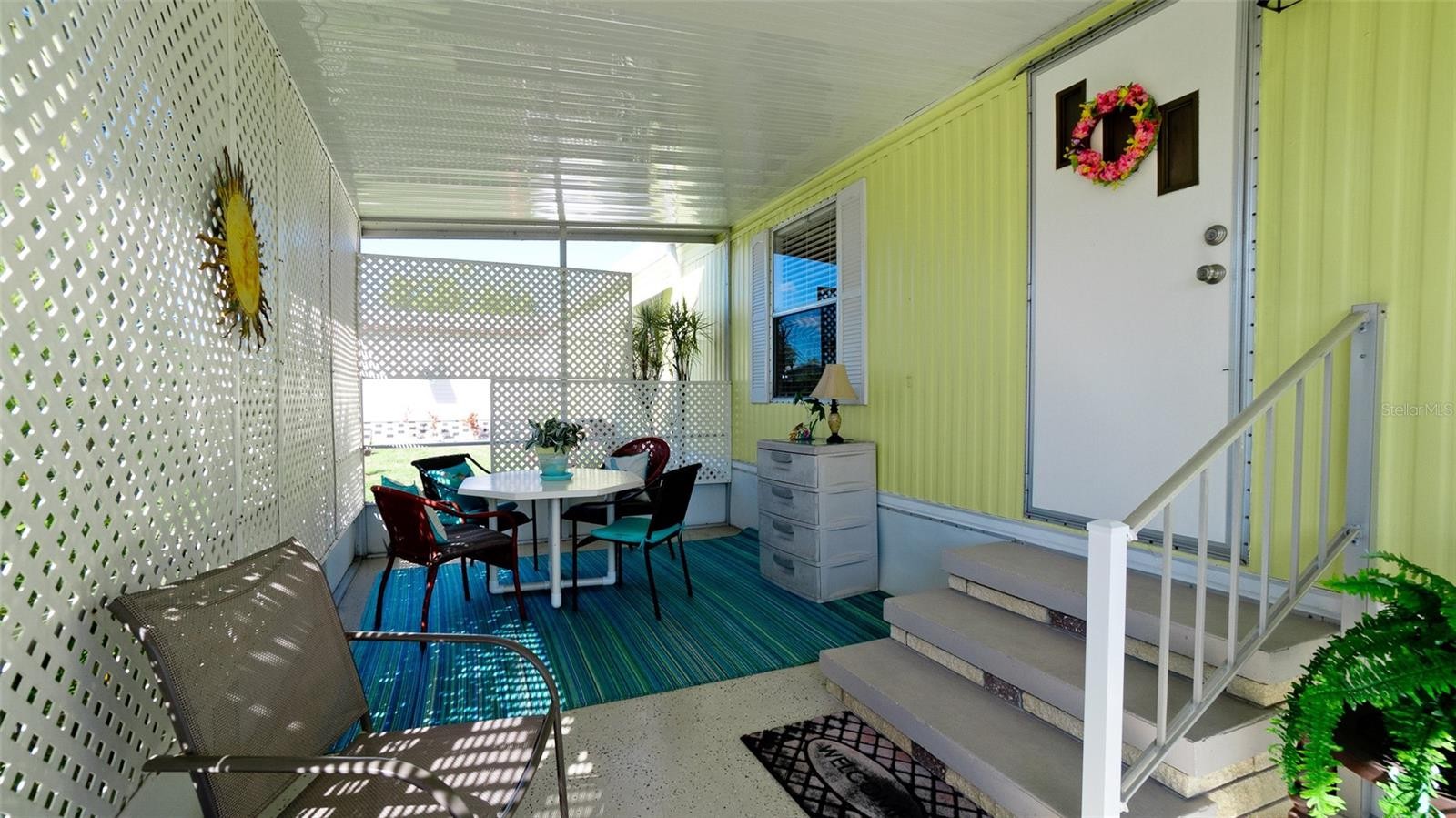 Meticulously Maintained & Move-In Ready! This beautifully cared-for 2 bedroom, 1 bath home offers comfort, style, and exceptional value in a welcoming 55+ community with an active social lifestyle. From the moment you arrive, you’ll notice the pride of ownership and the gorgeous landscaping that surrounds the home. Inside, the kitchen was completely remodeled in 2019 and features beautiful custom cabinetry with soft-close doors, abundant storage, a stylish backsplash, and a convenient breakfast bar—perfect for casual dining or entertaining. In 2020, new flooring was installed throughout the entire home, creating a modern, cohesive look that is both durable and easy to maintain. The bathroom has also been recently updated, featuring a new sink, cabinet with soft-close doors, and a new toilet installed this year. One of the standout features of this home is the additional living space created by two separate lanais which provides wonderful extra space for relaxing, entertaining, or enjoying Florida living year-round. The enclosed lanai, added in 2021, features sliding glass windows with screens along one wall, allowing for abundant natural light and a refreshing breeze. There is also an enclosed space for extra storage. Both lanais feature terrazzo-look painted flooring for a clean, polished appearance. The home is 2 feet wider than most single-wide models, offering a more open and spacious feel. Additional updates include a hot water heater installed in 2021. For added convenience, the home is partially furnished, the bedroom furniture, sofa, dining table and chairs, barstools, 2 recliners on the enclosed lanai and the table and chairs on the open lanai are all included. Located in a pet friendly, amenity-rich community, residents enjoy a very large heated pool, clubhouse with full kitchen facilities, a library, billiards, horseshoe and bocce ball courts, and a vibrant social calendar with activities and events throughout the year. Another great feature is the optional extra storage available for a small yearly fee. The low HOA fees include cable tv, internet, grounds maintenance, sewer, trash and water. If you’re looking for a well-maintained home with modern updates, extra living space, and a welcoming community atmosphere, this one is a must see!