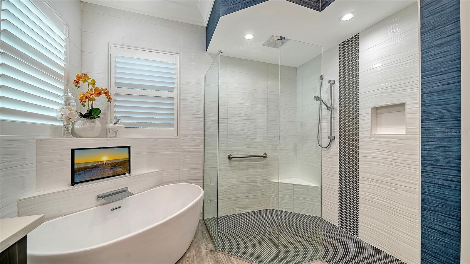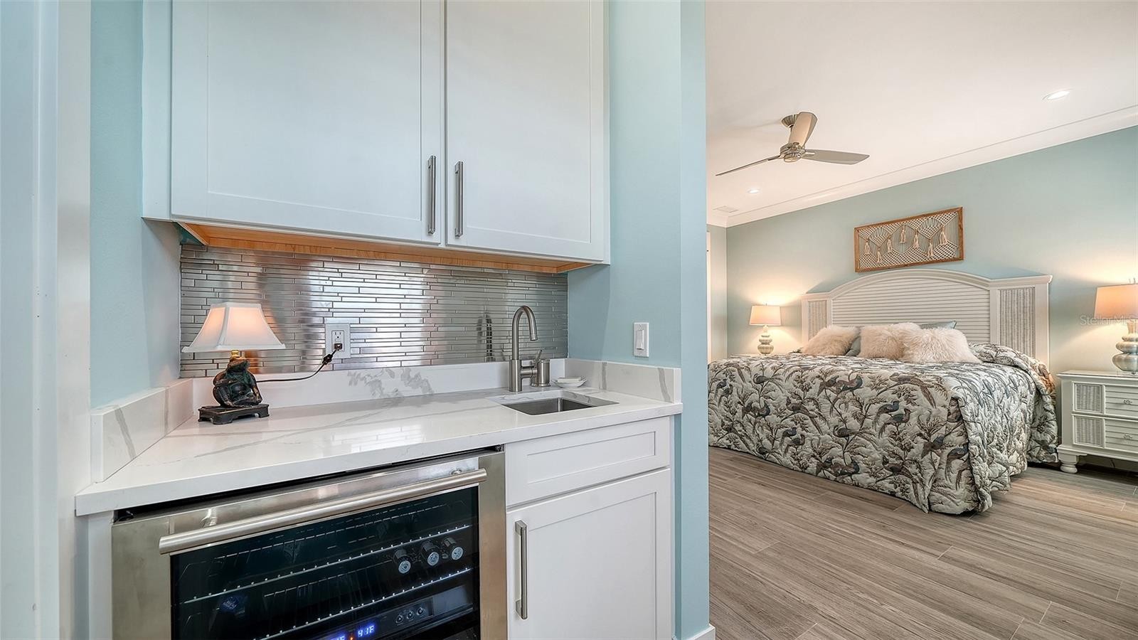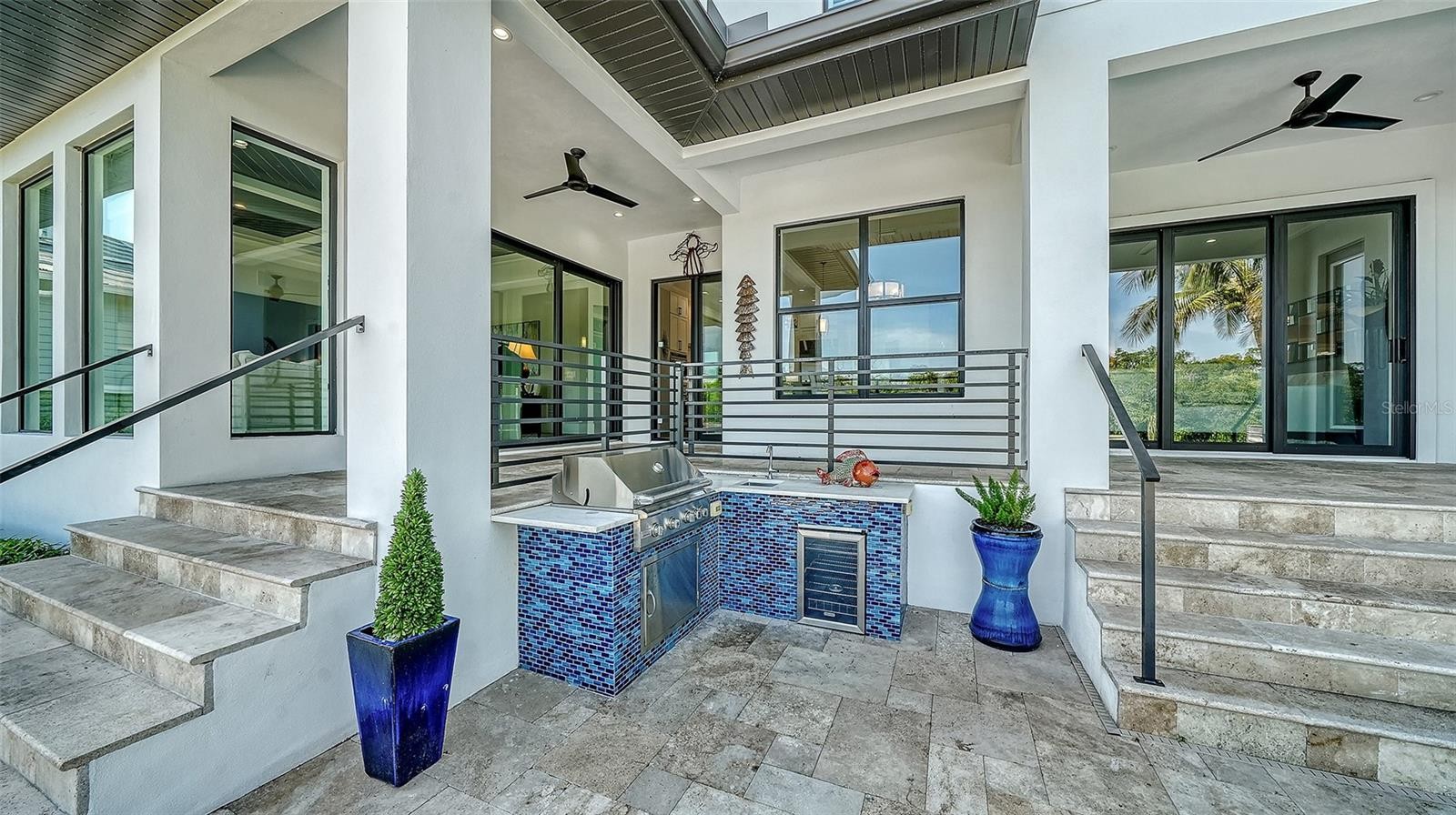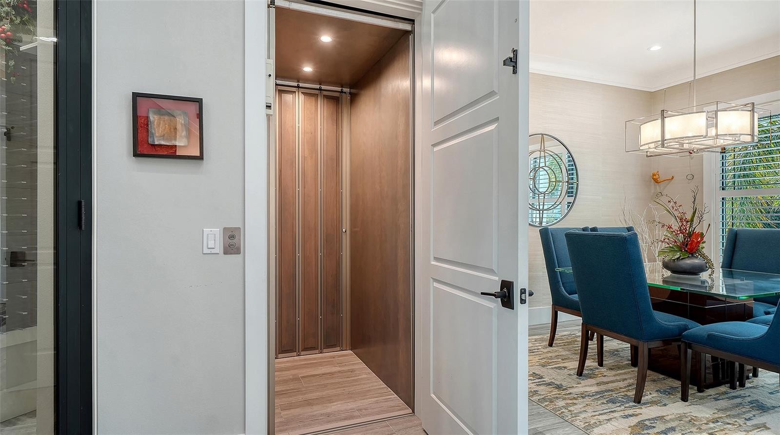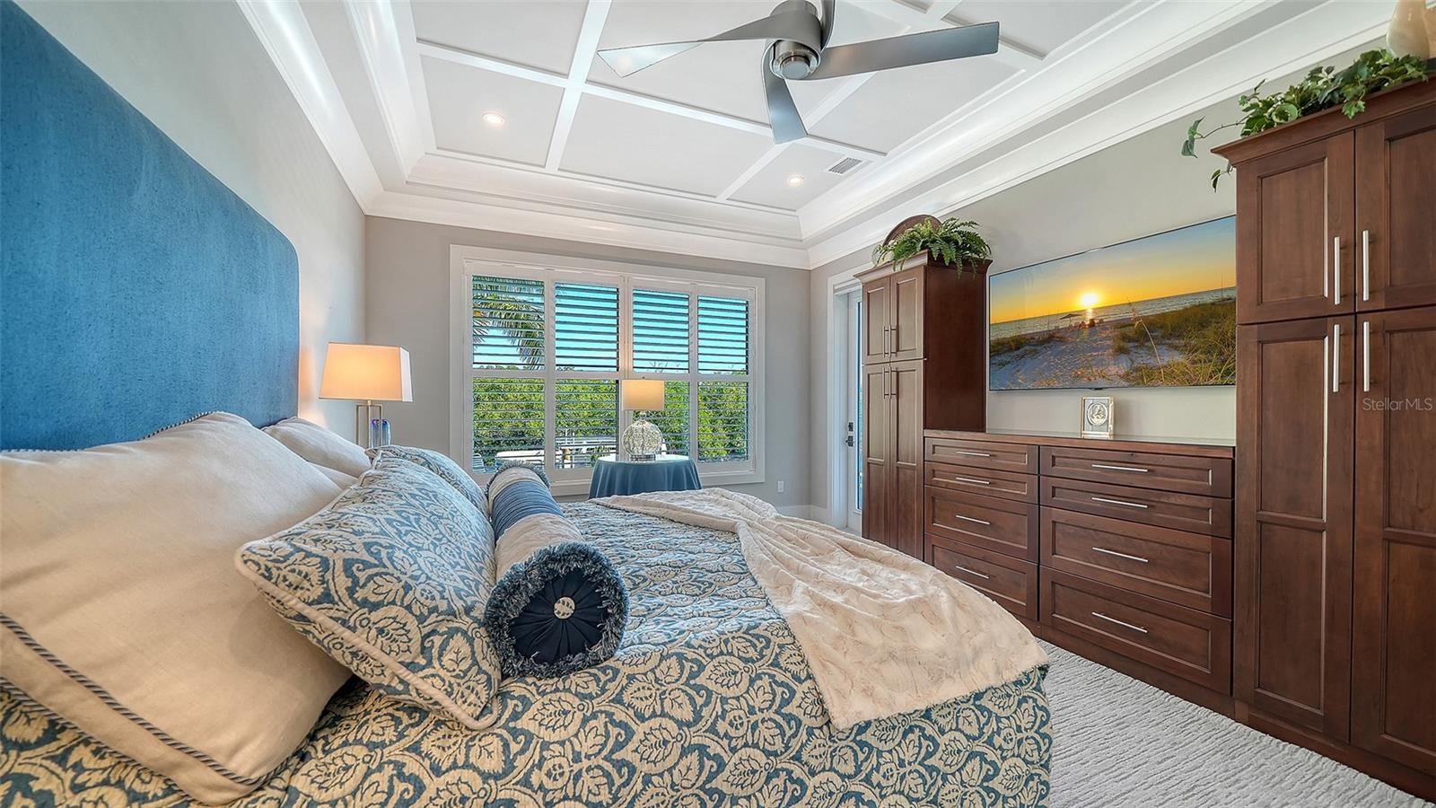 An extraordinary statement of modern coastal elegance, this custom waterfront residence built in 2018 is a masterclass in refined living, where architectural detail, craftsmanship, and setting converge in the coveted enclave of Siesta Cove. Framed by sweeping water views and constructed with hurricane-rated windows and doors, the residence offers both elevated design and enduring peace of mind. Spanning five bedrooms and six full bathrooms, the home is thoughtfully curated for effortless luxury. The primary en-suite retreat on the main level provides a private sanctuary, while light-filled interiors and tranquil water vistas create a seamless connection to the outdoors from nearly every room. The great room commands attention with intricate ceiling artistry, custom built-in shelving, and a sleek electric fireplace—an inviting yet dramatic centerpiece for both intimate evenings and grand entertaining. A temperature-controlled walk-in wine cellar and elegant wet bar elevate the experience further. At the heart of the home, the kitchen is a vision of light and sophistication, featuring new designer Cambria countertops, double ovens, built-in refrigerated drawer and a built-in freezer drawer, a generous walk-in pantry, and a welcoming eat-in layout complemented by an adjacent breakfast bar. Plantation shutters and discreet electric blinds throughout the home enhance the ambiance with effortless control of light and privacy. A richly appointed den or office behind French doors offers quiet refinement, while a sweeping staircase ascends to an upper level designed for both comfort and indulgence. Here, a spacious bonus room opens to a private screened balcony, ideal for sunrise reflections or sunset cocktails. Four additional bedrooms include three luxurious en-suite accommodations and a fourth with a dedicated full bath just beyond. One suite is distinguished by its own wet bar with refrigeration for morning coffee or evening refreshment, along with custom built-in closet drawers—an unexpected touch of indulgence. The outdoor living experience is nothing short of resort-caliber. A sparkling pool and spa, enhanced by a new electric pool heater, are complemented by an outdoor shower, built-in grill, and beverage cooler—creating a private oasis for entertaining under the stars. Boaters will appreciate the 39-foot private dock with water, electric, and lift, just moments (only 3 properties away) from the Intracoastal Waterway. Additional features include an elevator servicing all levels from the oversized three-car garage, abundant storage, a fully fenced yard, and lush, mature landscaping that envelops the property in privacy and beauty. Perfectly positioned near world-class beaches, upscale shopping, and fine dining, this exceptional Siesta Cove residence is more than a home—it is a lifestyle defined by grace, comfort, and uncompromising waterfront luxury.
