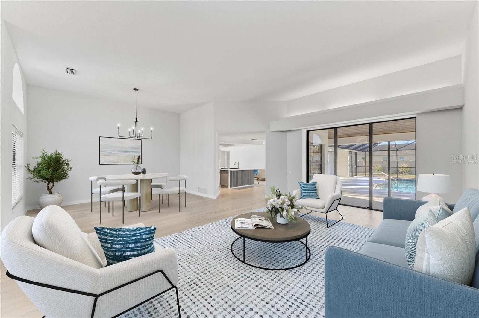 Fully reimagined with intention and thoughtful design, this spacious pool home offers a rare combination of architectural character and modern updates within a quiet, established neighborhood setting. Step through the double front doors into an expansive living and dining great room where soaring vaulted ceilings and arched transom windows create an immediate sense of light and openness. This welcoming space sets the tone for the entire home - airy, elevated, and designed for gathering. From there, the layout flows seamlessly into the kitchen and family room, creating a natural connection between entertaining and everyday living. The kitchen features granite countertops, shaker cabinetry, a statement hood, and an oversized island wrapped in vertical fluted wood detailing that adds warmth and architectural interest. Above, a recessed tray ceiling with inset panel accents enhances the custom feel of the space. The adjoining family room is anchored by a striking fireplace feature wall finished in painted horizontal shiplap and complemented by custom built-in shelving. Multiple sliding glass doors extend the living space directly to the screened lanai and sparkling pool, creating the perfect Florida lifestyle setting. Indoor and outdoor living blend effortlessly, whether hosting friends, enjoying family time, or relaxing poolside under the covered patio. The primary suite serves as a private retreat with direct lanai access, generous proportions, and a spa-inspired bathroom featuring a frameless glass walk-in shower, soaking tub, and spacious walk-in closet with abundant storage. Secondary bedrooms are well-sized and thoughtfully arranged, offering flexibility for guests, family, or a dedicated office. Spacious, light-filled, and designed for effortless indoor-outdoor living, this is the kind of home that simply feels right the moment you walk in. Designed for connection, comfort, and the best of Florida living, this is the complete package. Homes with this level of volume, privacy, and thoughtful renovation do not stay available for long. Schedule your private showing and experience it for yourself.