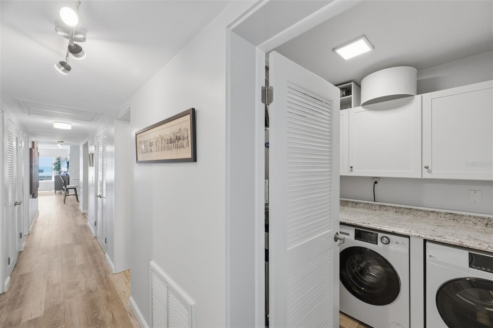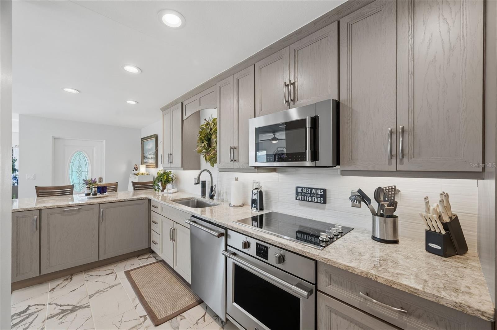 Coastal luxury living in this 2nd floor condo with unobstructed views of the gulf and 2 pools. Whether you are entertaining guests or working from the home office area or just seeking serenity this condo delivers. Direct access to the gulf to enjoy the beach and great views of sunsets from the beachfront sundeck. The kitchen boasts top of the line stainless appliances, sleek quartz countertops, and a breakfast bar that opens up to the Great Room. The Primary Bedroom has a full wall of built in closets, with ensuite bath. The Guest Bedroom features a built in Murphy Bed with ample closet space. The Hallway Full-size bath has a Euro-style vanity with shower/tub combination. The convenient Laundry Room has an extra sink with lots of storage. Additional storage space just outside the backdoor is perfect for stowing away beach gear. This is all set within a lush newly landscaped Gulf-front 55+ community, which features only 11 casitas (four condos each). This unit's building did NOT flood in the recent hurricanes, and the parking spot, located conveniently by the back door did not flood. The tile roofs were updated in 2023 before the storms and had minimal wind damage. All new hurricane windows and window treatments were installed in this unit July of 2024. Brand new hurricane rated carports were installed fall of 2025. Luxury vinyl plank flooring thru-out with ceramic flooring in the kitchen and baths are durable and elegant. Location is convenient to shops and restaurants just a few blocks away.