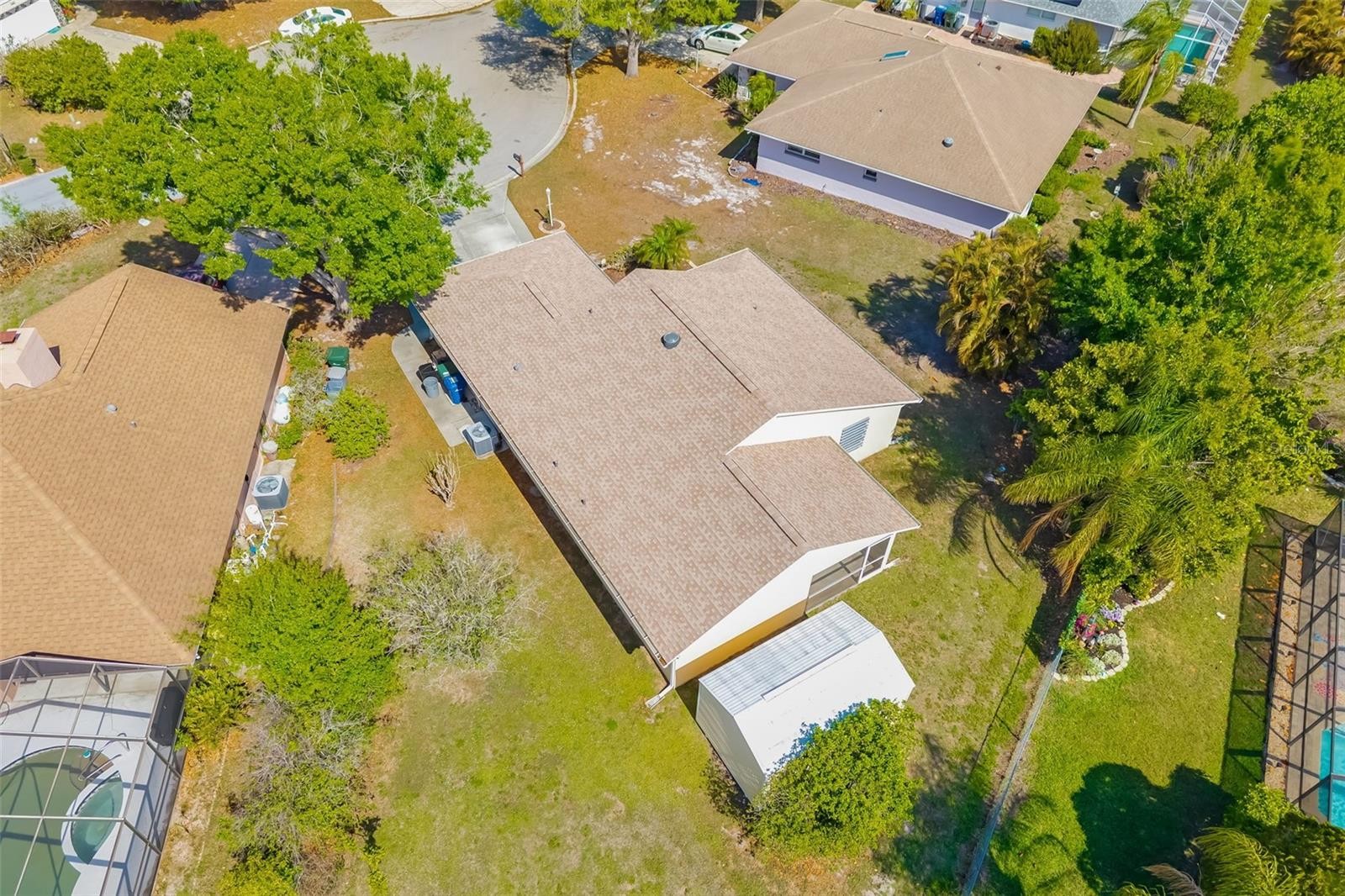 Nestled on a quiet cul-de-sac in the sought-after Woods community, this charming 3-bedroom, 2-bathroom home offers 1,410 square feet of comfortable Florida living — priced at appraised value and ready for its next chapter. From the moment you arrive, the wide concrete driveway, mature tropical landscaping, and inviting curb appeal set the tone. Step inside to a bright, open living space with soaring vaulted ceilings and ceiling fans that keep the Florida breeze flowing year-round. Neutral carpet and a clean, move-in-ready palette make it easy to envision your personal touch throughout. The kitchen is both stylish and functional, featuring white shaker-style cabinetry, rich dark granite countertops, a double stainless steel sink, and white appliances — all bathed in natural light from a garden window overlooking the lush backyard. A convenient dining nook with light wood flooring and pendant lighting sits just off the kitchen, perfect for everyday meals or entertaining. All three bedrooms are generously sized with ceiling fans and plush carpet. The primary suite is a true retreat, boasting direct access through sliding glass doors to the screened lanai, a walk-in closet, and a private en-suite bath with a wood vanity, stone countertop, brushed nickel fixtures, and a glass-enclosed walk-in shower. Out back, the screened lanai with its own ceiling fan is the ideal spot to enjoy Sarasota's beautiful weather in comfort — overlooking a fully fenced, private backyard with a storage shed for all your extras. A spacious 2-car garage with built-in workbench rounds out this home's practical appeal, along with a dedicated interior laundry room. Located just minutes from Benderson Park, University Town Center, and Bobby Jones Golf Course, and with easy access to I-75 and all that Sarasota has to offer — this one checks every box. Don't miss your chance to own in The Woods at appraised value!