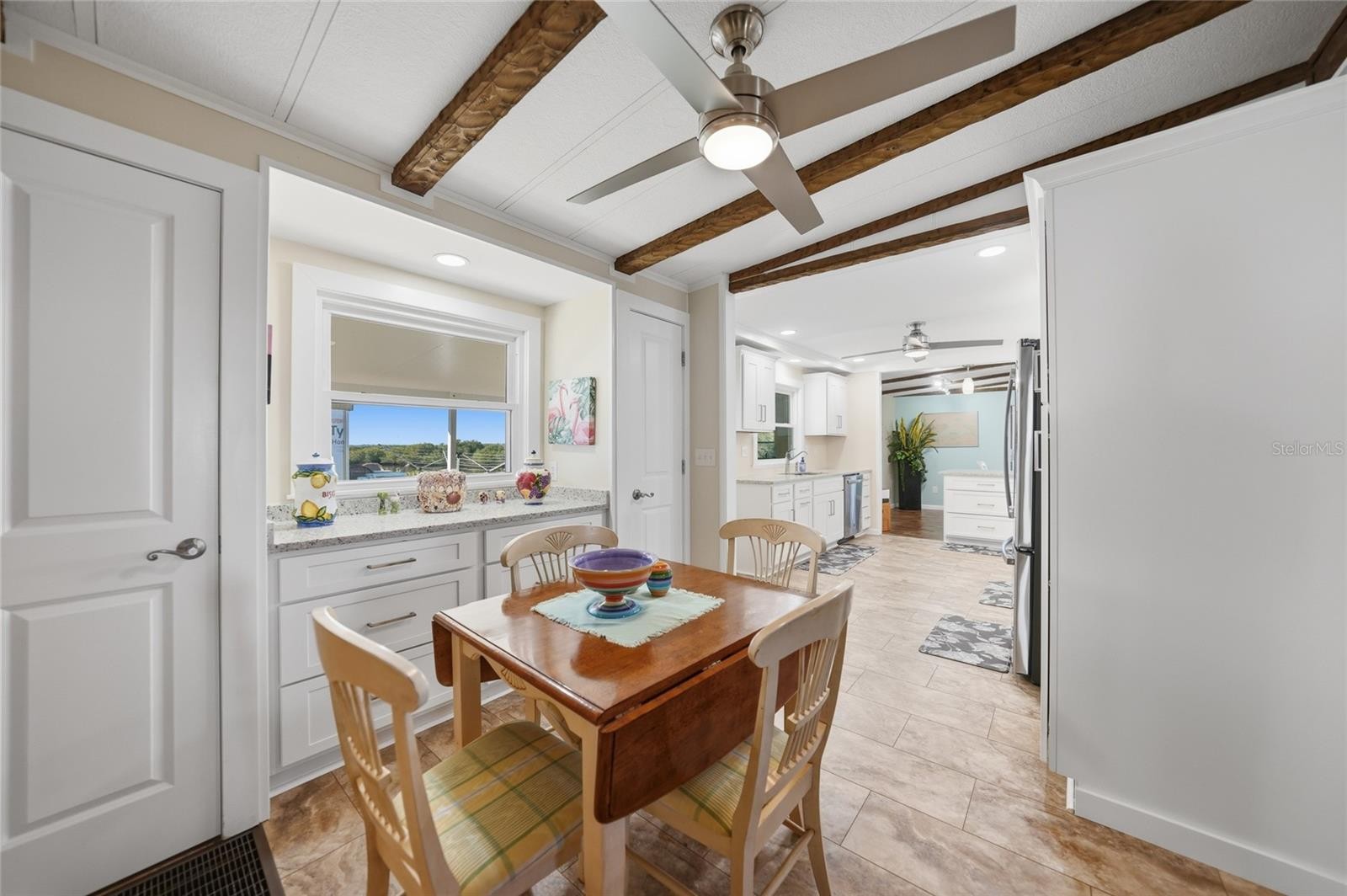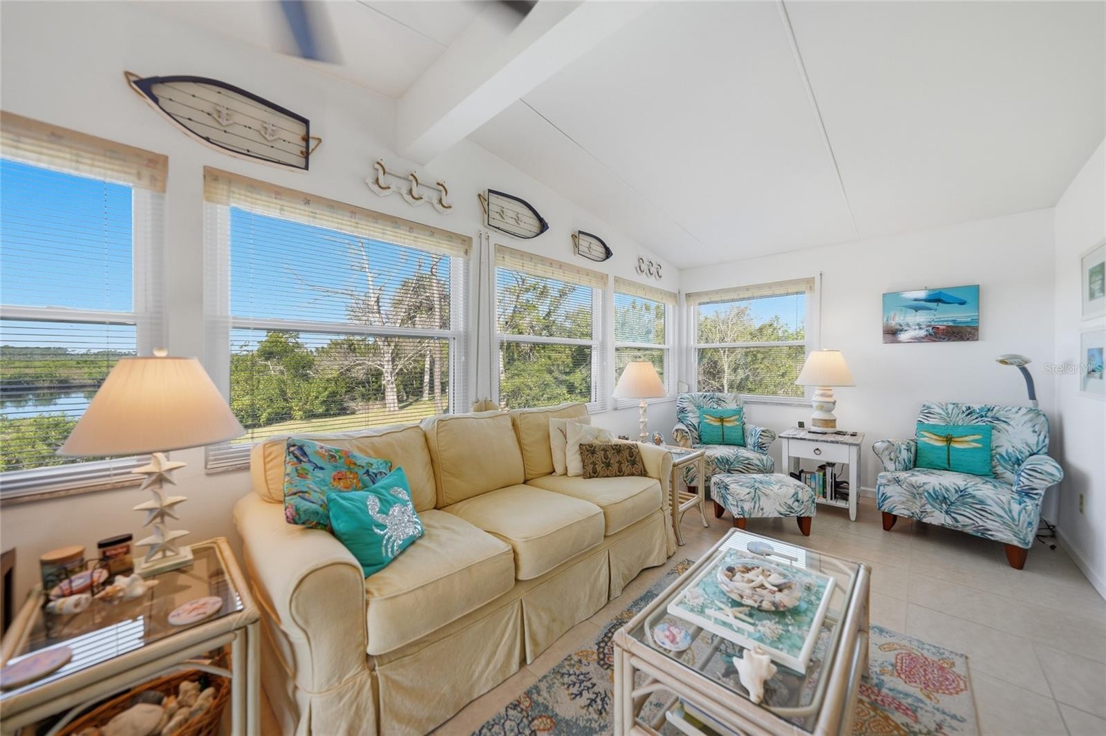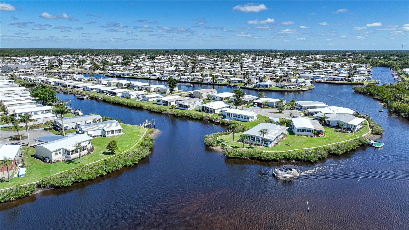 WATERFRONT LIVING AT ITS FINEST! This unique TURNKEY FURNISHED home is ideally situated at the end of a quiet cul-de-sac on the Myakka River. Extensive upgrades have been completed: Roof, Carport, Shed 2023, HVAC 2020, new water lines, subflooring, tie-downs, ductwork, an updated electrical panel, Bahama Shutters on all windows, metal roll-down shutters on Florida room windows, and an accordion shutter on lanai sliding door. Public water/sewer. This home features vaulted ceilings with real wood beams in the living, dining, and breakfast areas, creating a warm and inviting coastal feel. The kitchen has been completely remodeled in 2020 with high-quality white shaker cabinetry, including a spacious 36" pantry with 4 pull-out shelving, a cabinet for storing larger countertop appliances, and ample storage throughout. Granite countertops extend to a large (approx) 4' x 8' peninsula with seating for four and additional storage. Additional highlights include a deep double stainless sink with instant hot water, stainless steel appliances, and recessed lighting that create a bright, inviting space. The dining room features a dry bar with matching kitchen cabinetry and granite countertops. A painted shiplap accent wall in the breakfast room adds a pop of color with dual closets providing additional storage. Primary bedroom remodeled in 2023; features new insulation, ceiling, waterproof vinyl plank flooring, fresh paint, ceiling fan, and two walls of windows for natural light. Remodeled spa-like primary bath with a custom tiled walk-in shower with bench and niche, dual granite vanity that complements the tile flooring, and an extra-large walk-in closet. The guest bedroom features an updated ceiling, a new fan, and fresh paint. The guest bath was updated in 2020 with a marble-top vanity and waterproof vinyl flooring. Designed for gatherings, this home offers multiple seating areas for relaxing or entertaining, with space for dining, game nights, or watching the big game. The enclosed lanai with Tiki bar provides the perfect setup for outdoor entertaining and barbecues. A long, extended driveway, professionally sealed and coated, offers ample parking. Exceptional privacy with lush natural vegetation and no rear neighbors across the canal. Enjoy peaceful waterfront views of the river, where dolphins, manatees, and a variety of birds are frequent visitors, along with stunning Southwest Florida sunset skies each evening. The Myakka River flows into Charlotte Harbor, which opens to the Gulf of Mexico. Approximately a 1-hour boat ride from Harbor Cove to the Gulf, depending on speed and conditions. Experience the best of Florida’s retirement lifestyle; Harbor Cove, a sought-after 55+ waterfront community along the scenic Myakka River, filled with resort-style amenities. NO LOT rent. Monthly HOA fee is $175 per month; includes lawn care and access to Resort-style amenities with two sparkling heated pools, a relaxing spa, a well-equipped fitness center, a clubhouse overlooking the stunning 90-slip Marina, shuffleboard, horseshoes, pickleball, tennis, and bocce courts. Socialize and stay active with dances, parties, water aerobics, fitness classes, art classes, woodworking, golf cart parades, bingo, dances, and more. Boat clubs, a craft room, picnics on the patio, golf clubs, and much more. Conveniently located within minutes of Downtown Wellen Park and a short drive to beautiful Gulf Beaches.