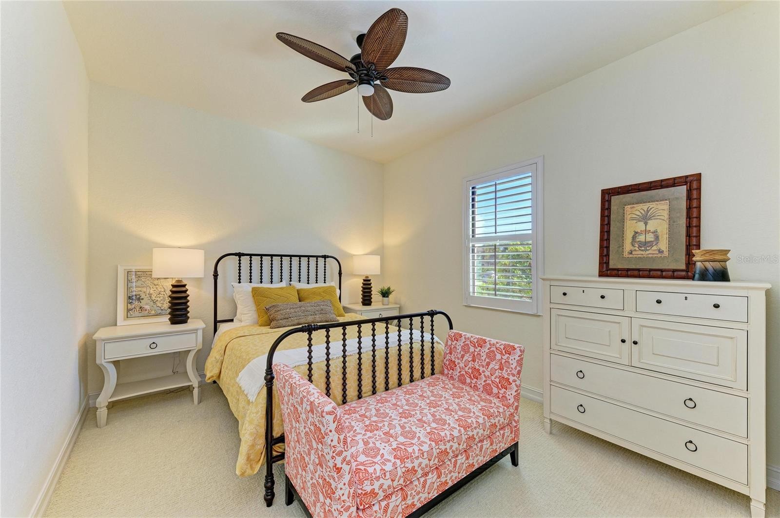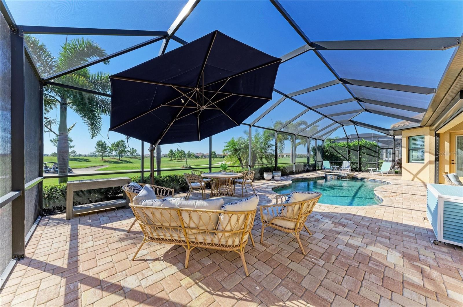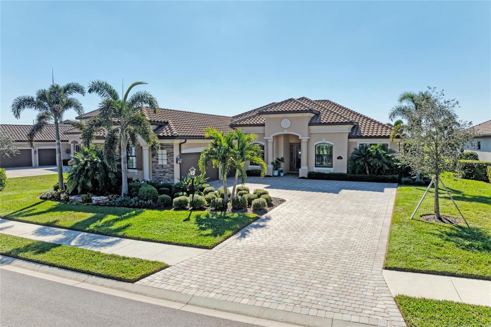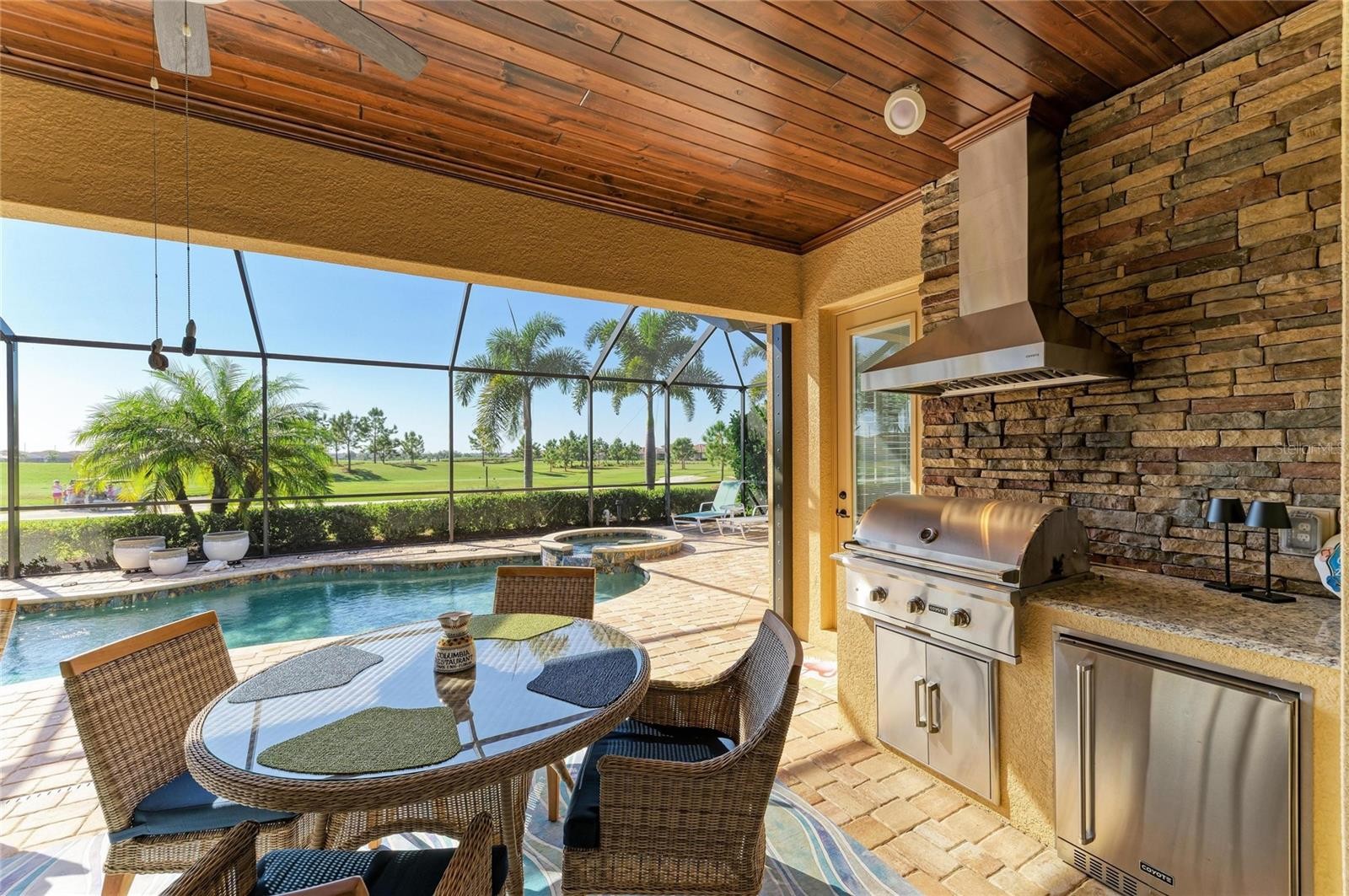 Welcome to this refined residence in the highly sought-after Lakewood National Golf Club community in Lakewood Ranch. This four-bedroom, two-and-one-half-bath home spans 2,390 interior square feet and offers a total of 3,423 square feet of exceptional living space. The thoughtfully designed floor plan includes a fourth bedroom currently configured as a home office, featuring custom shelving, a Queen Murphy bed, and privacy French doors. The primary suite presents tray ceilings, designer finishes, and new carpeting, while the main living areas are enhanced by upgraded plank tile flooring and designer wallpaper with a coastal paint theme. A spacious kitchen serves as the home’s centerpiece with expansive counter space, a breakfast nook, natural gas for cooking, and stainless-steel appliances. The adjoining dining room and living room both feature tray ceilings and crown molding, complemented by upgraded lighting throughout the interior. Outdoor living is elevated by a south-facing lanai with a tongue-and-groove wood ceiling, a heated pool and spa, a fully equipped summer kitchen, and sweeping views of the 16th and 17th holes of the Piper golf course. Additional highlights include impact windows and doors, a hurricane-rated lanai power screen, upgraded landscaping, and a three-car garage. Residents of Lakewood National Golf Club enjoy deeded golf membership giving owners the ability to play 36 holes of championship golf year-round. In addition to the Piper course, membership at Lakewood National Golf Club includes playing the Commander course which was named No. 1 Golfers’ Choice and No. 1 Top Course in Florida by Golf Advisor. Lakewood National Golf Club offers gated, maintenance-free living with extraordinary amenities that include 36 holes of Arnold Palmer-designed golf courses, a zero-entry heated pool with cascading waterfalls and lap lanes, poolside tiki bar and café, fitness center with group exercise classes, an on-site full-service spa, eight lighted Har-Tru tennis courts, bocce, pickleball, several satellite pools, and a stunning 28,000-square-foot clubhouse which offers fine and casual dining, an expansive bar and lounge, men’s and ladies lounges and locker rooms, conference and meeting space, a full-time lifestyle director who keeps residents’ social life fun and active with trivia night, karaoke night, live concerts on the green, extravagant holiday parties, wine-tasting dinners and more. Lakewood National Golf Club hosts the annual Korn Ferry Tour’s LECOM Suncoast Classic. This home is move-in ready and furniture is for sale outside the contract.