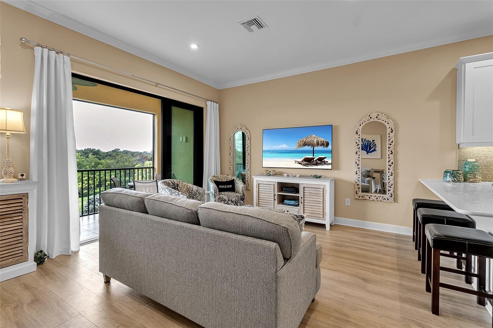 Welcome to 5589 Cannes Circle—an exceptional waterfront townhome in the gated community of Phillippi Landings, where refined design meets effortless Florida living. Perfectly positioned along Phillippi Creek, this residence offers tranquil water views and a rare sense of privacy, all just minutes from The Landings Shopping Center, Siesta Key, and downtown Sarasota. This impeccably maintained three-story home features 4 bedrooms, 3 full baths, and a bright, open-concept layout designed for both everyday comfort and entertaining. Soaring ceilings, abundant natural light, and thoughtfully selected finishes create a clean, contemporary aesthetic throughout. The designer kitchen is equipped with solid surface countertops, stainless steel appliances, 42” cabinetry, and an oversized island that flows seamlessly into the main living space. Multiple outdoor living areas—including two private lanais—invite you to enjoy the peaceful creek views and lush tropical surroundings. A private elevator provides access to all levels, while the oversized garage offers generous storage for boats, kayaks, beach gear and more. Built with quality and efficiency in mind, the home includes impact-rated windows, energy-efficient systems, LED lighting, and durable finishes such as beautifully maintained engineered wood flooring throughout. Additional upgrades include Moen fixtures, Kohler plumbing features, and professionally designed landscaping within the community. Offered in immaculate, move-in ready condition, this residence is available to purchase furnished for a turnkey experience or unfurnished to suit your personal style—making it an ideal full-time home, seasonal retreat, or turnkey investment opportunity. Furnishings offered separately. Residents of Phillippi Landings enjoy a resort-style lifestyle with amenities including a heated pool, fitness center, dog park, clubhouse, kayak launch, and a scenic boardwalk along the water. The adjacent Phillippi Harbor Club marina offers convenient access for boating enthusiasts. This is a rare opportunity to own a waterfront-facing home in one of Sarasota’s most desirable communities. Call today for a private showing!