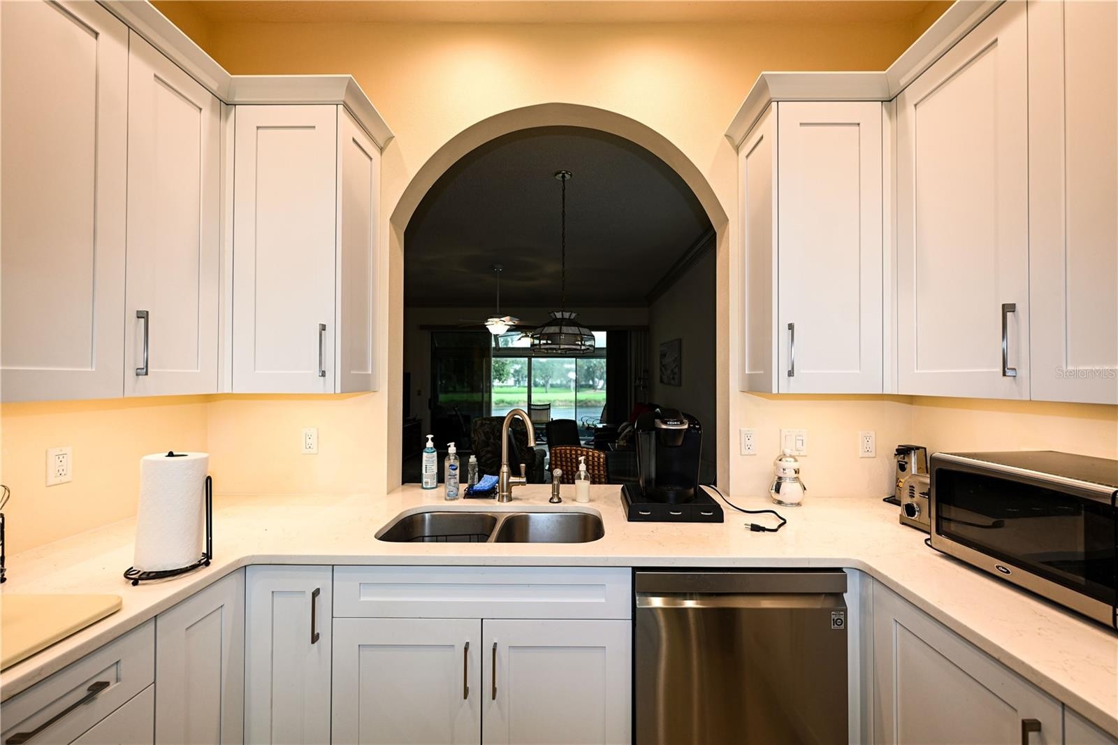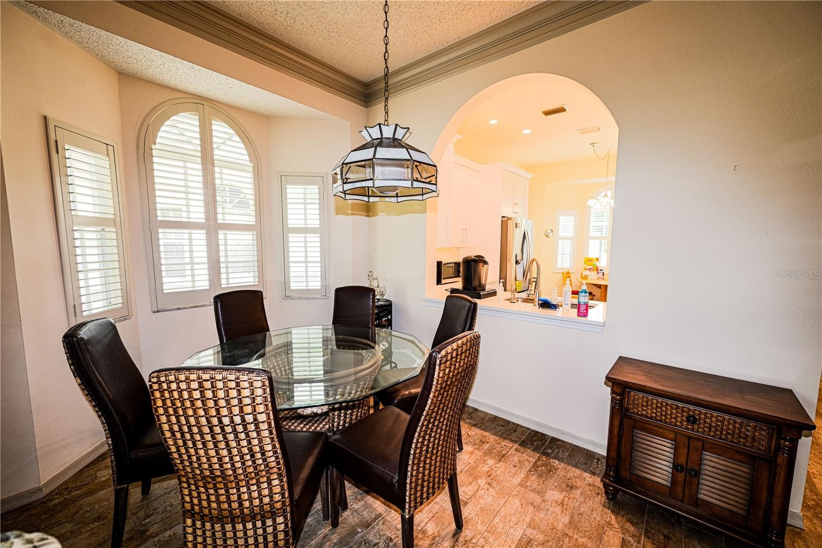 Virtual tour link in MLS is actual 3D tour, not a slideshow - please visit it! Furniture is optional with listing. Welcome to this beautifully maintained 2-bedroom, 2-bath villa located in the highly desirable Long Common enclave within The Meadows. This single-story home offers 1,264 square feet of bright, open living space, ideal for those seeking a low-maintenance Florida lifestyle. Step inside through a charming courtyard entry with a brick-paver driveway and a 2-car garage. Inside, the great room impresses with high ceilings, crown molding, and direct access to a Florida room that features a panoramic view of the pond and fairway in the distance—perfect for relaxing or entertaining year-round. The kitchen features stainless appliances, stone countertops, a cozy bay-window breakfast nook, and a convenient pass-through to the living and dining areas. A split-bedroom floor plan ensures privacy, with the primary suite offering a walk-in closet, dual sinks, and a walk-in shower. Residents of The Meadows enjoy access to three golf courses, tennis and pickleball courts, a Jr. Olympic-sized heated pool, clubhouse, fitness center, and miles of scenic walking and biking trails. The community is also ideally located near Nathan Benderson Park, the upcoming Mote Marine Aquarium, University Town Center Mall, and a wide variety of shopping, dining, and cultural attractions in downtown Sarasota.