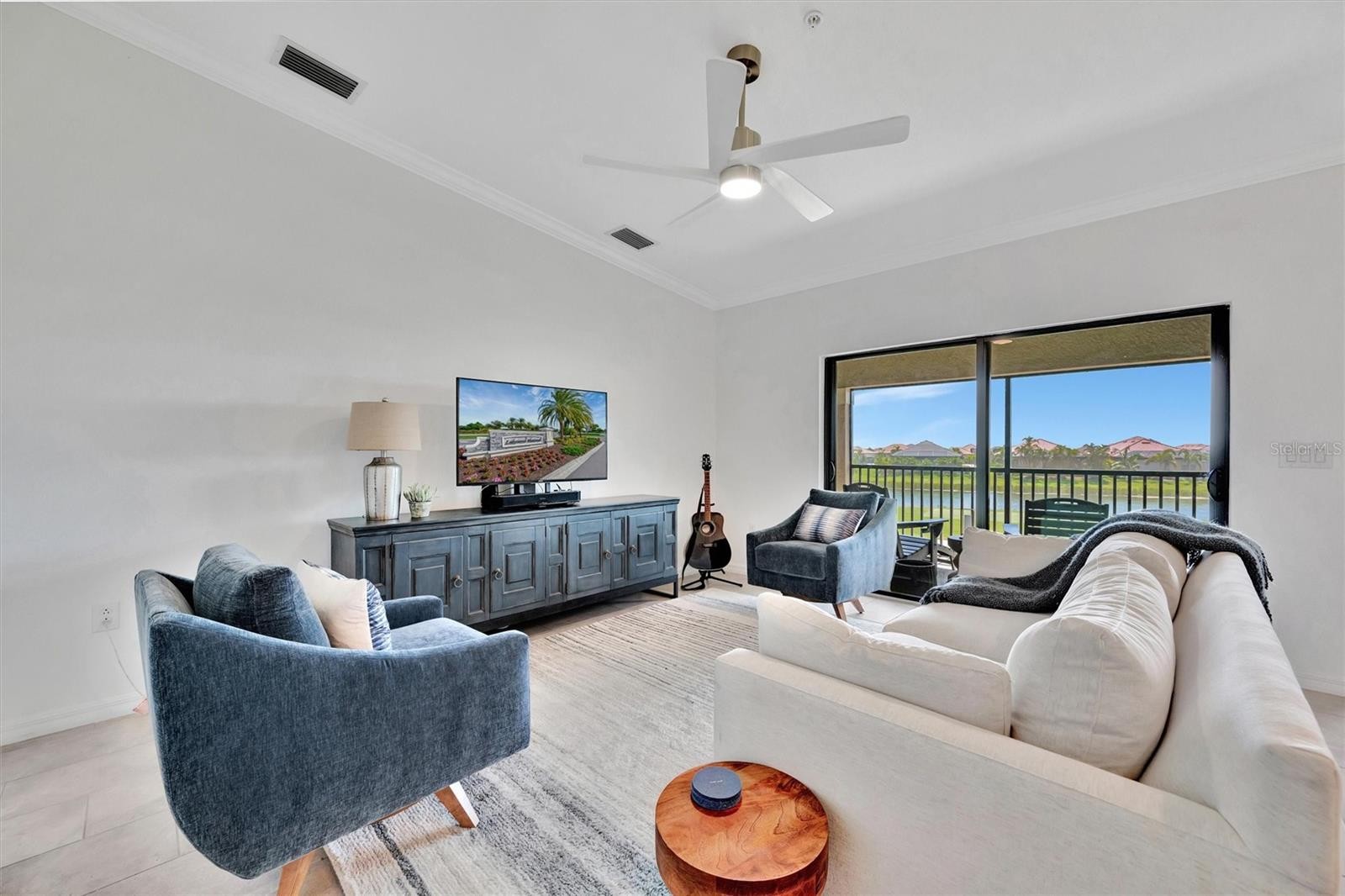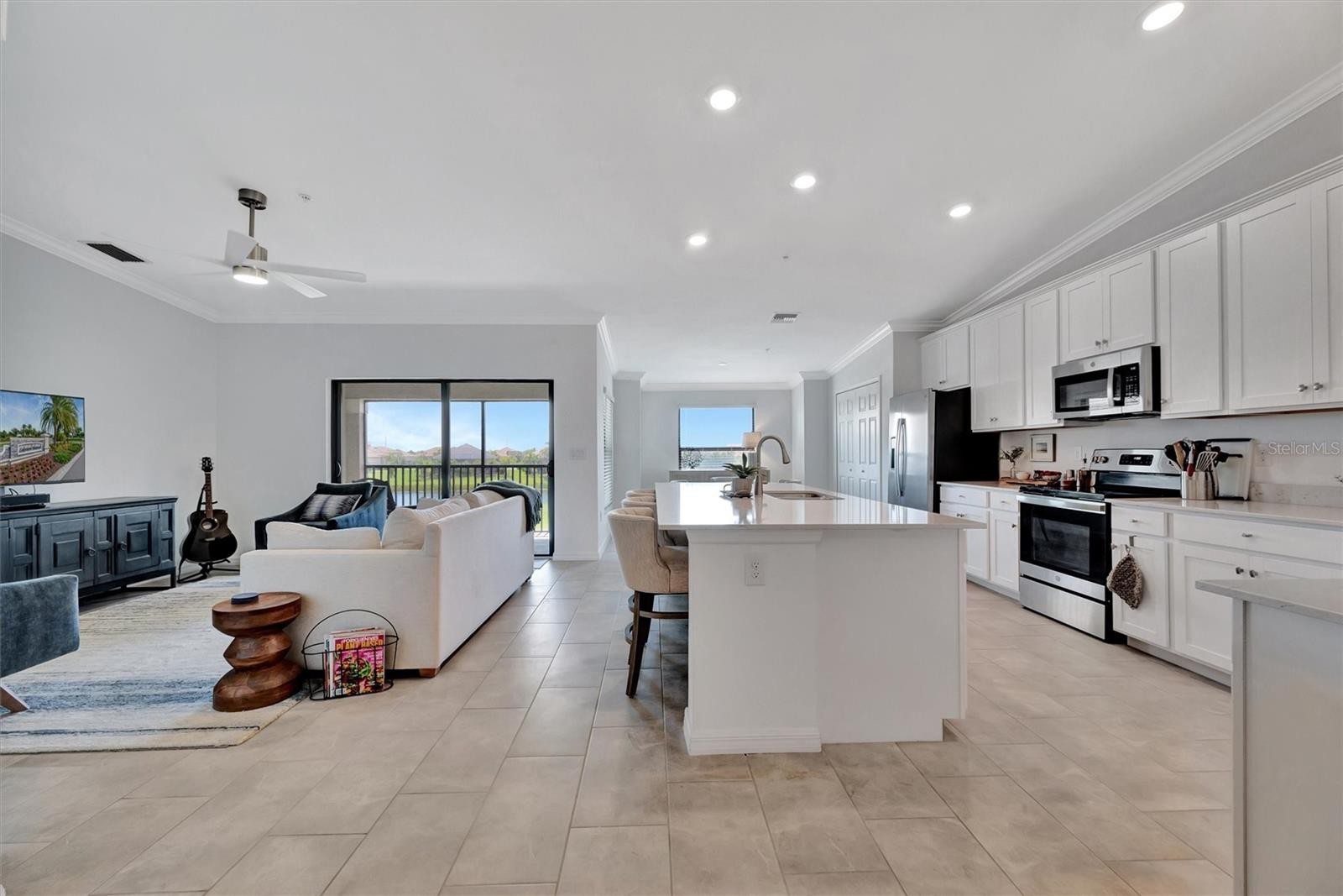Welcome to one of the last Veranda buildings that was built in Lakewood National.This 2-bedroom, 2-bath condo with den and a one-car garage offers an open-concept floor plan, featuring a bright and modern kitchen with white cabinets,quartz countertops, GE stainless steel appliances, and a spacious island. The open living and dining areas extend into a private screened lanai, where you can enjoy breathtaking golf course and water views of the 9th hole of the Piper course. The primary suite is complete with two walk-in closets, en-suite bath with quartz countertops, dual sinks and a walk-in shower. A spacious den can be used as a home office or additional guest space, as well as the second bedroom and full bath This home includes membership and unlimited access to 36 holes of championship golf designed by Arnold Palmer. In addition to world-class golf, Lakewood National offers seven resort-style pools, four pickle ball courts, eight har-tru tennis courts, state-of-the-art fitness center, spa, Tiki Bar,clubhouse with fine dining and 24 hour security. Located close to I-75, downtown Sarasota, SRQ International Airport, and Gulf Beaches.Lakewood Ranch is America's favorite place to call home since 2018. --