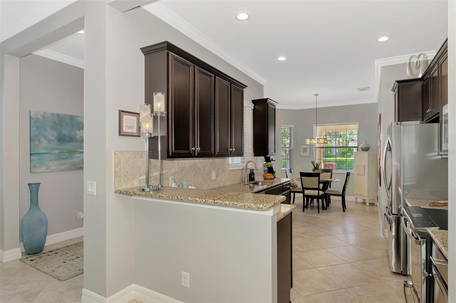 Exquisitely updated 3 bedroom, 2 bath home in The Isles of Sarasota on Palmer Ranch. This well-maintained, single family, 2 car garage home blends comfort and style for easy Florida living. High ceilings, 8' interior doors and tile on the diagonal in the livings areas creates a bright, expansive feel throughout. The open floor plan seamlessly connects the living, dining and kitchen areas- ideal for entertaining or relaxing with family. Elegant crown moulding adds a touch of sophistication, while large sliders and windows fill the space with natural light. The oversized private screened lanail, is perfect for morning coffee, gatherings, or just enjoying your own privacy. The lanai features paver bricks and 2 remote-controlled hurricane screens which secure a location for lanai furniture during storms. This is the Kendall floor plan, built by DiVosta, which offers steel-reinforced concrete block construction and professionally engineered roof trusses with hurricane tie-downs for wind protection. The kitchen has 42" upper wall cabinets, Genie shelving, modern stainless steel appliances and granite countertops accompanied by classy backsplash. Adjoining the kitchen is a breakfast nook. The primary bedroom has 1 walk-in and 1 built-in closet and an en-suite bathroom with a shower, separate bathtub & 2 sinks/granite countertops. There are custom built shelves in all closets. Stylish fans and lighting have been added. The yard has been lavishly landscaped with beautiful trees and plants. The Isles is a maintenance-free community. Cable TV and internet is included in the HOA fees. Socialize & make new friends in The Isles at the many community functions. There are 4 tennis courts, 2 pickle ball courts, 2 bocce courts, basketball court, tot-lot, state of the art fitness center and resort-style, heated swimming pool for your enjoyment. The Isles is close to the world-renowned Siesta Key Beach, fine dining, doctors, the new Sarasota Memorial Hospital, golf courses, Legacy Trail and all the cultural venues downtown Sarasota has to provide. The Isles has an active pickleball and tennis community.