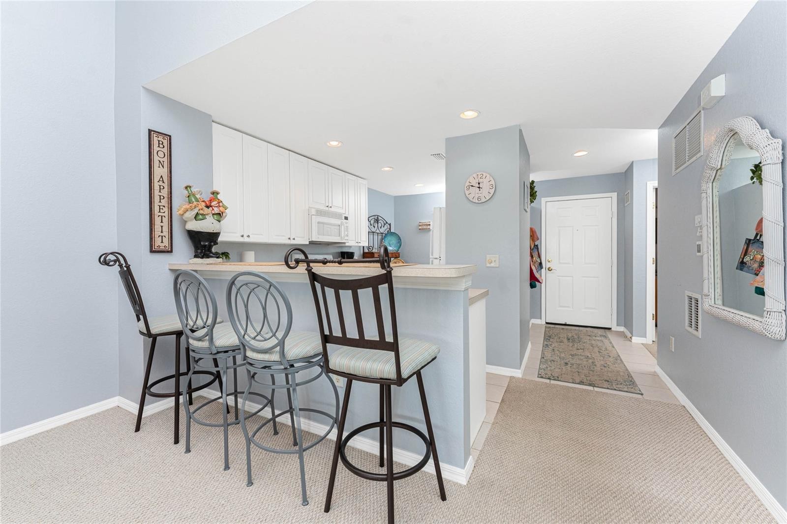 Lakefront turnkey condo in The Colony at Sabal Trace! This second-floor end unit offers 2 bedrooms, 2 full baths, a den, and comes fully furnished, making it ready for immediate enjoyment. Located in the secure, gated community of The Colony at Sabal Trace, you’ll appreciate the tropical landscaping, a private one-car garage with room to park another vehicle just outside, plus plenty of guest parking. Inside, you’ll find a bright and open layout. The kitchen is designed for both function and style with 42-inch cabinets, a large pantry, bar seating, and a dining nook. The living and dining areas flow seamlessly to the screened lanai, where wide lake views provide a peaceful backdrop. The primary suite overlooks the water and offers two closets, including a walk-in, along with an ensuite bath featuring a walk-in shower, private water closet, and pocket doors. The guest bedroom is located near the second full bath with a tub/shower. The versatile den is currently set up as a dining room but could also be used as a den, office, or extra bedroom. A laundry closet with stackable washer/dryer is conveniently located near the second bathroom. There is also an extra storage closet just outside the front door of the unit. The Colony at Sabal Trace offers resort-style amenities including a heated pool, clubhouse, billiards, ping pong, and fitness center—all with low-maintenance living and low condo fees. With comfortable finishes, tasteful furnishings, and tranquil lake views, this condo is a great opportunity to enjoy the relaxed Florida lifestyle. Schedule your showing today!