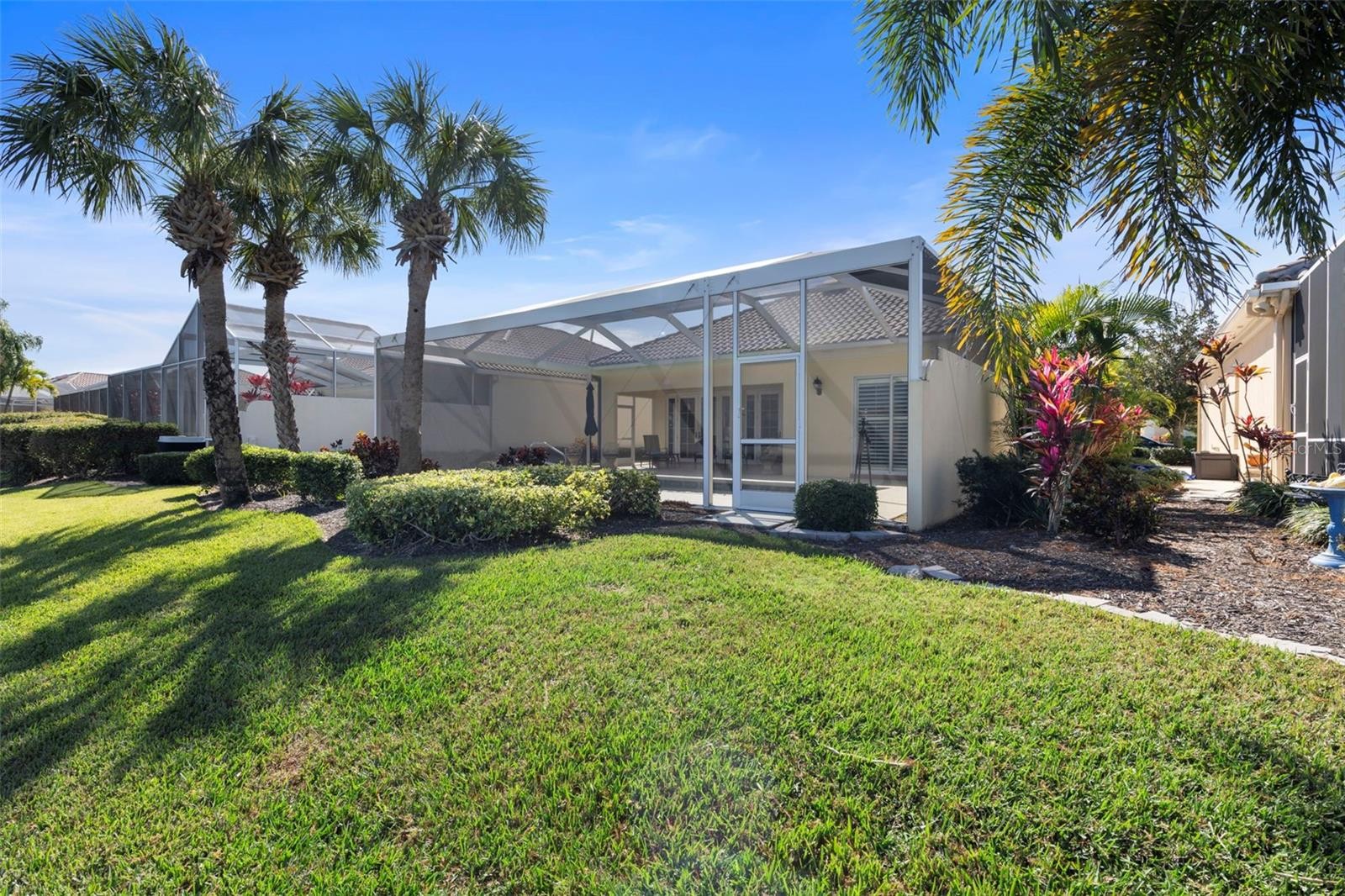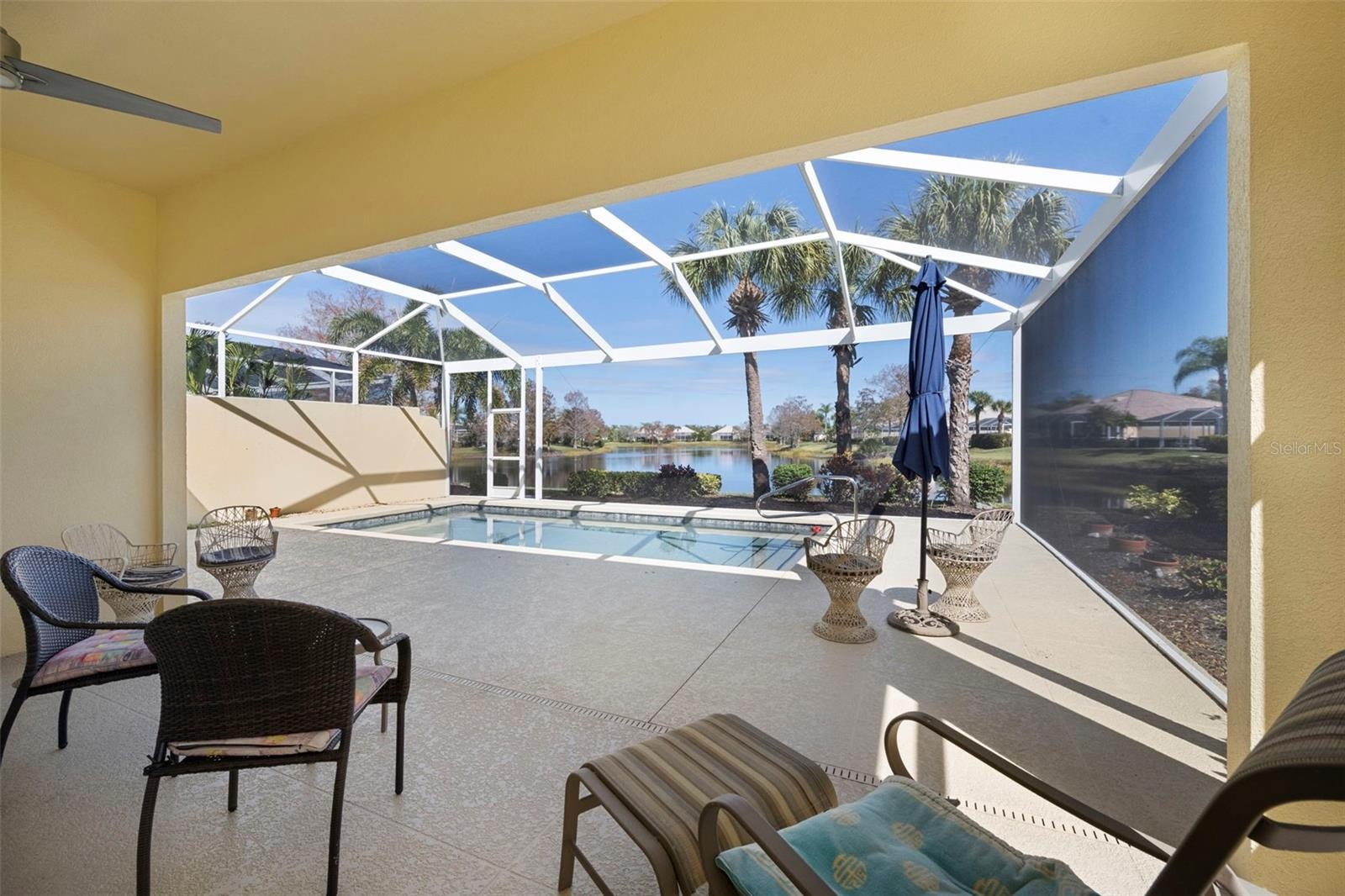 Oakmont Model with Pool & Panoramic Lake Views. Discover the perfect Florida escape in this beautifully maintained Oakmont model, designed for buyers seeking a seasonal or second home with exceptional outdoor living. Enjoy a private resurfaced pool, clear-view lanai enclosure (2019), and sweeping lake views with a charming bridge backdrop—a tranquil setting that feels like a resort yet is easy to lock and leave. Built by DiVosta with poured concrete reinforced construction, this home offers durability, peace of mind, and low-maintenance living. Impact windows and doors add storm protection, while French doors to the lanai invite in natural light and seamless indoor-outdoor flow—perfect for entertaining or relaxing after a day at the beach. The thoughtfully designed floor plan includes three bedrooms, two bathrooms, and a den, ideal for a home office or flex space when hosting guests. Interior upgrades include engineered wood flooring in all bedrooms, a remodeled primary shower, central vacuum, epoxy garage floor, and a well-appointed kitchen with stainless steel appliances, Corian countertops, and a closet pantry. Step outside to the covered lanai and pool area—your private retreat for morning coffee or sunset swims. The clear-view screen preserves the stunning water view while providing year-round comfort. Additional highlights include a/c 2017, resurfaced pool, two guest bedrooms ideal for visiting family, and a den perfect for working remote or hobbies. Whether you’re escaping winter or securing a refined second home, this residence delivers the Florida lifestyle snowbirds seek—sun, water views, privacy, and quality construction in a peaceful setting. VillageWalk provides first-class amenities, including six Har-Tru tennis courts, geothermal heated lagoon and lap pools, pickleball courts, bocce ball, basketball courts, and miles of walking and biking trails. The community clubhouse offers a fitness center, meeting space, and a library. The vibrant Town Center includes a restaurant, hair salon, boutique, gas station, Tiki bar and onsite HOA office. An HOA manager and events coordinator keep the community calendar full of activities for residents. Golf carts are welcome, adding to the ease of navigating this well-planned neighborhood. VillageWalk is close to Publix, the Legacy Bike Trail, Costco, Siesta Key Beach, medical facilities, dining, and more. Don’t miss the opportunity to own this exceptional home in one of Palmer Ranch’s most sought-after communities. Being sold furnished with exclusions.
