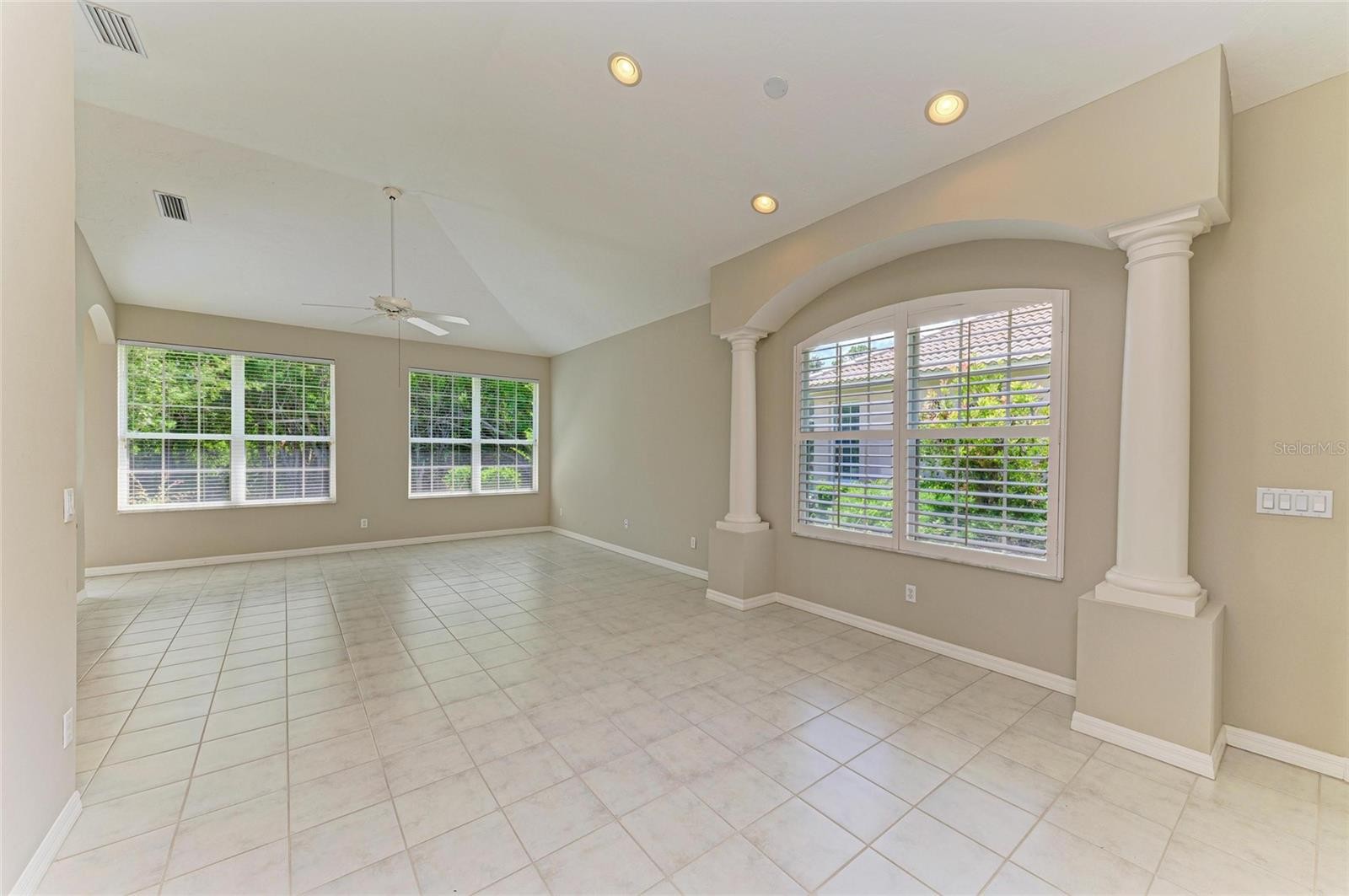 One or more photo(s) has been virtually staged. GREAT OPPORTUNITY TO BE ABLE TO PURCHASE IN THE ESTEEMED NEIGHBORHOOD OF "THE GREENS" WITHIN THE IMG COUNTRY CLUB COMMUNITY. Just reduced for exceptional value. Situated on a choice, deep lot on the cul-du sac with Eastern exposure, this charming home satisfies all the wish list. Pristine interiors are complimented by volume ceilings with recessed lighting, ceiling fans, tile floors, plantation shutters and decorative columns and arches. Updated kitchen with granite counters, tiled backsplash & generous cabinetry with upgraded hardware. A flowing, open plan with split bedroom design....guest bedroom plus a den/study with closet (easily converted to a 3rd BR) on one side with the primary bedroom in the rear enjoying restful views out to the private greenbelt with heavily treed preserve beyond...excellent walk-in closet with lovely bath featuring contemporary double square sinks, separate shower with new shower door and jacuzzi garden tub. This home is value packed with new a/c system (June 2024) PLUS a quality new barrel tile roof (September 2024). For those not wanting the care of a pool....this home has a private rear patio, but is pool free! (with room to add if so desire.) Interior laundry room and two car garage complete the list. The Greens is a very pretty neighborhood of only 43 single family homes with appealing Southern Mediterranean architecture and superior concrete block construction. Surrounded by preserves, lakes and the IMG golf course with sidewalks and garden benches around center lake encouraging nature walks with friends and pets. The ease of maintenance free yard care is included in the low HOA along with cable, Internet and outside water. Moments to golf, close to IMG Sports Academy and an easy zip to our renown Gulf beaches as well as the cultural arts of Sarasota. If you are ready for the Florida lifestyle now - this ideal home is vacant and available for immediate occupancy. Don't suffer through another cold winter when this wonderful, sunny home could be yours! FHA and VA mortgage options.