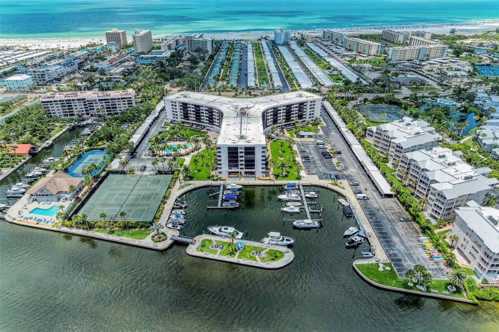 Step into the exclusive waterfront haven of Harbor Towers Yacht and Racquet Club, a true resort paradise that will capture your heart instantly. The building has recently undergone a comprehensive $13 million, four-year hurricane hardening and structural upgrade, completed in 2024. Designed to meet the latest safety standards for hurricane and wind protection, these enhancements include impact-resistant windows and sliding doors—all fully covered by the Seller. Remarkably, the property has sustained NO damage from Helene or Milton. This designer condominium exudes the charm of Hemingway Key West-style living, boasting over $100,000 in upgrades completed in 2024. Every detail reflects quality and elegance: brand-new AC and water heater, stunning engineered red oak wood flooring throughout, granite kitchen countertops with matching full granite backsplash, stainless steel appliances including double ovens, and rich pecan wood cabinets with soft-close doors. Additional refined touches include chair rail accents, plantation shutters, screen-shaded extended living space, and two luxurious Master Suites, both with private ensuites to ensure comfort and privacy for you and your guests. The vistas are equally breathtaking, offering mesmerizing sunrise and moonrise views over the intracoastal waterway. The property offers an array of premium amenities designed for relaxation and recreation. Enjoy two heated swimming pools, a newly renovated fitness center equipped with his-and-her saunas, three Har-Tru tennis courts, and a spacious outdoor BBQ area connected to a fully equipped clubhouse ideal for entertaining. The private marina provides direct access to the intracoastal waterway and features over 40 boat slips available via waitlist at just $3 a foot, plus dedicated storage for kayaks, paddleboards, and bicycles. A tranquil fishing area with a fish-cleaning station and a picturesque Bayfront gazebo situated on a private island further enhances the resort experience. Harbor Towers also represents an excellent investment opportunity with flexible two-week rental options. Whether you choose to utilize the onsite property management office or manage rentals independently, this community adapts seamlessly to your needs. Its prime location allows for easy access to the world-renowned Siesta Key Beach—just a short walk away—or a quick ride on the Siesta Key free trolley to the Village, where exceptional dining, boutique shopping, and live entertainment await. Offering an ideal blend of luxury and practicality, Harbor Towers is perfect whether you're seeking a permanent residence, a vacation retreat, or an income-generating property. This resort-style community truly delivers the best of coastal living.