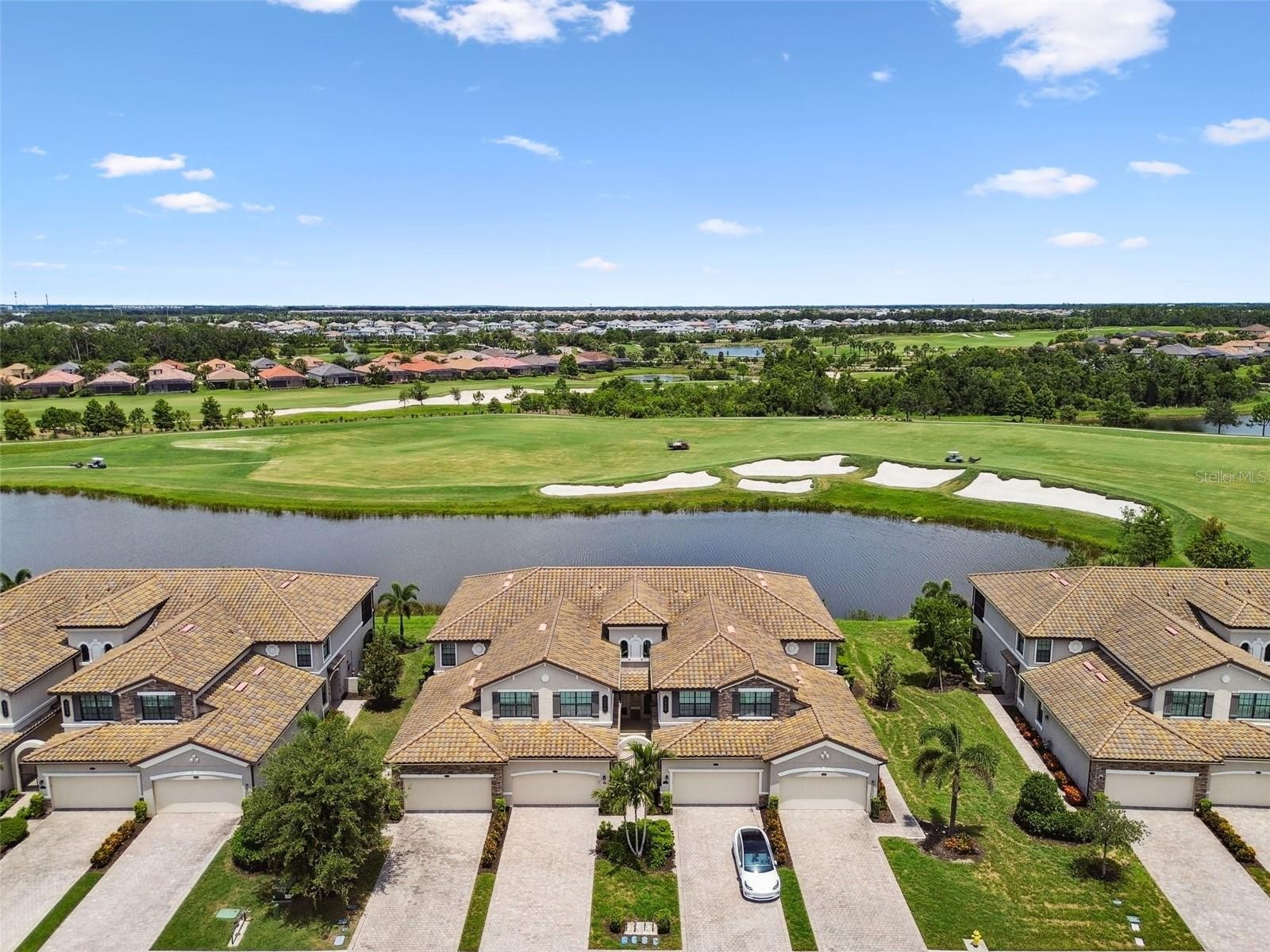 This beautiful end-unit Coach home offers breathtaking views of the 18th fairway at LakeWood National Golf and Country Club. Imagine a life of leisure and convenience within this stunning golf and country club community. This maintenance-free home features crown molding, 3 bedrooms, 2 bathrooms, 2 car garage, impact windows/slider, and provides a spacious open floor plan with elegant tile flooring in the main living areas. The upgraded kitchen, complete with a large center island, is perfect for entertaining. You'll also appreciate the upgraded neutral-toned laminate flooring in the bedrooms, designed with modern living in mind. The oversized primary suite is a true retreat, offering picturesque lake and golf views and direct access to the lanai complete with new flooring – the perfect spot to unwind. Residents of Lakewood National enjoy the added security of a 24-hour manned gate, and a vibrant social scene with numerous events and activities. The resort-style amenities are exceptional, including multiple swimming pools, a tiki bar, tennis and pickleball courts, a fitness center, bocce ball, and conference and event spaces. This is a truly remarkable opportunity to embrace a luxurious lifestyle in the lush natural beauty of Lakewood National Golf and Country Club. Dishwasher and Washer 2024, new paint interior.