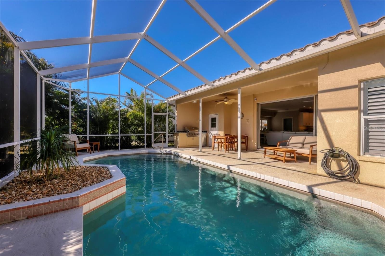 Love to Garden? Seeking an Outdoor Kitchen and Pool Bath? Want a Heated Pool with privacy? 5956 Rachele has been transformed with thoughtful renovations inside and out. Kirkplan Kitchens, a locally renowned general contractor, beautifully designed an open space concept in the heart of the home. All bathrooms (two and a half) have been tastefully renovated. The outdoor kitchen has been redesigned with a quartz countertop, a state-of-the-art grill, and a refrigerator for entertaining. The Primary bathroom includes an oversized walk-in shower, dual sinks, and built-in storage. You’ll have Peace of Mind knowing a new HVAC system and new garage door have been installed. The 2019 barreled-tiled roof, known for its longevity, also adds aesthetic appeal. At night, hard-wired landscape lights illuminate the redesigned gardens surrounding the home, creating a cozy ambiance as you sit on your lanai. Take a moment out of your busy day to sit outside under the “Old Oak tree” that shades the nearly quarter-acre yard. There are so many details to mention, like the Plantation Shutters, the Sliding doors that pocket back, and the way they blend the living area with the pool lanai. It's best to schedule a showing to see and embrace all the modernized architectural and maintenance details now part of this lovely home. Kindly note that the home is sold furnished, including televisions, new mattresses, bedding, outdoor furniture, and garage shelves, as depicted in the photos. For those unfamiliar, 5956 Rachele is nestled within the Longwood Run community, known for its preserves, lakes, low HOA fees, and no CDD fees—a true Sarasota County neighborhood located just south of the county line (aka University Parkway). The location is stellar—high walkability to Longwood Park with its playgrounds, basketball, tennis, and pickleball courts. Longwood Run is off the beaten path of University Parkway, yet within easy reach of the University corridor shopping mecca, local restaurants, schools, recreation activities, and medical resources, all within less than 2 miles. Local beaches and the Sarasota-Bradenton International Airport are each about a 20-minute drive. Neighbors say, “I love the location”, “the Sidewalks,” and the Nature Preserves. Call for your private showing today!