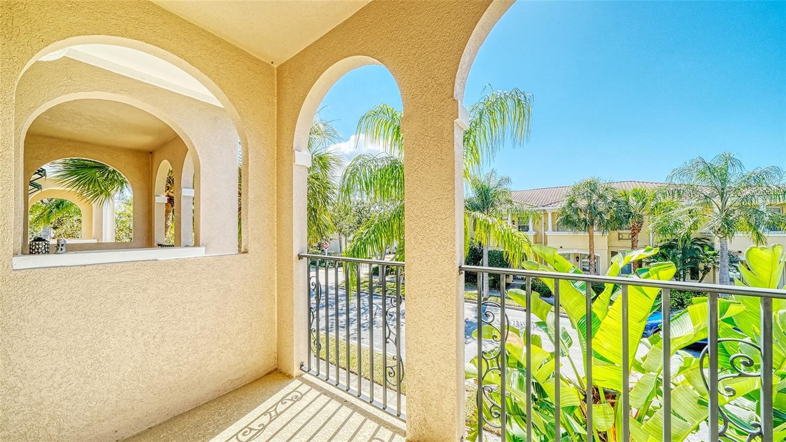 Welcome to San Palermo in Sarasota! This is a coveted DiVosta poured concrete prized community. That's right! Solid concrete poured walls for your comfort, quiet, and strength! Beautiful landscape surrounds everything with a tropical feel enveloping the communiy and the pool. This home offers a private gated entry, dramatic hardwood floors in the great room, a bright kitchen with neutral corian counters, and pocket doors to the laundry, guest bath, and back door. Primary bedroom upstairs is ensuite and includes an owner's private balcony, walk-in closet and even another closet. Bedroom 2 has walk-in closet with organizer and Bedroom 3 has a huge closet with organizer. Double linen closet upstairs. One-car garage complete with Tesla speedy E-Charger, Utility & storage Pantry off kitchen with Central Vacuum. Wired for security. Convenient Location minutes from UTC, loads of restaurants and activities, Benderson Rowing facility, Downtown Sarasota, St. Armands, Lido Beach, and easy access to I-75. Kitchen is also nicely equipped with new microwave (2026) and disposal (2026). Other recent updates include permanent hurricane shutters for storm preparedness ease (2025) Air handler (2018), Water Heater (2025) laundry appliances (2023) Smoke alarm (2025). Recent Exterior paint. This is THE ONE! Hurry today...Your personal touches will make this a dreamy home to enjoy with ease.