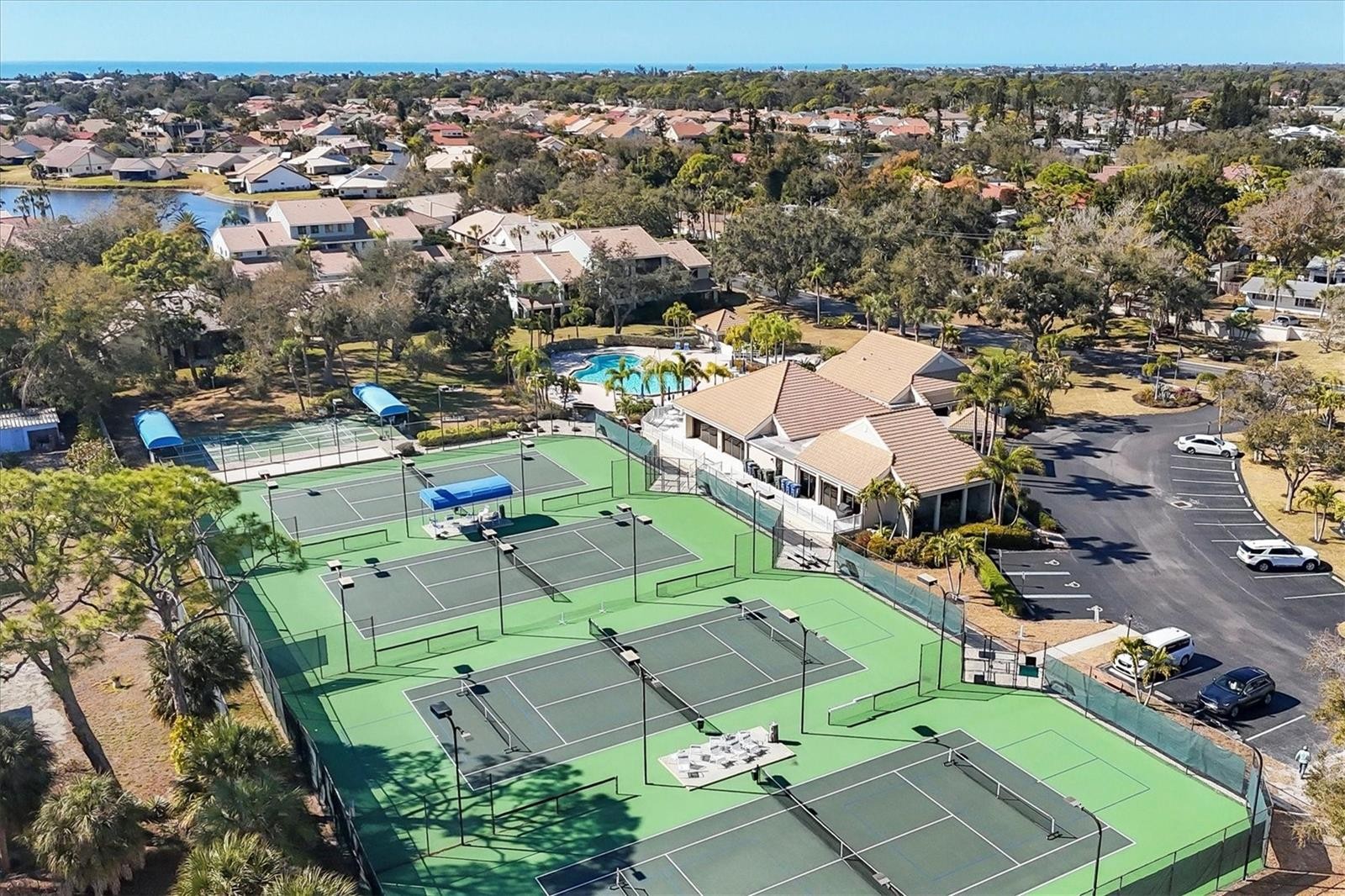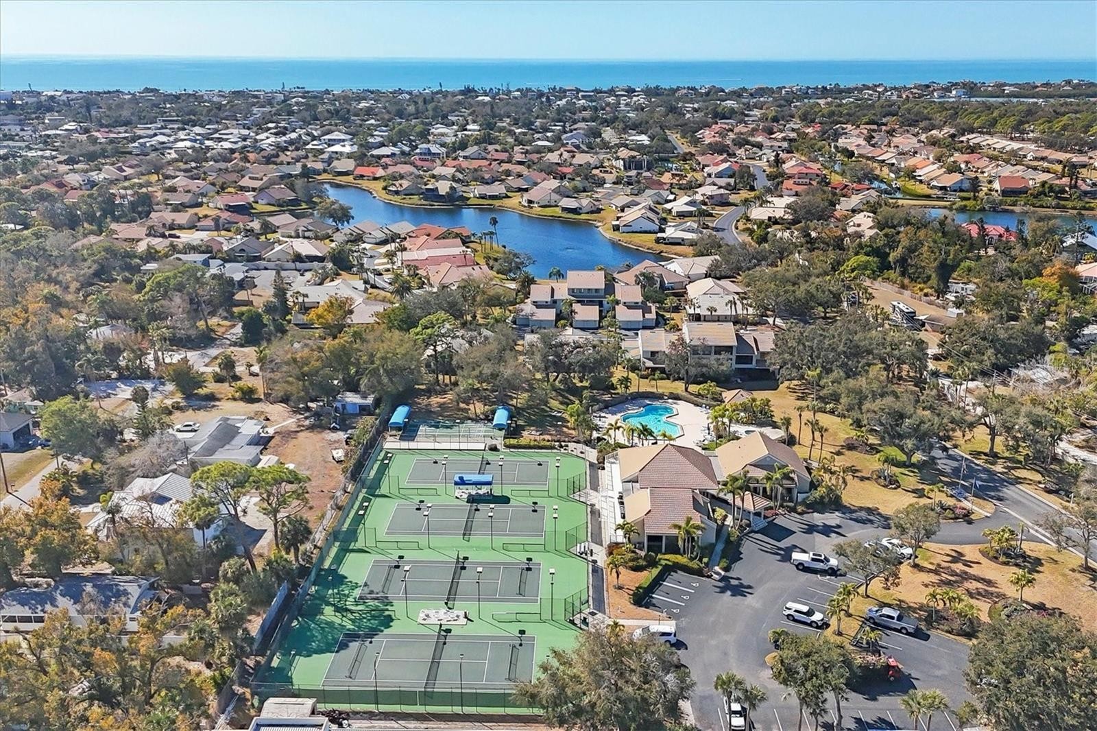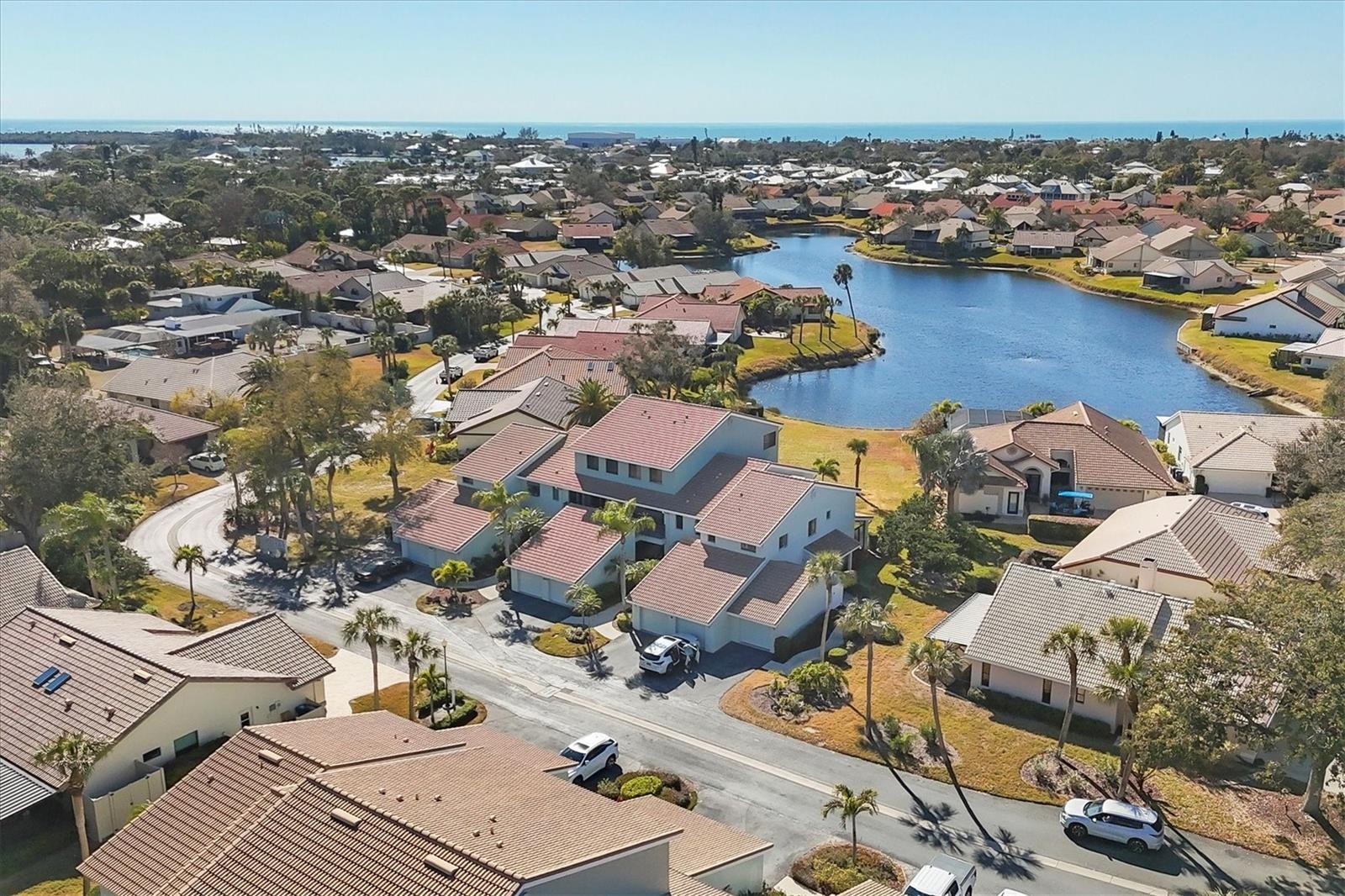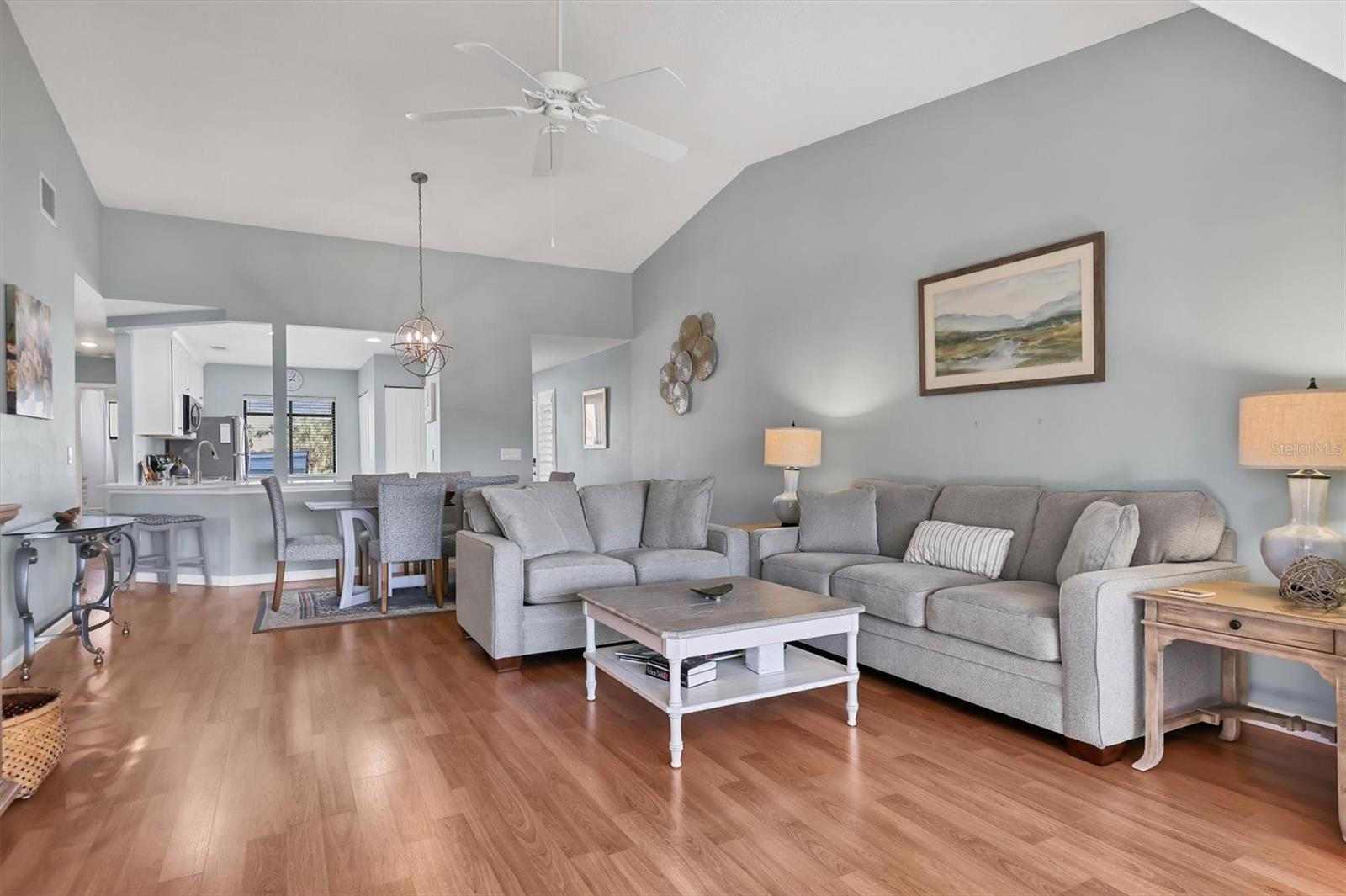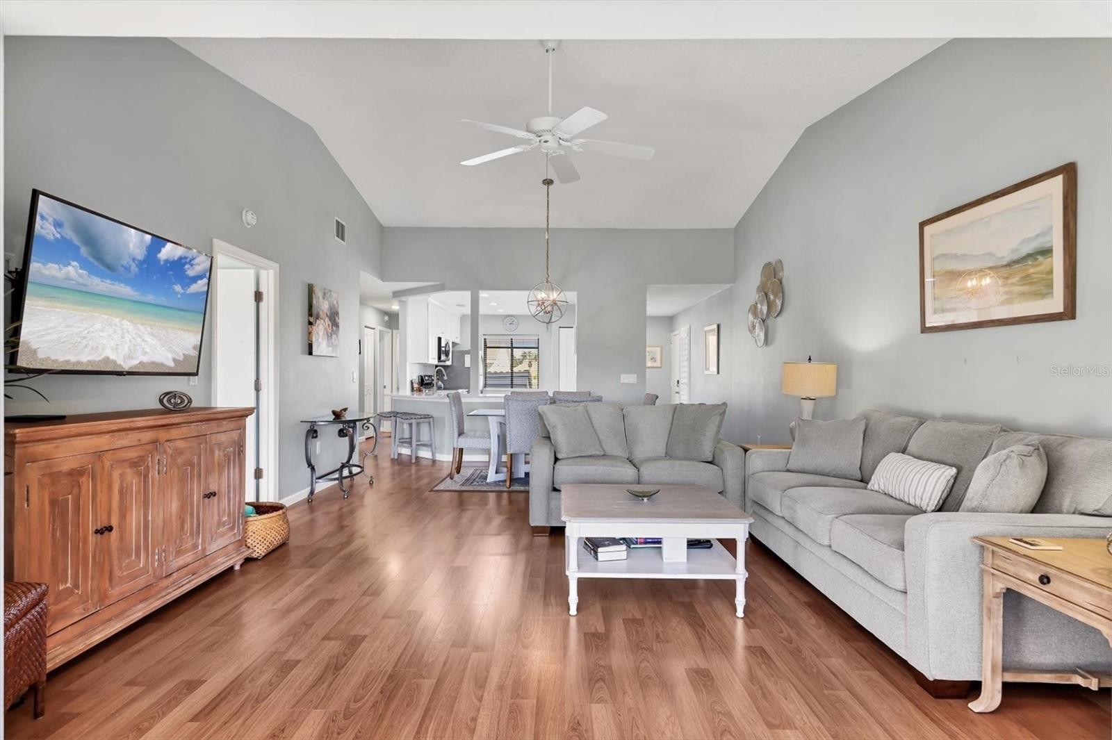 An exceptional opportunity in The Inlets for those seeking space, views, and convenience. Ideally positioned near the clubhouse for effortless access to community amenities, this spacious three-bedroom, two-bath residence lives large and includes a detached one-car garage for added storage and flexibility. Thoughtfully updated with a cohesive neutral palette, the interior showcases warm wood laminate flooring, an open-concept kitchen with white shaker cabinetry, quartz countertops, and a well-designed layout that blends style and function. The beautifully renovated baths echo the same timeless finishes. The open living and dining areas are designed for comfortable everyday living and effortless entertaining, seamlessly extending to the generous screened lanai where you can enjoy sweeping pond views and breathtaking sunsets. The primary suite offers a true retreat, featuring high ceilings and oversized windows with long water views. The en-suite bath is tastefully updated with quartz counters, a stunning neutral-toned shower, and a private water closet. Guest bedrooms are thoughtfully separated for maximum privacy and share a well-appointed updated bath. Plantation shutters throughout further enhance the clean, elevated aesthetic of the home. Relax on your spacious lanai with morning coffee or dine al fresco while taking in tranquil pond vistas and colorful evening skies. Residents of The Inlets enjoy an array of amenities including pickleball and tennis courts, heated pool and spa, fitness center, shuffleboard, bocce, and more. All of this is just minutes from dining, shopping, the charm of downtown Venice, and a short drive to Nokomis Beach.