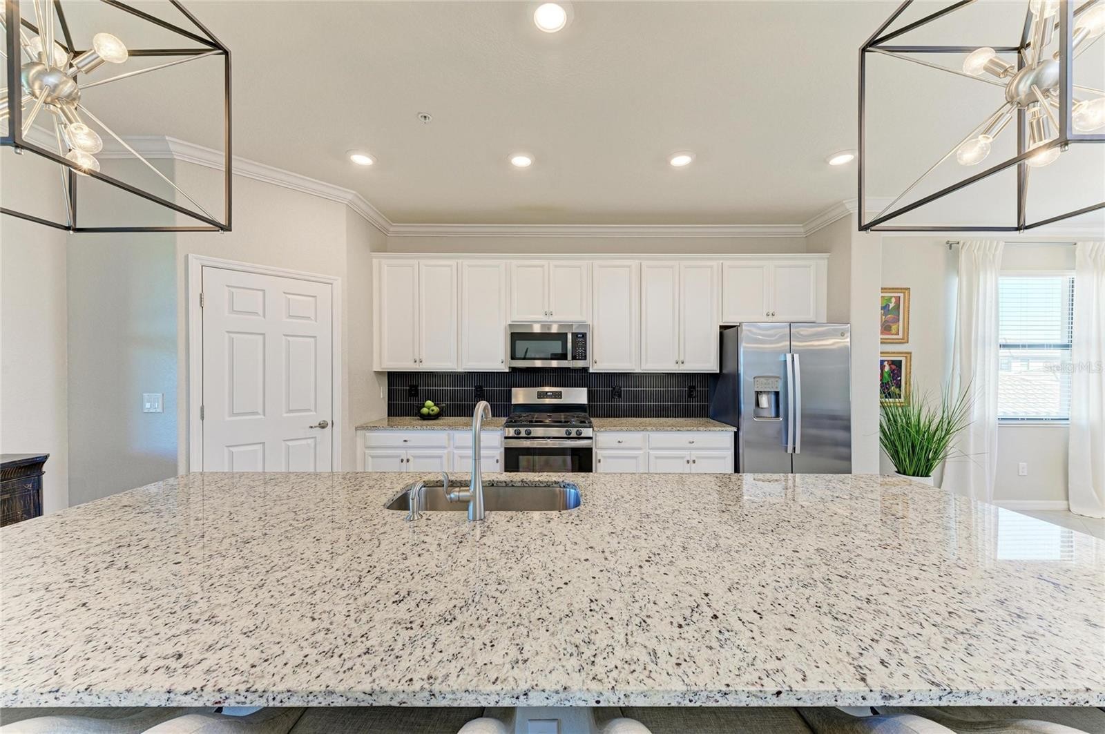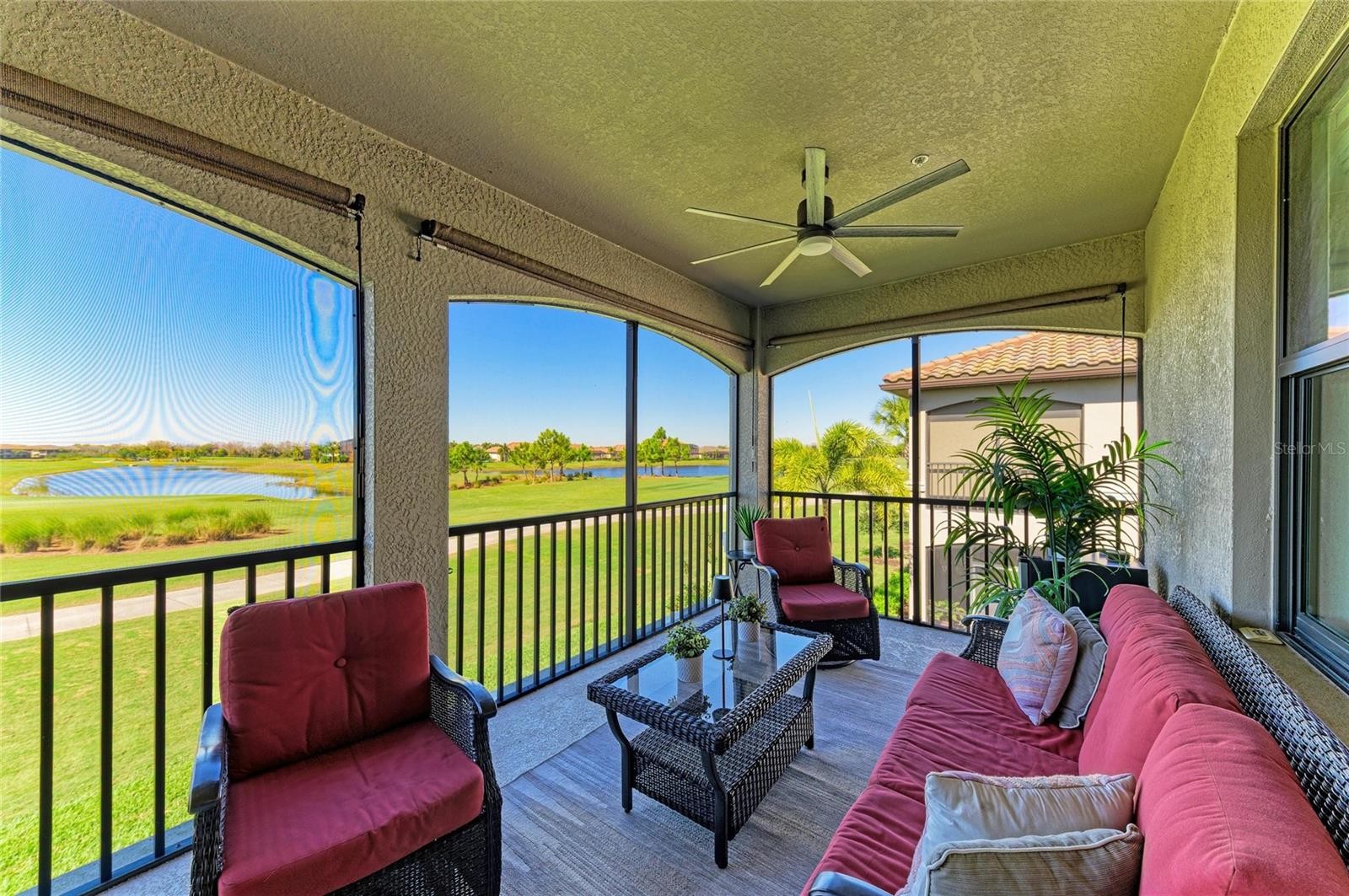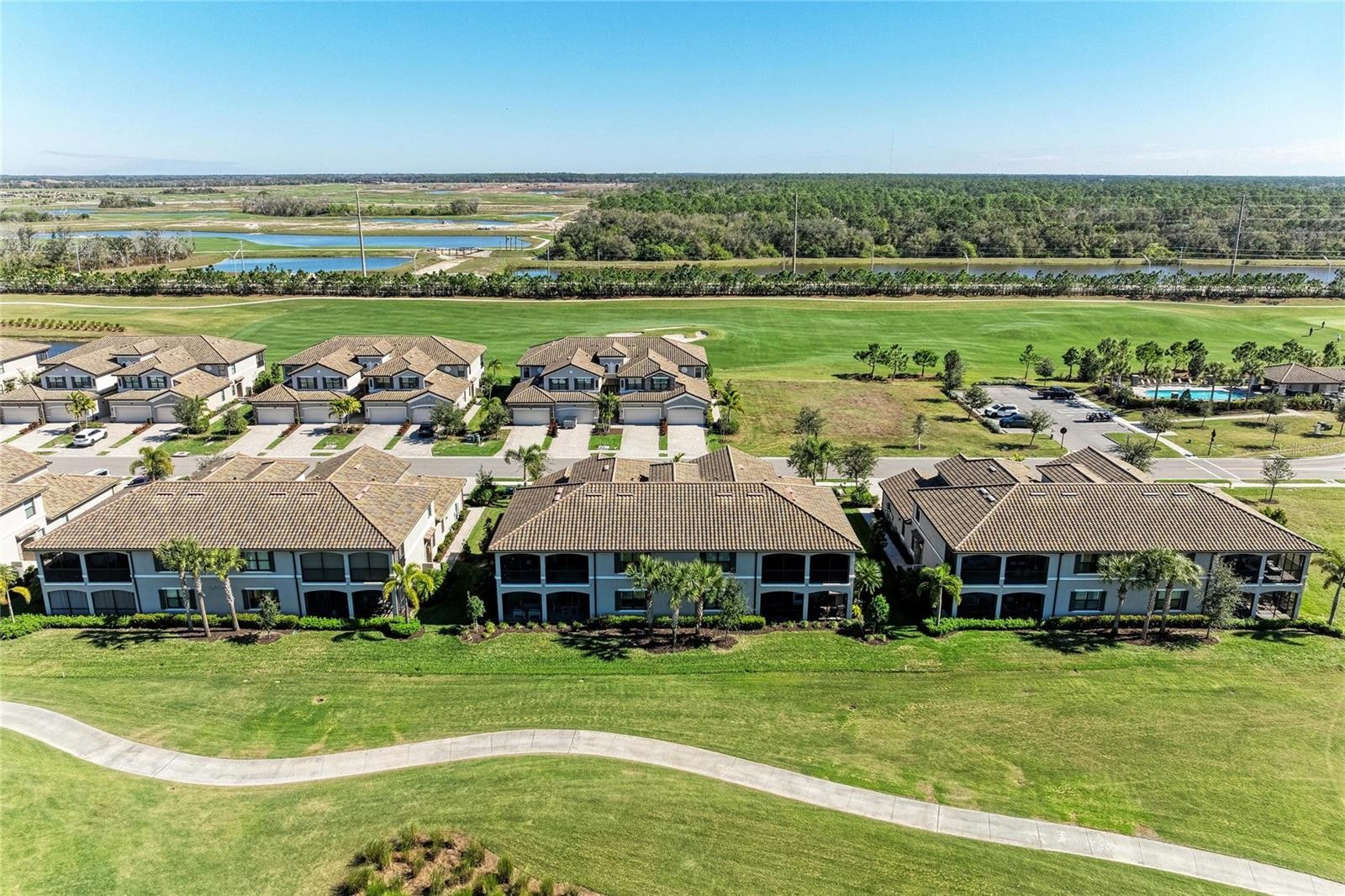 This distinct upstairs Bay Creek coach home offers a rare vantage point, showcasing uninterrupted west-facing views over the golf course and lake from an expansive screened lanai. Designed to maximize natural light and frame dramatic sunset vistas, the elevated setting delivers a private and serene backdrop rarely found in comparable homes. Thoughtfully appointed throughout, the residence features quality flooring in all bedrooms, a grass-cloth accent wall, full-length custom drapery, and designer lighting and ceiling fans. The gourmet kitchen includes stainless steel appliances, a contemporary tile backsplash, an oversized center island, a walk-in pantry, and there is a large under-stair storage closet unique to this model. The spacious primary suite enjoys sweeping golf and water views, with an en-suite bath that includes dual vanities, a walk-in shower and double walk-in closets. Two additional bedrooms and a full guest bath provide flexible living or workspace options. Impact-rated windows and sliding doors ensure comfort and security year-round.Ownership includes a deeded membership to 36 holes of Arnold Palmer-designed championship golf. The Commander Course has been named Golf Advisor’s top Golfers’ Choice and No. 1 Top Course in Florida. Additional amenities include a zero-entry heated pool with lap lanes and waterfalls, a poolside tiki bar and café, a fitness center with group classes, a full-service spa, eight lighted Har-Tru tennis courts, pickleball, bocce and multiple satellite pools. The 28,000-square-foot clubhouse features fine and casual dining, a full bar and lounge, locker rooms and event spaces. A full-time lifestyle director oversees programming that includes live music, wine dinners, holiday events and more. Lakewood National Golf Club is also annual host of the Korn Ferry Tour’s LECOM Suncoast Classic. This residence offers a combination of lifestyle, location and exclusive club amenities within one of the region’s sought-after gated communities.