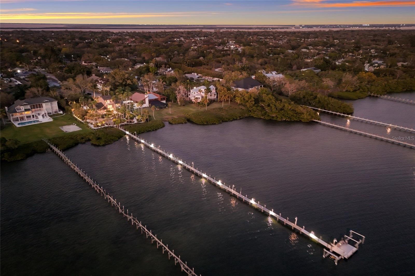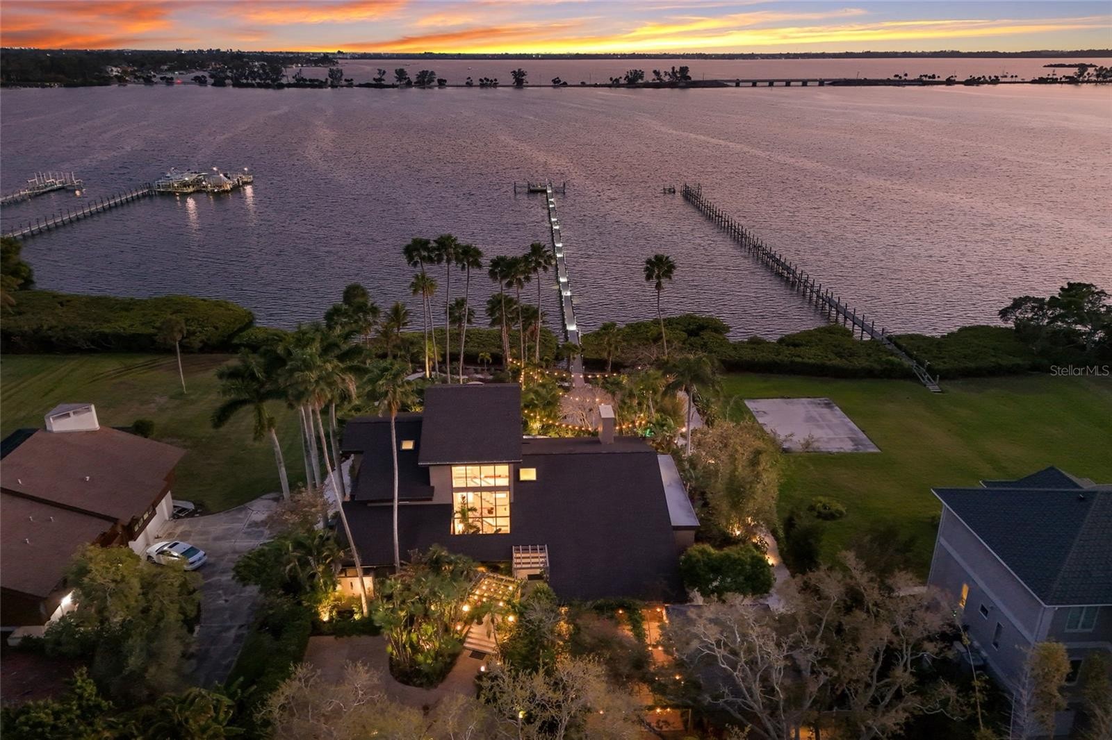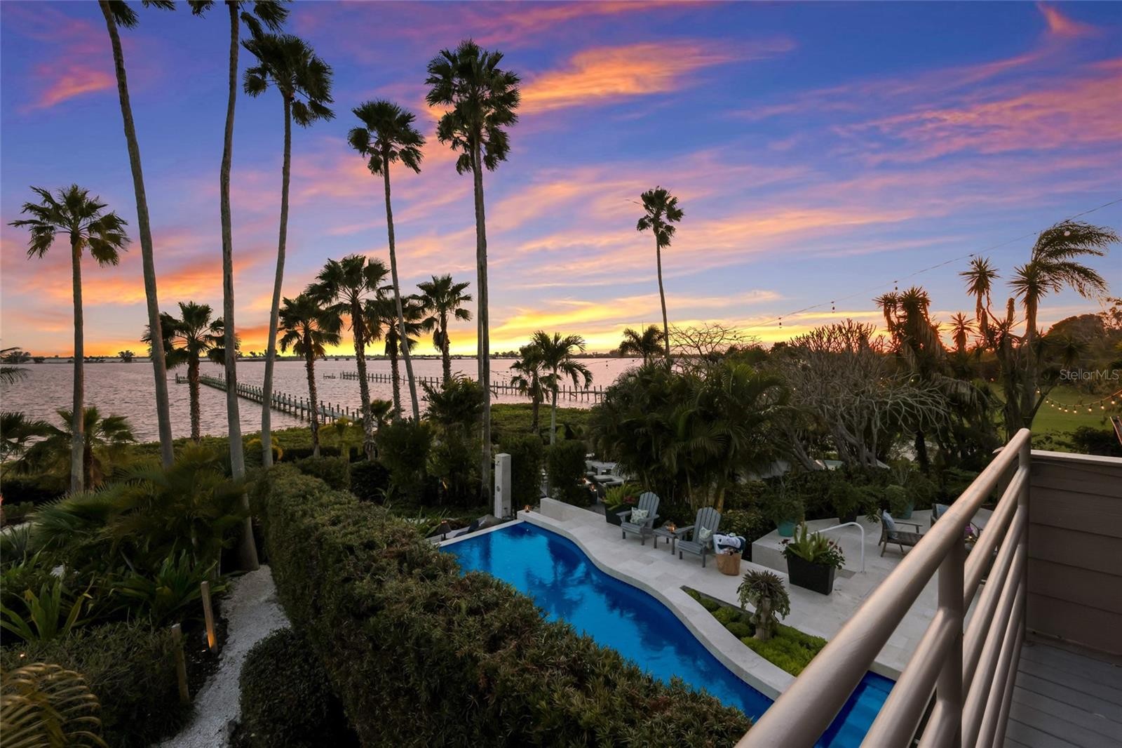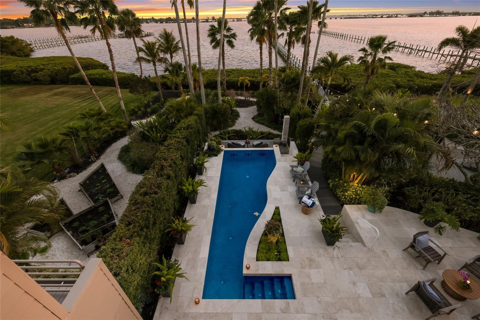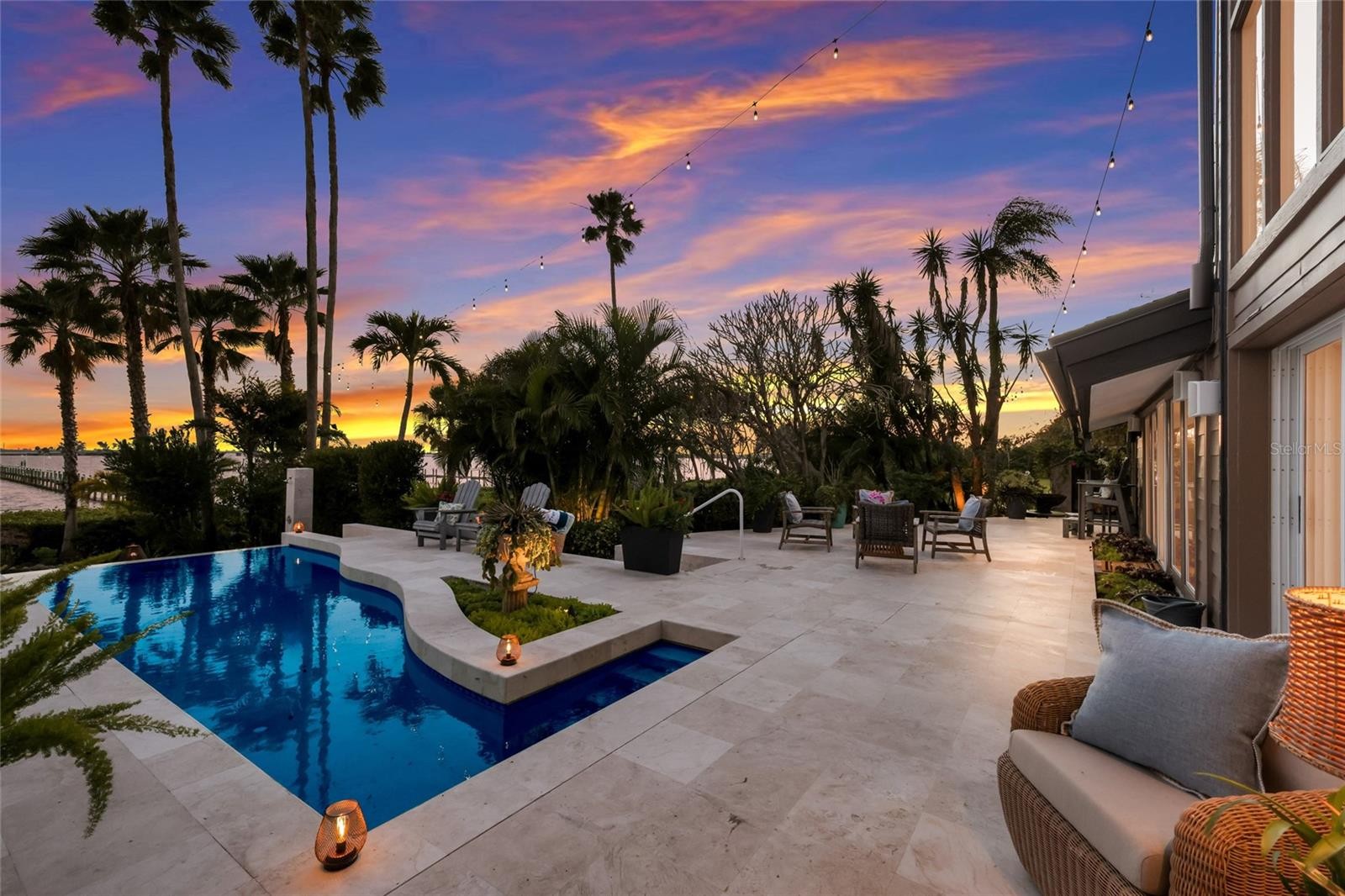 Overlooking Palma Sola Bay, this remarkable 5BD/4.5BA waterfront estate captures the essence of relaxed coastal luxury, where lush tropical landscaping, thoughtful architecture, and breathtaking sunset views come together across a truly unforgettable property. A winding circular drive welcomes you through beautifully illuminated gardens, leading to a charming pathway that crosses a serene koi pond before arriving at the front entrance, immediately setting the tone for the private retreat that awaits. Inside, travertine tile floors and soaring ceilings create a dramatic sense of openness, while expansive windows frame sweeping views of the bay and fill the home with natural light. The stunning great room makes an unforgettable first impression with its impressive ceiling height, elegant dining space, and striking wall of windows that perfectly frame the water and evening sunsets beyond the palms. Designed for both entertaining and everyday comfort, this central gathering space flows effortlessly into the living room anchored by a wood burning fireplace, creating a warm and inviting setting for conversation and relaxation while maintaining a seamless connection to the outdoors. Just beyond, the expansive chef’s kitchen is thoughtfully designed with extensive custom cabinetry, abundant prep space, and a large island ideal for casual dining and gathering. Distinctive copper sinks add warmth and character, while high end appliances and an open layout allow the kitchen to remain connected to both the great room and living areas, making it perfect for hosting friends and family. A dedicated wine cellar adds another level of sophistication for collectors and entertainers alike. Upstairs, the primary suite offers a peaceful sanctuary with private balcony access overlooking the bay. The third floor offers an additional guest suite that could also be ideal for a game/tv room or an artists retreat and features its own private balcony, creating another inviting space to enjoy the coastal breezes and water views. Outdoors, the property transforms into a private tropical retreat where expansive travertine terraces surround a beautiful pool and spa, creating multiple spaces for lounging, dining, and entertaining beneath the swaying palms. An outdoor grill area with covered seating make gatherings effortless, while winding garden paths lead to additional waterfront escapes including a fire pit lounge, tiki bar, and a tranquil spa nestled among lush landscaping. A lighted private dock extends into Palma Sola Bay, creating easy access for boating enthusiasts with direct access to the ICW and sparkling gulf waters. Just relaxing on the dock at the end of the day with a glass of wine watching the wildlife really captures the essence of this waterfront retreat. Do you enjoy entertaining? This home has had the honor of hosting many special events including weddings and amazing family gatherings. Countless memories have been created here and now it is your turn to create your own. Completing the package are raised garden beds, both an attached two car garage and a separate detached garage-perfect for a workshop, providing ample space for vehicles, storage, hobbies, or recreational equipment. With enchanting gardens, resort style outdoor living, and spectacular bay front scenery in every direction, this extraordinary property offers a rare opportunity to experience the very best of Florida waterfront living.