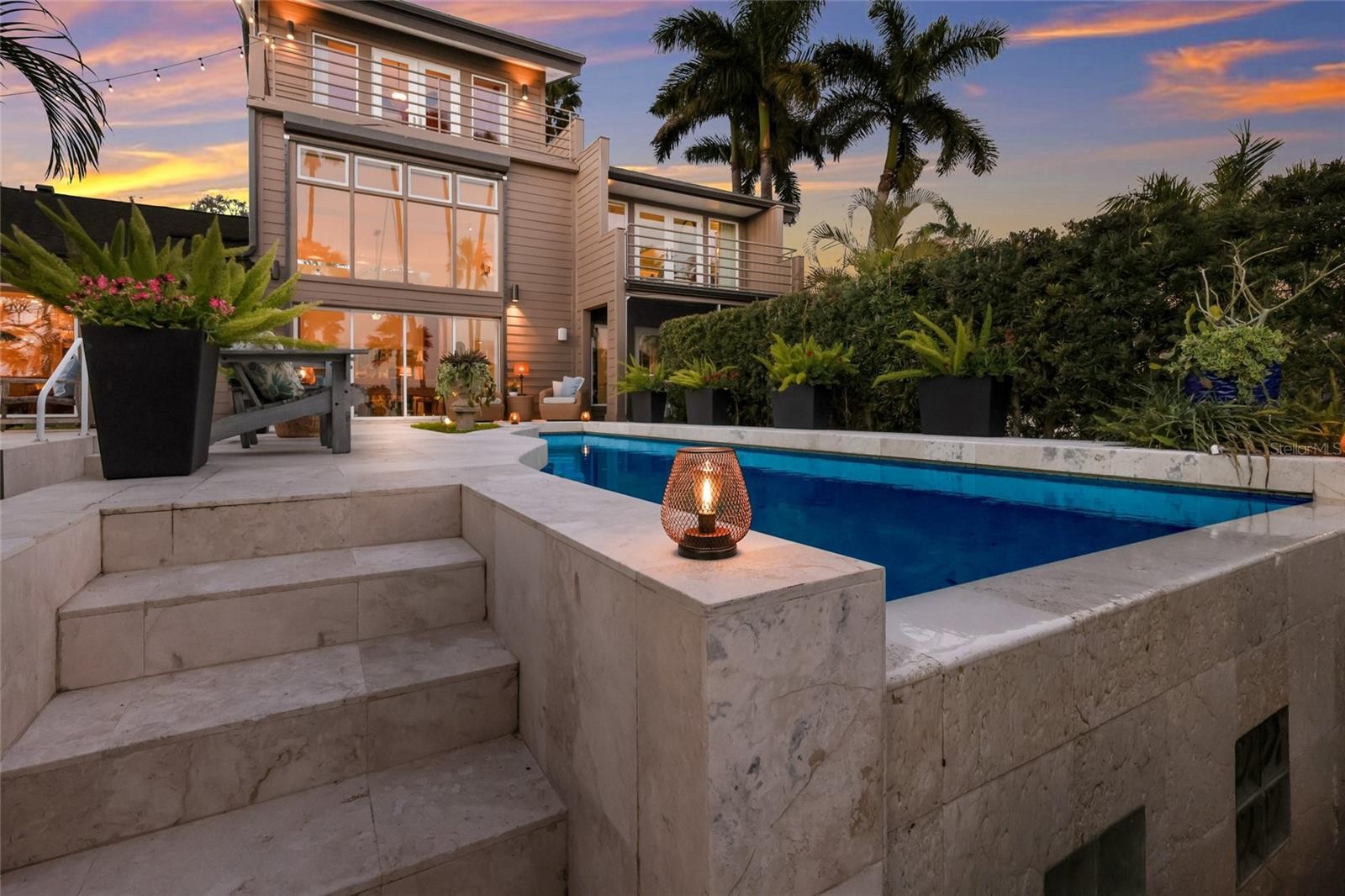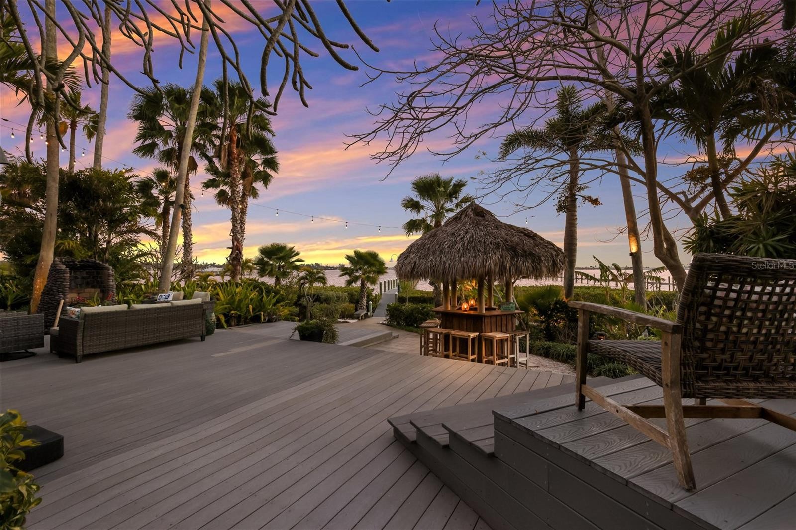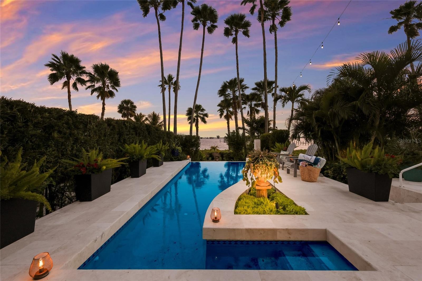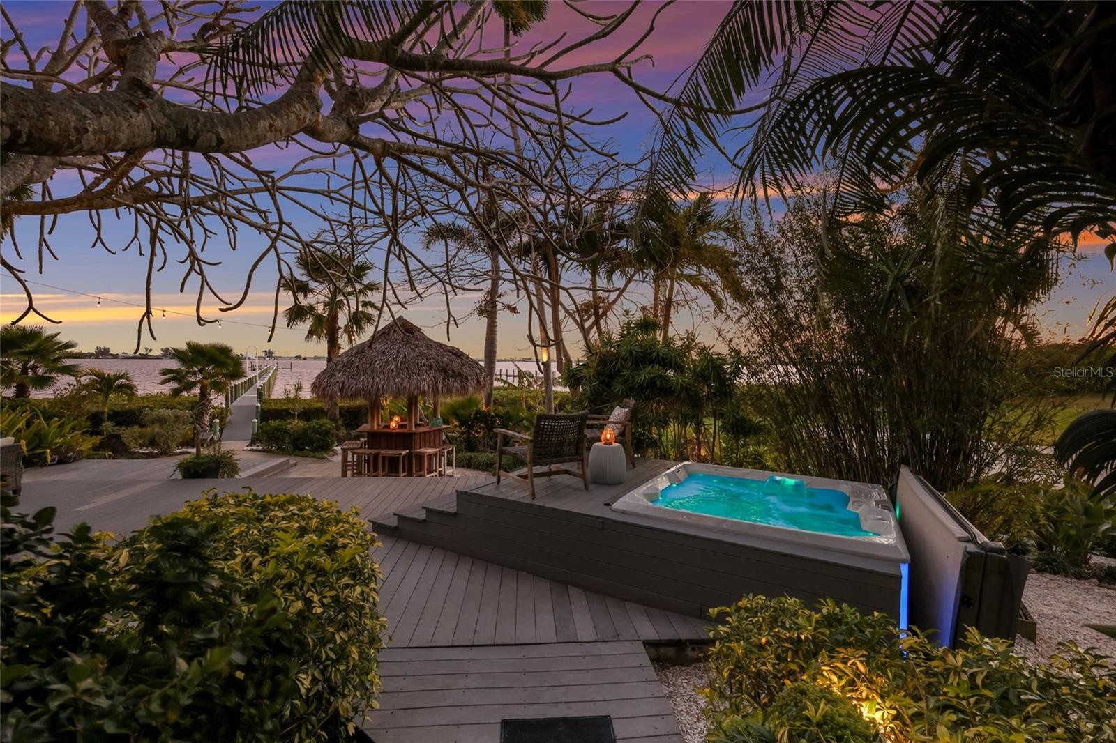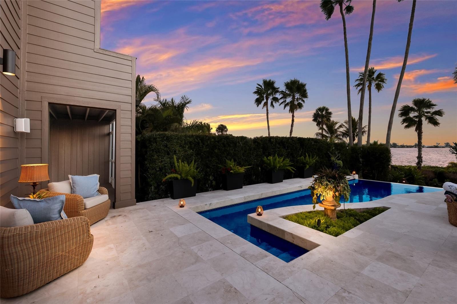 Overlooking Palma Sola Bay, this remarkable 5BD/4.5BA waterfront estate captures the essence of relaxed coastal luxury, where lush tropical landscaping, thoughtful architecture, and breathtaking sunset views come together across a truly unforgettable property. A winding circular drive welcomes you through beautifully illuminated gardens, leading to a charming pathway that crosses a serene koi pond before arriving at the front entrance, immediately setting the tone for the private retreat that awaits. Inside, travertine tile floors and soaring ceilings create a dramatic sense of openness, while expansive windows frame sweeping views of the bay and fill the home with natural light. The stunning great room makes an unforgettable first impression with its impressive ceiling height, elegant dining space, and striking wall of windows that perfectly frame the water and evening sunsets beyond the palms. Designed for both entertaining and everyday comfort, this central gathering space flows effortlessly into the living room anchored by a wood burning fireplace, creating a warm and inviting setting for conversation and relaxation while maintaining a seamless connection to the outdoors. Just beyond, the expansive chef’s kitchen is thoughtfully designed with extensive custom cabinetry, abundant prep space, and a large island ideal for casual dining and gathering. Distinctive copper sinks add warmth and character, while high end appliances and an open layout allow the kitchen to remain connected to both the great room and living areas, making it perfect for hosting friends and family. A dedicated wine cellar adds another level of sophistication for collectors and entertainers alike. Upstairs, the primary suite offers a peaceful sanctuary with private balcony access overlooking the bay. The third floor offers an additional guest suite that could also be ideal for a game/tv room or an artists retreat and features its own private balcony, creating another inviting space to enjoy the coastal breezes and water views. Outdoors, the property transforms into a private tropical retreat where expansive travertine terraces surround a beautiful pool and spa, creating multiple spaces for lounging, dining, and entertaining beneath the swaying palms. An outdoor grill area with covered seating make gatherings effortless, while winding garden paths lead to additional waterfront escapes including a fire pit lounge, tiki bar, and a tranquil spa nestled among lush landscaping. A lighted private dock extends into Palma Sola Bay, creating easy access for boating enthusiasts with direct access to the ICW and sparkling gulf waters. Just relaxing on the dock at the end of the day with a glass of wine watching the wildlife really captures the essence of this waterfront retreat. Do you enjoy entertaining? This home has had the honor of hosting many special events including weddings and amazing family gatherings. Countless memories have been created here and now it is your turn to create your own. Completing the package are raised garden beds, both an attached two car garage and a separate detached garage-perfect for a workshop, providing ample space for vehicles, storage, hobbies, or recreational equipment. With enchanting gardens, resort style outdoor living, and spectacular bay front scenery in every direction, this extraordinary property offers a rare opportunity to experience the very best of Florida waterfront living.